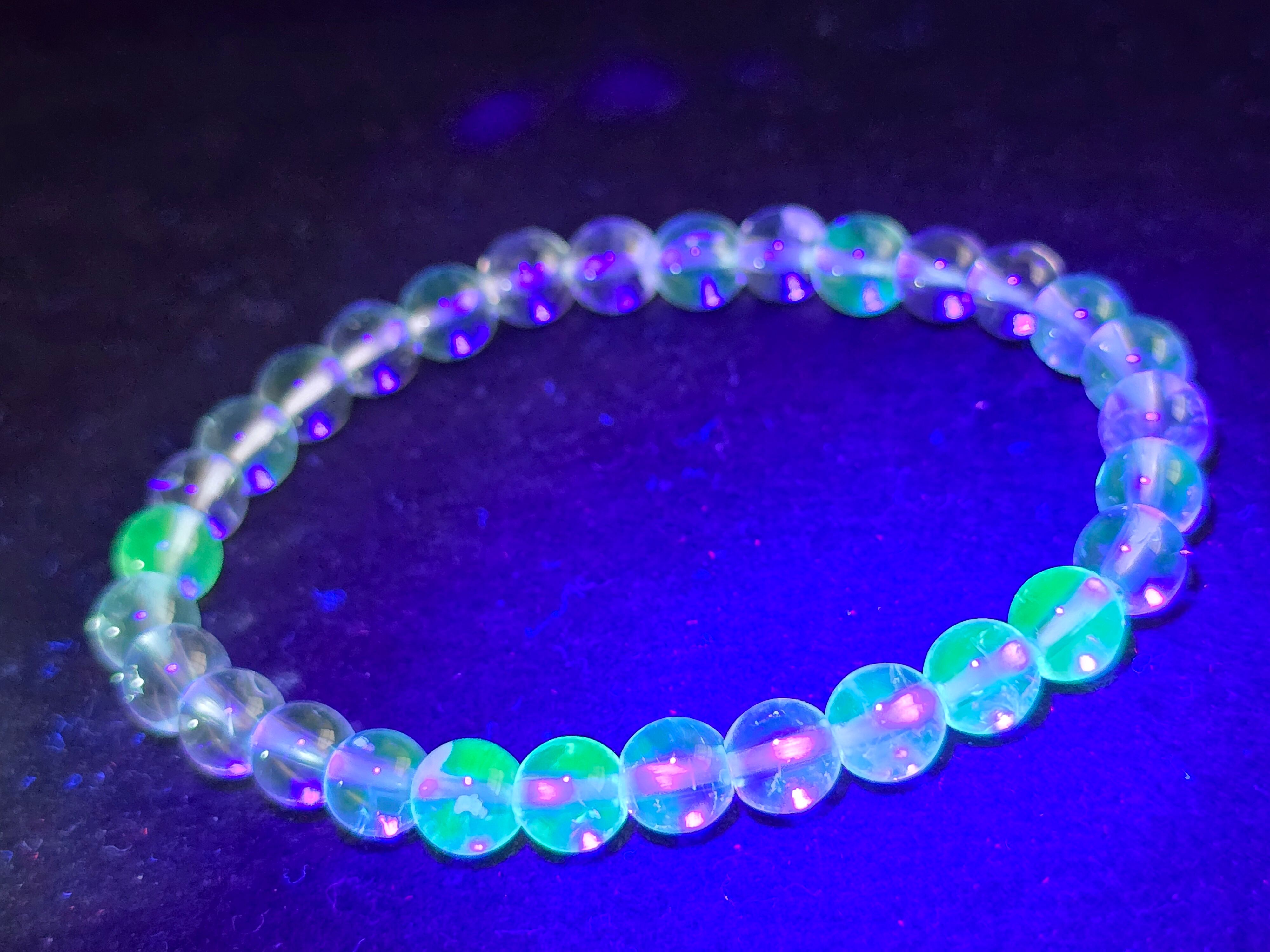 オパールの一種で、母岩の上に水滴が付いた様に、微細な球状シリカの集合した物で、その見た目から玉滴石と呼ばれています。結晶に微量のウランを含んでいる為、紫外線長波で強くウラン特有の黄緑色に蛍光します。弱いUVライトでも光るので見て楽しめる標本です。ハイアライトは直感力を高める効果があると言われています。