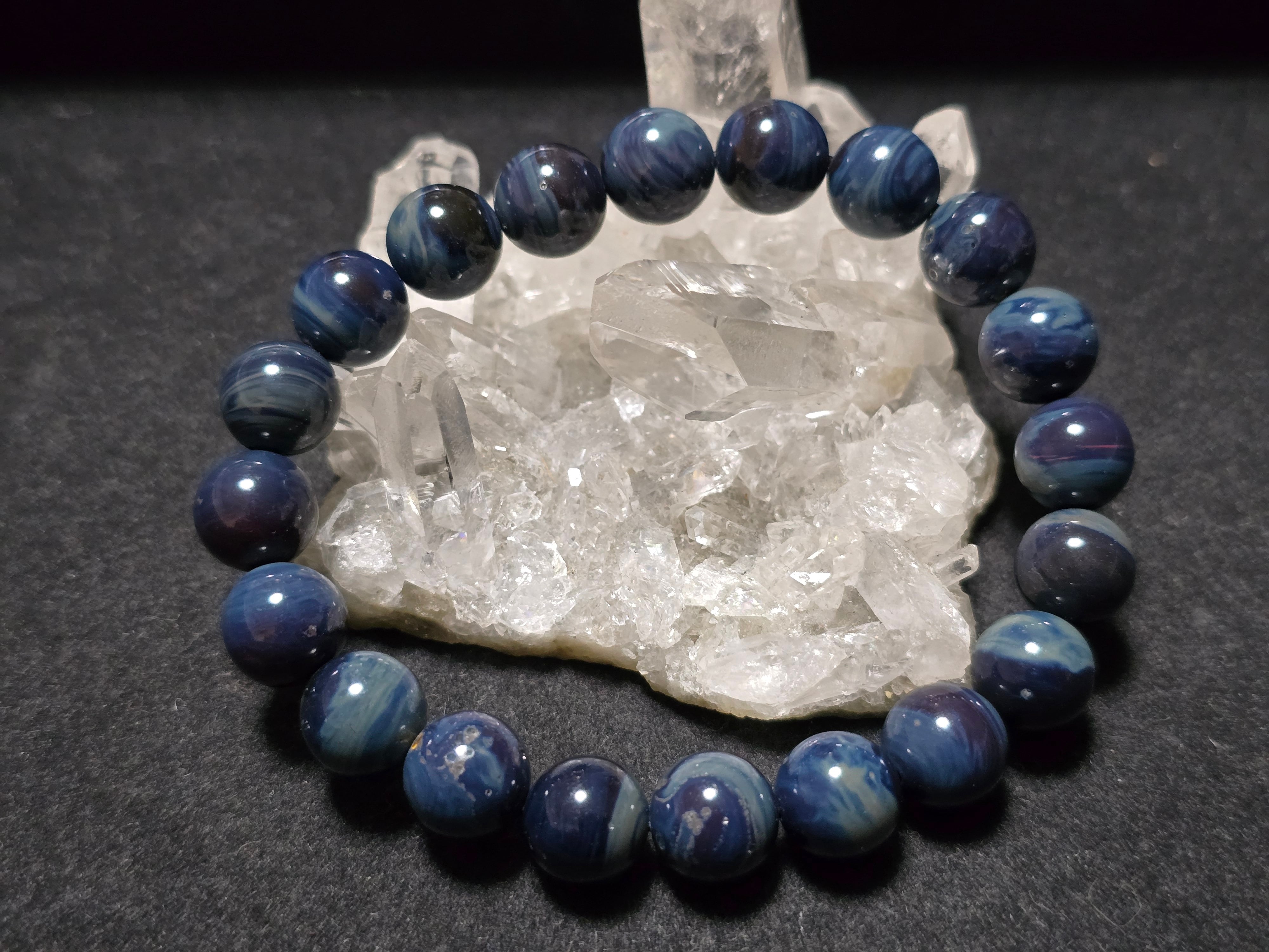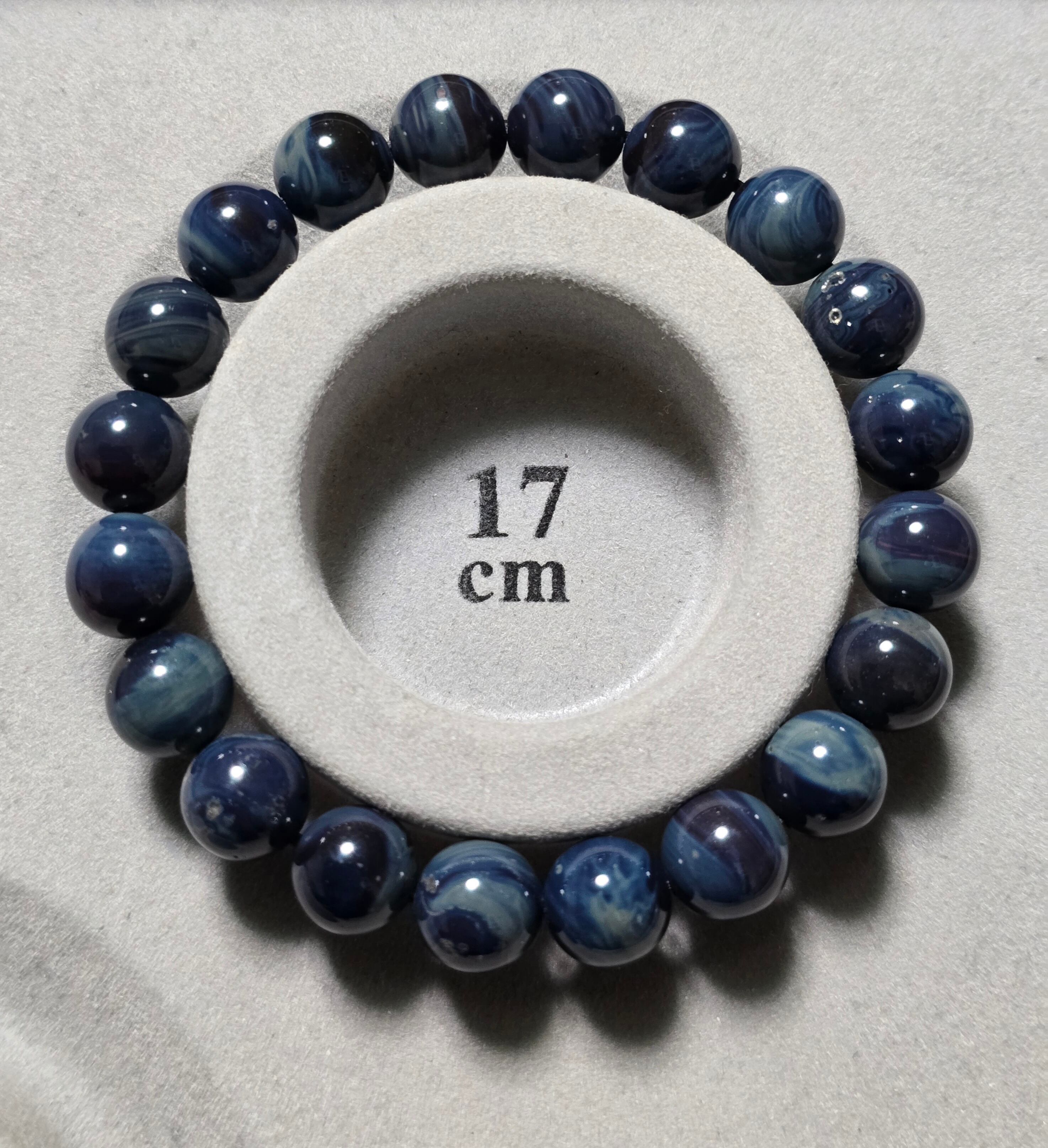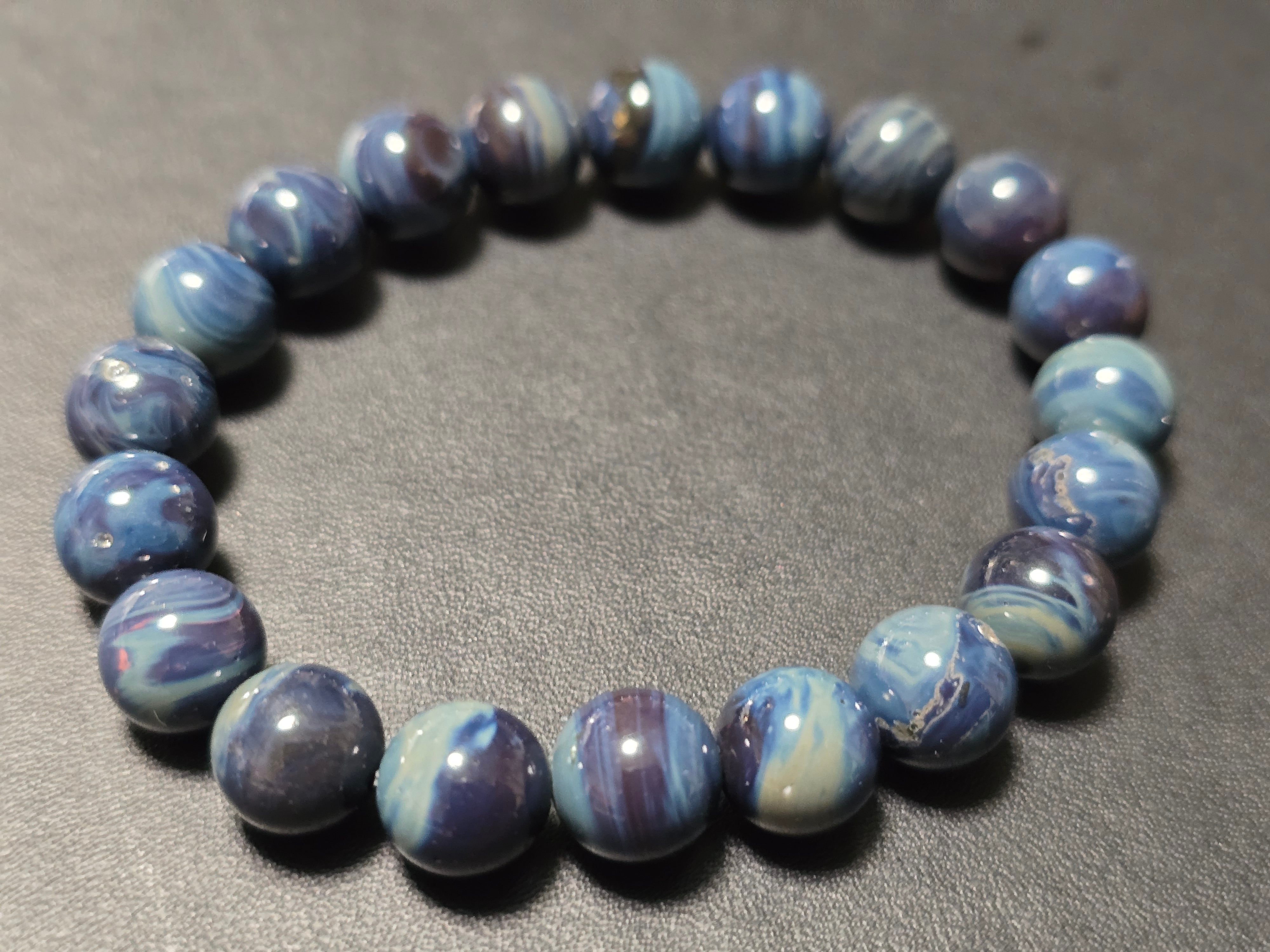 美しい波模様や小さな穴が夜空に浮かぶ星のようで、まるで満天の星空の風景のような美しいブレスレットです。600~1400年前のドイツにて、古代の銅を作る時に出たガラスの廃棄物が蓄積して、長い年月を経て成分変化したものがシーバーアゲートとなります。