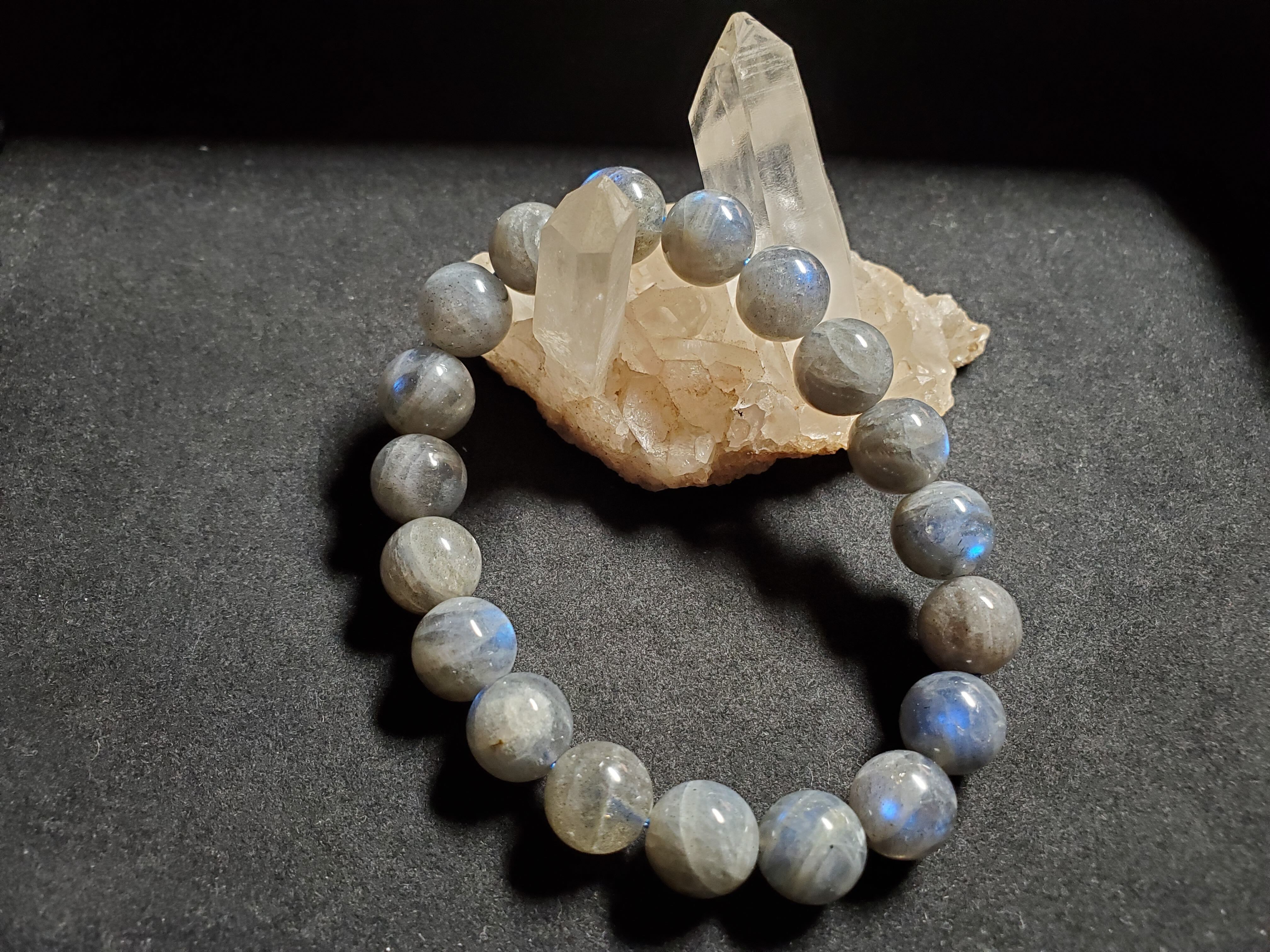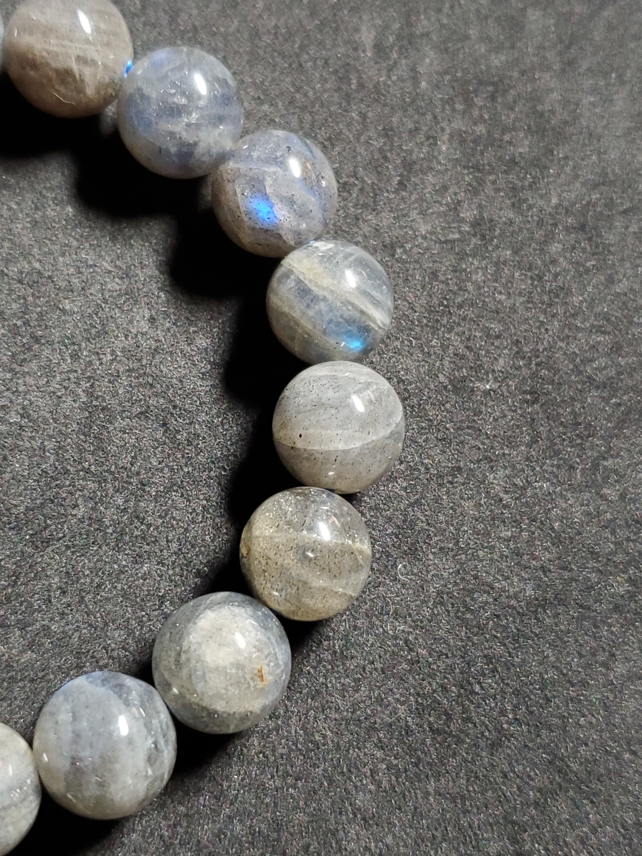 一見地味な色あいの石ですが、光の加減や見る角度によって、ブルー、グリーン、ゴールド、イエロー、ピンクなど、様々な色の輝きを見ることができます。まるで蝶の羽のような、美しく強い輝きこそがラブラドライトの魅力といえるでしょう。この独特の輝きは「ラブラドレッセンス(ラブラドルの光)」と呼ばれています。