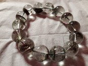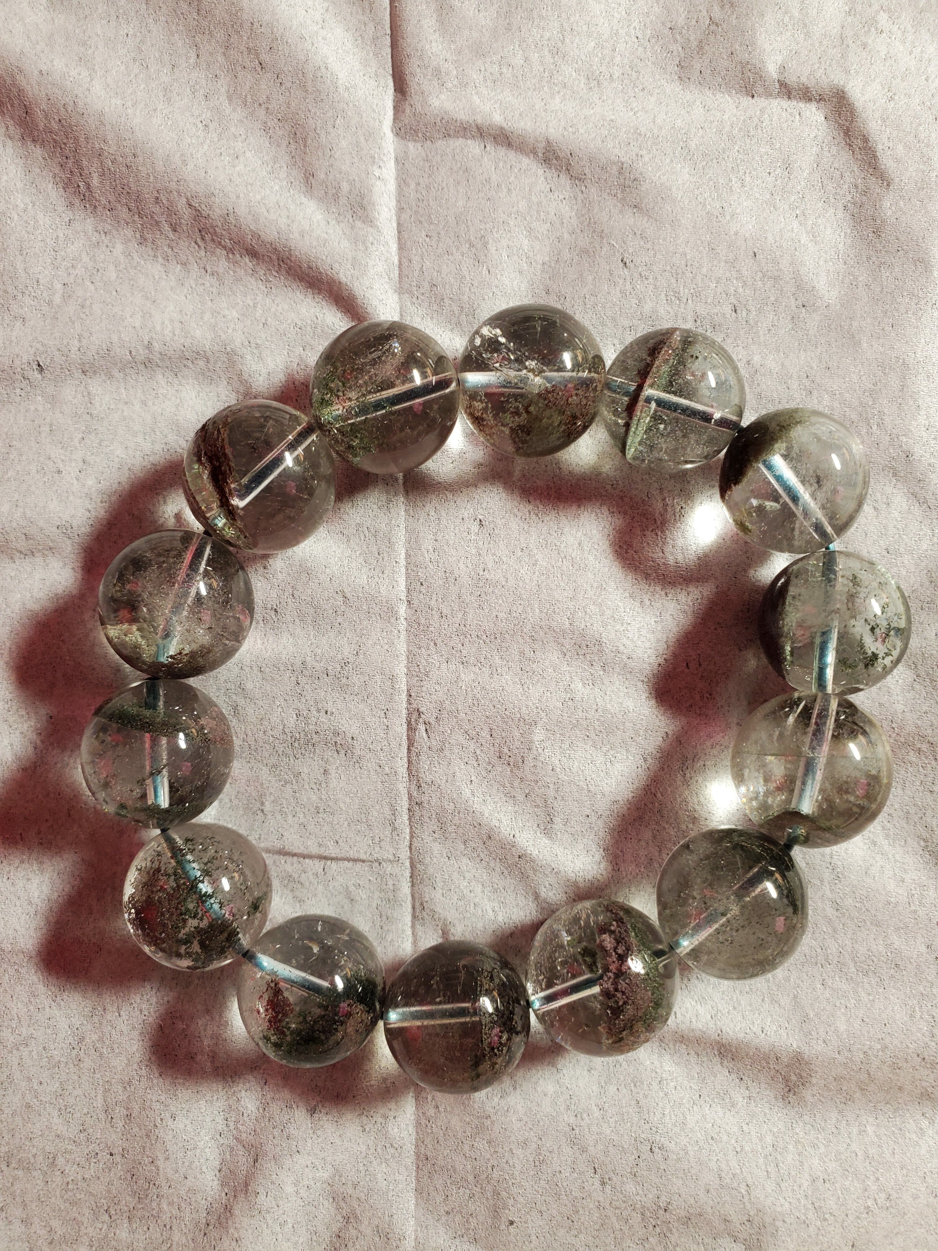 15㎜のガーデンクォーツのブレスレットです。内径は約15.5cmです。紫や緑の庭園か見られます(^o^)。