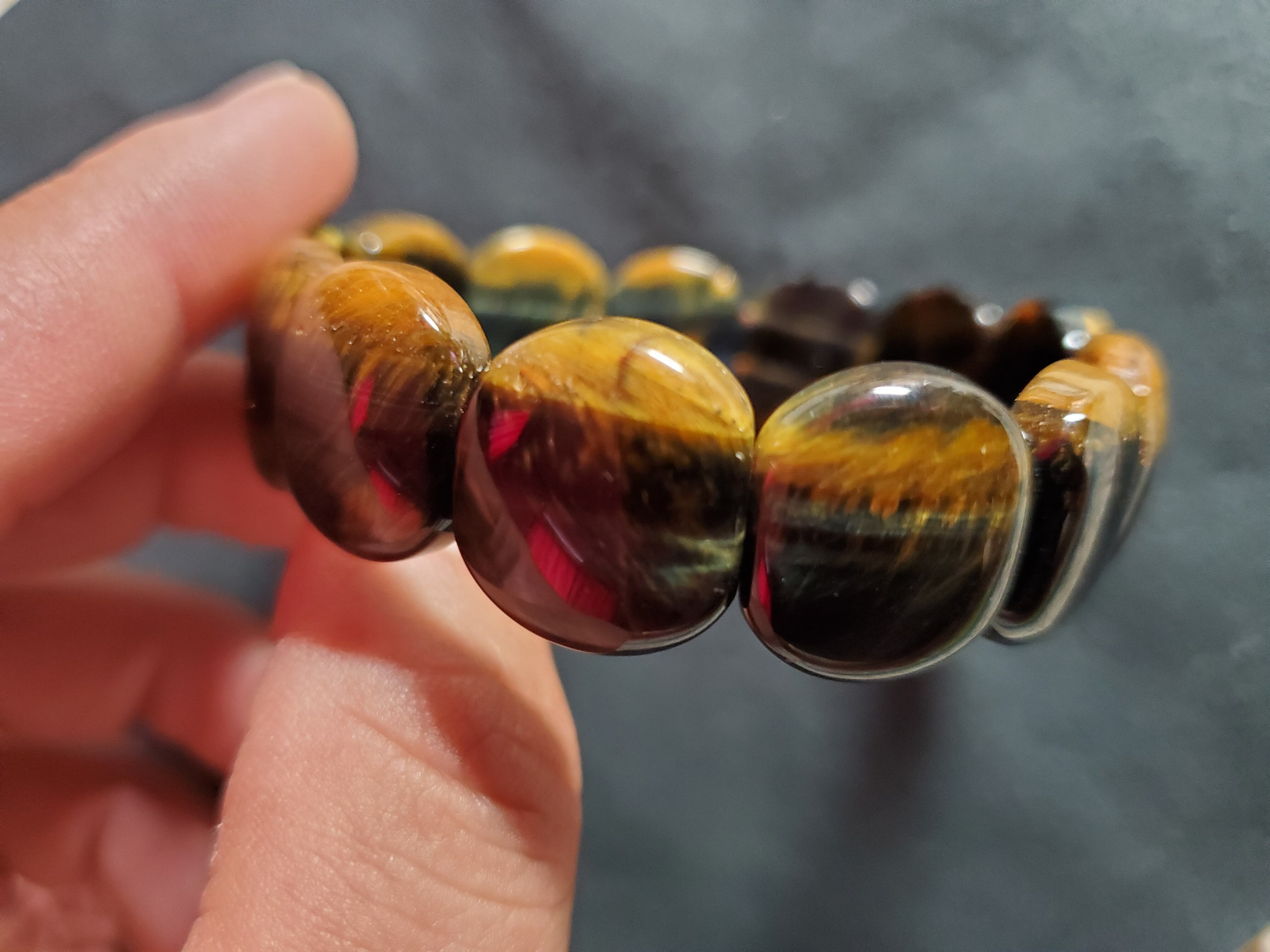 美しく研磨された石の表面には「シャトヤンシー」または「キャッツアイ効果」と呼ばれる光の帯が見られます。この現象は繊維状の結晶質によるもので、タイガーアイ(もしくはホークスアイなど)の最大の魅力だといえるでしょう。また、現在流通しているレッドタイガーアイ(赤虎目石)のほとんどは、人工的に熱処理を施して色を赤く変化させたものであることが多いようです。天然に色が変化したものは非常に稀だといわれています。