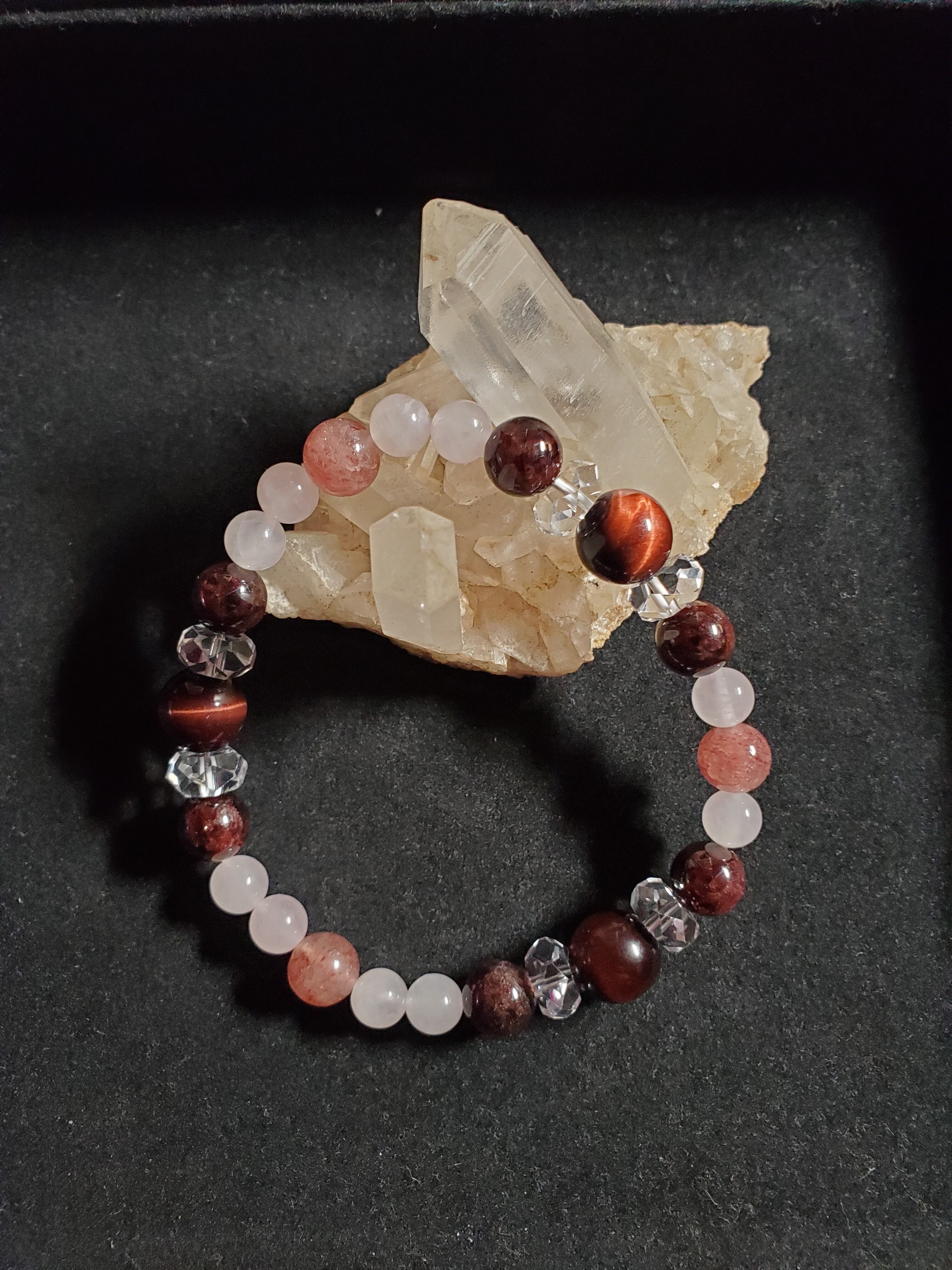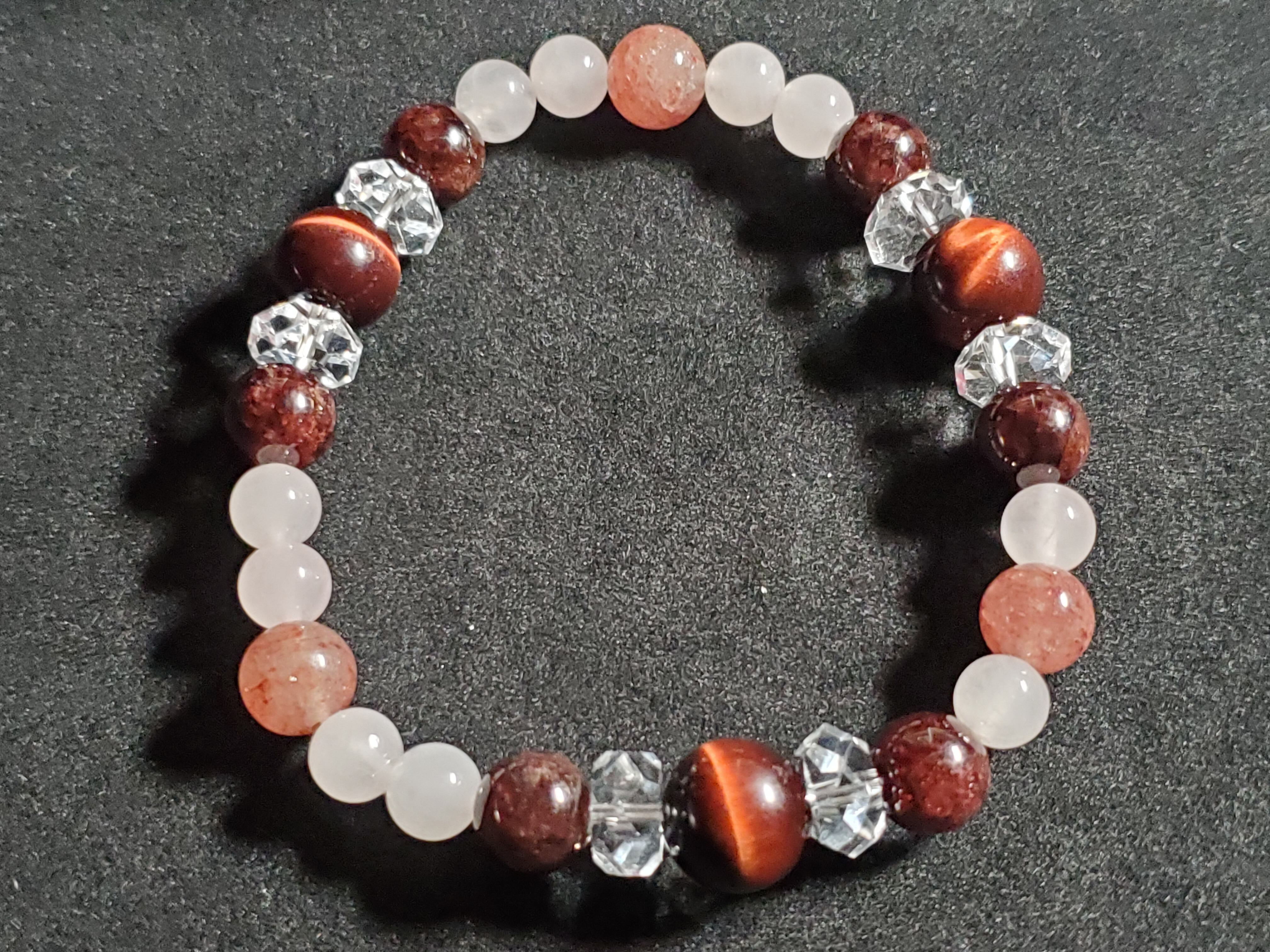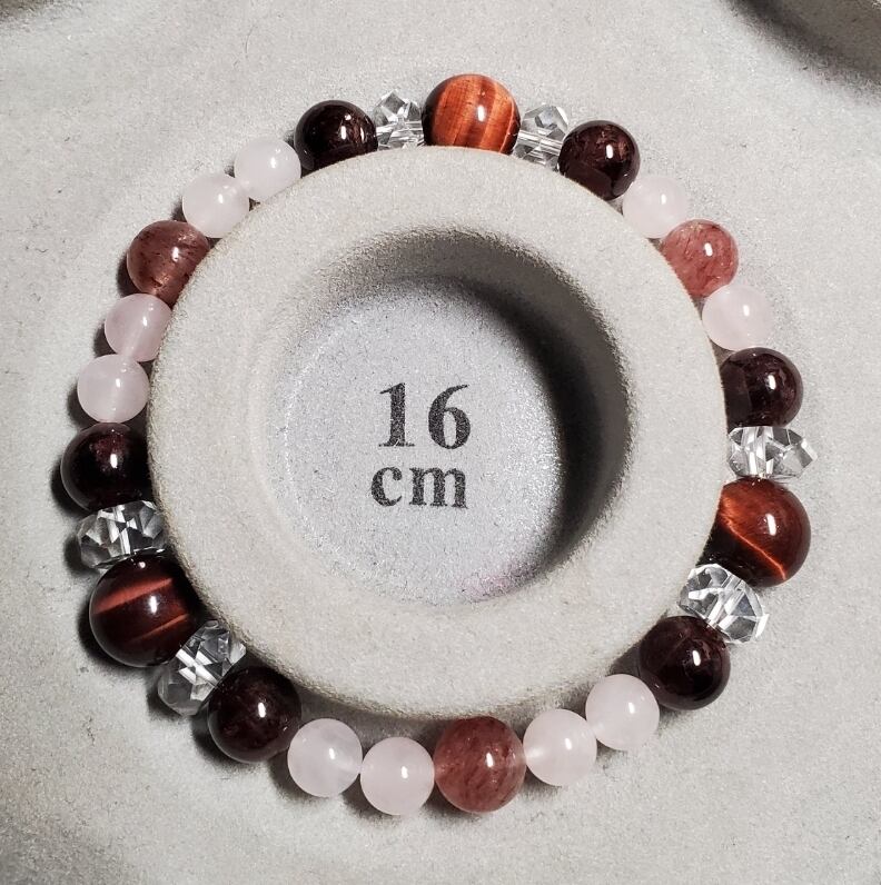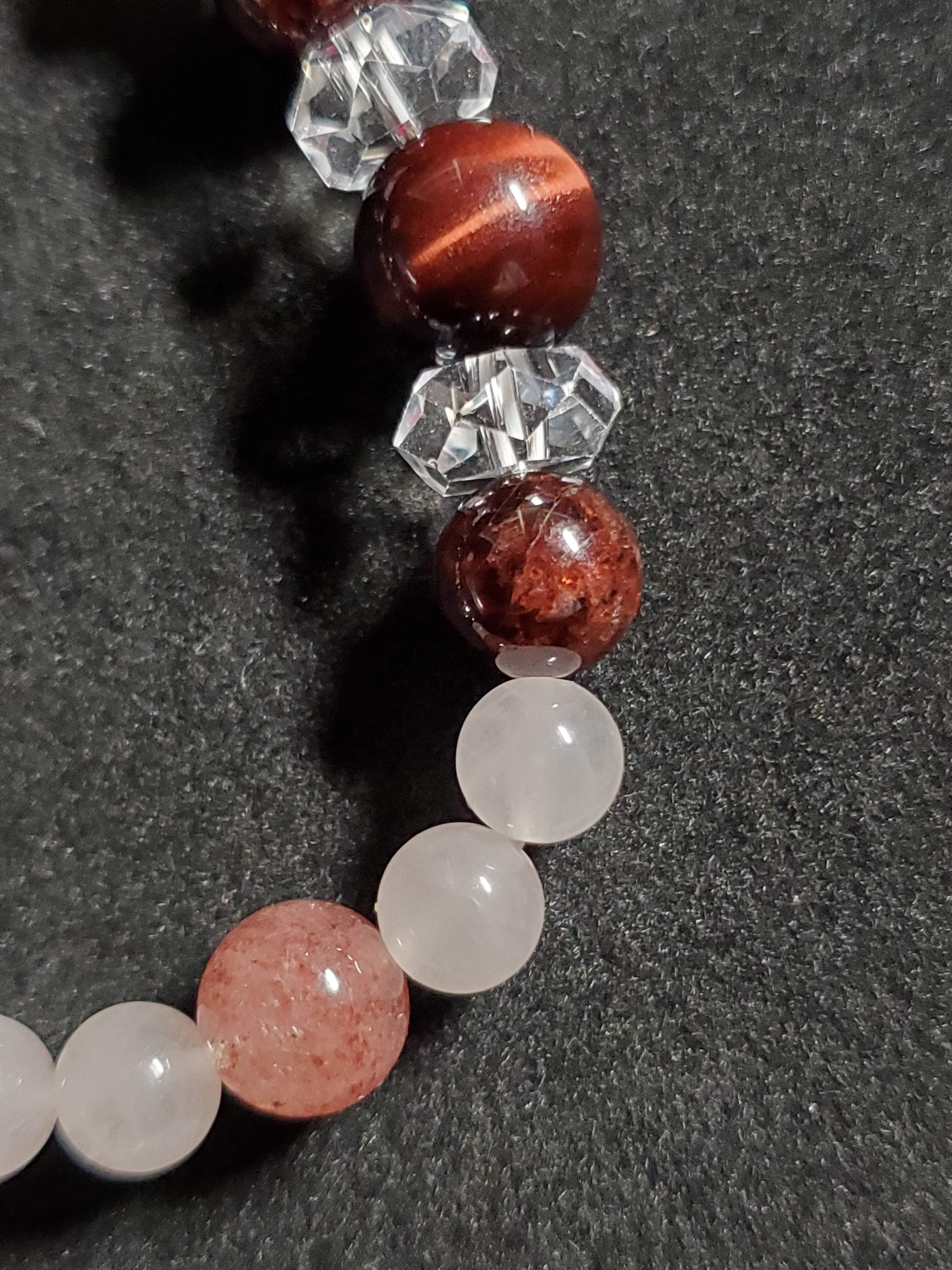 モスコバイト、ガーネット、ローズクォーツに一回り大きいレッドタイガーアイをアクセントに組み上げました。