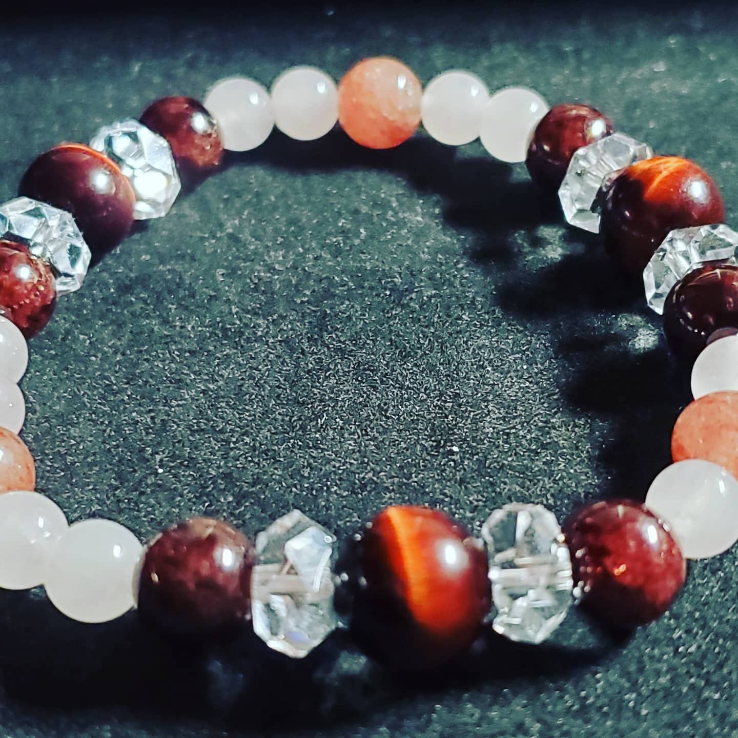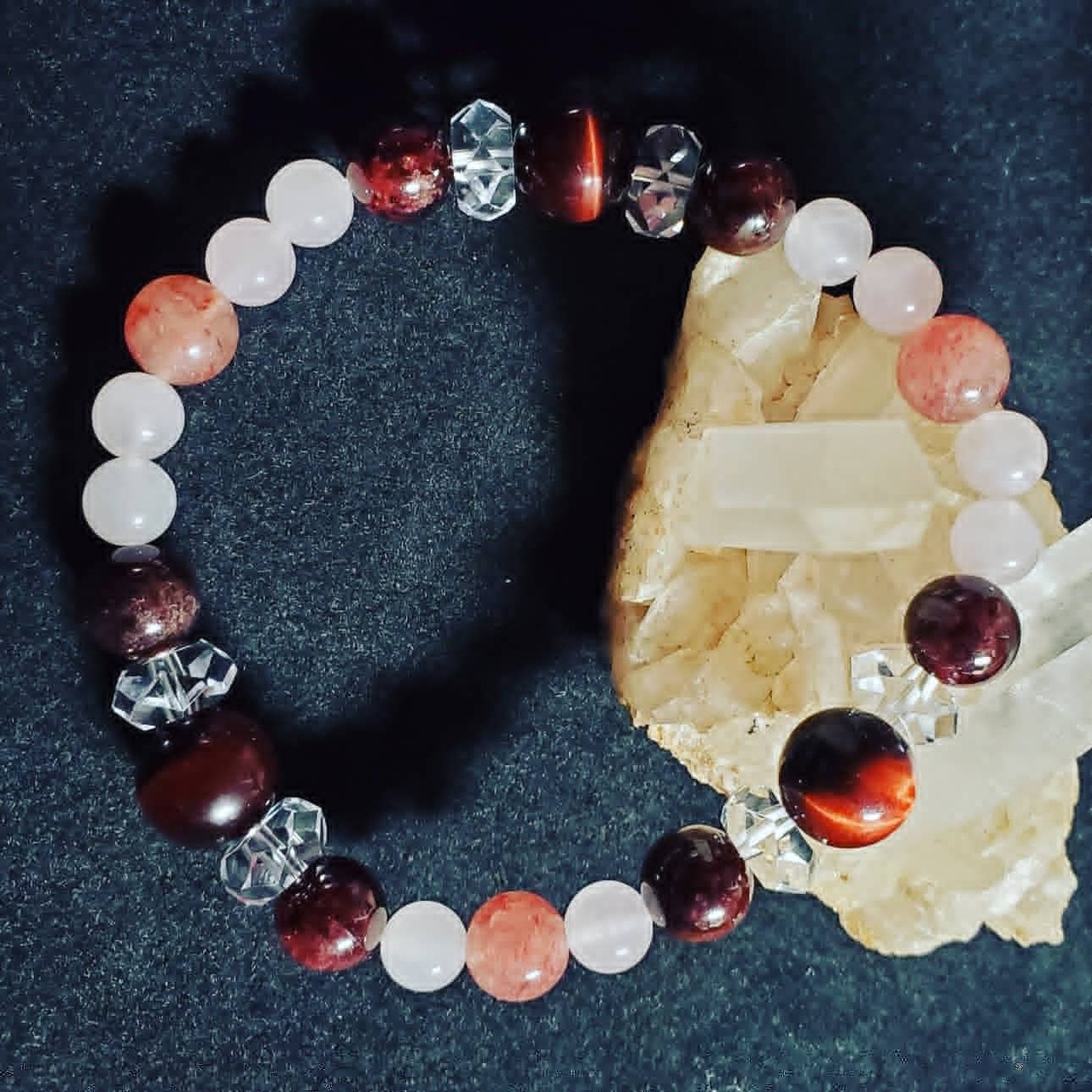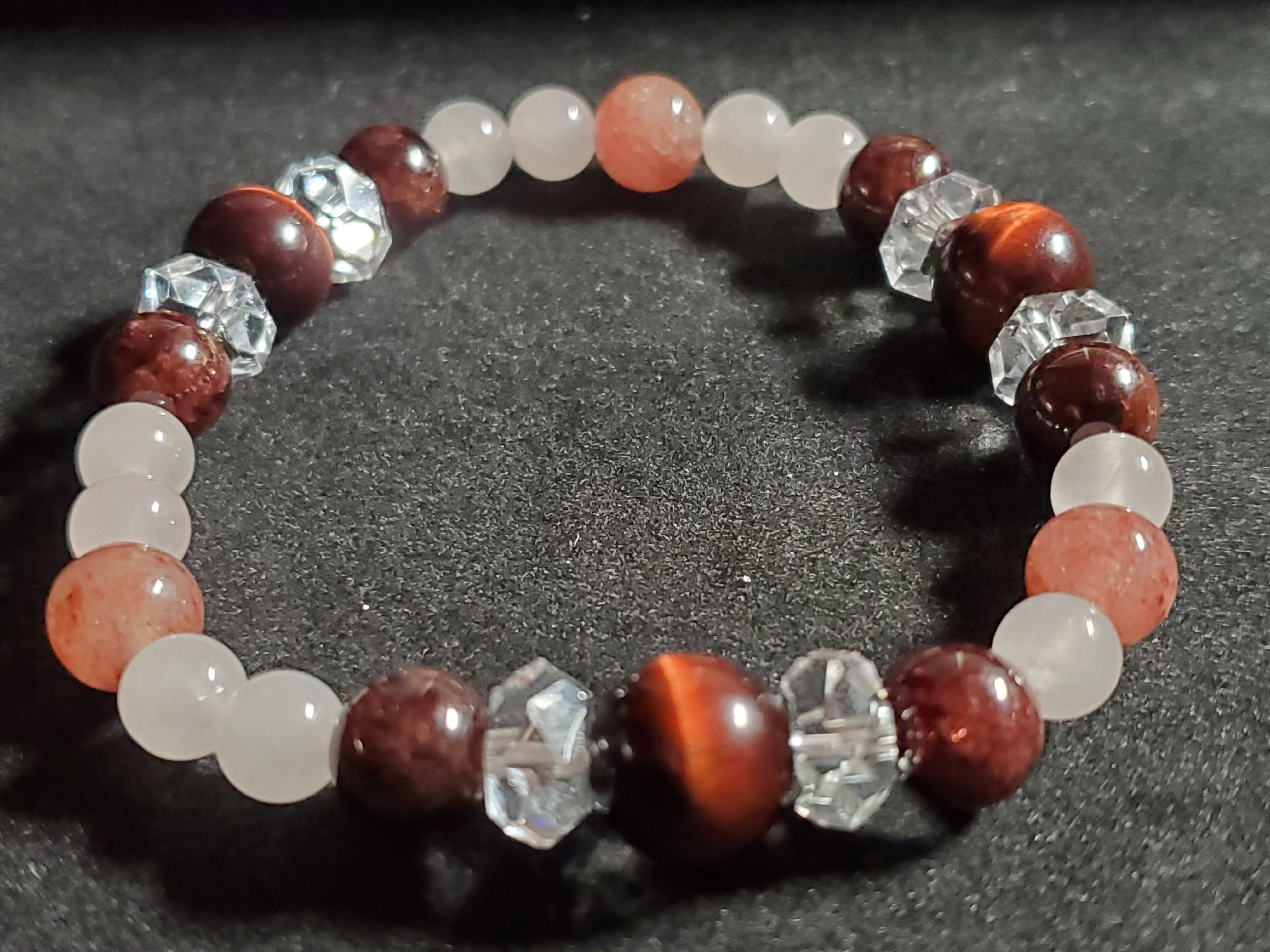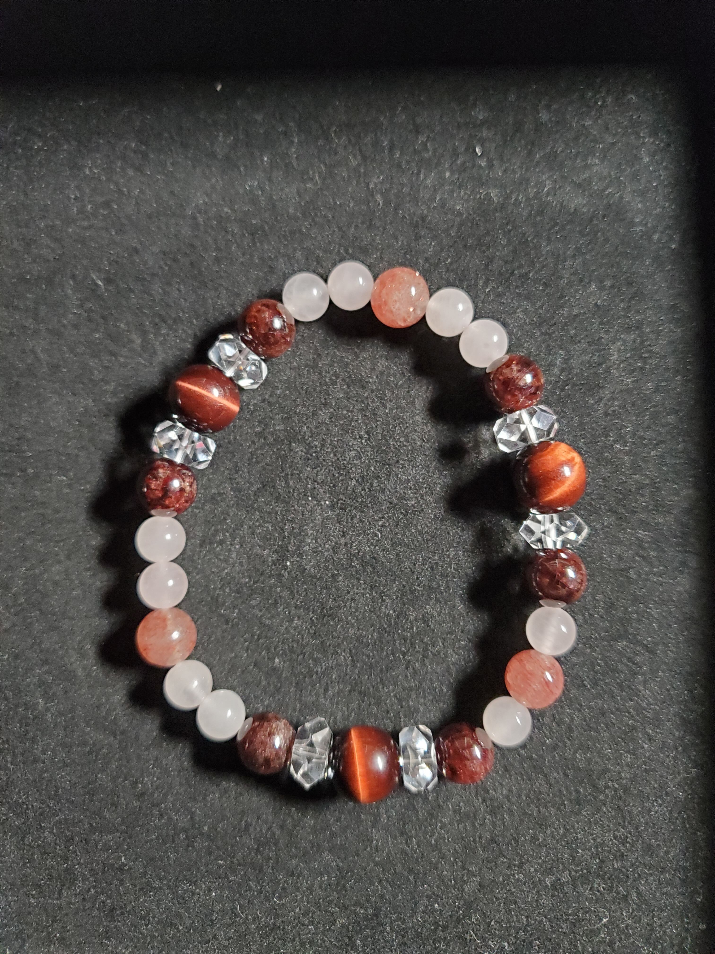 モスコバイト、ガーネット、ローズクォーツに一回り大きいレッドタイガーアイをアクセントに組み上げました。