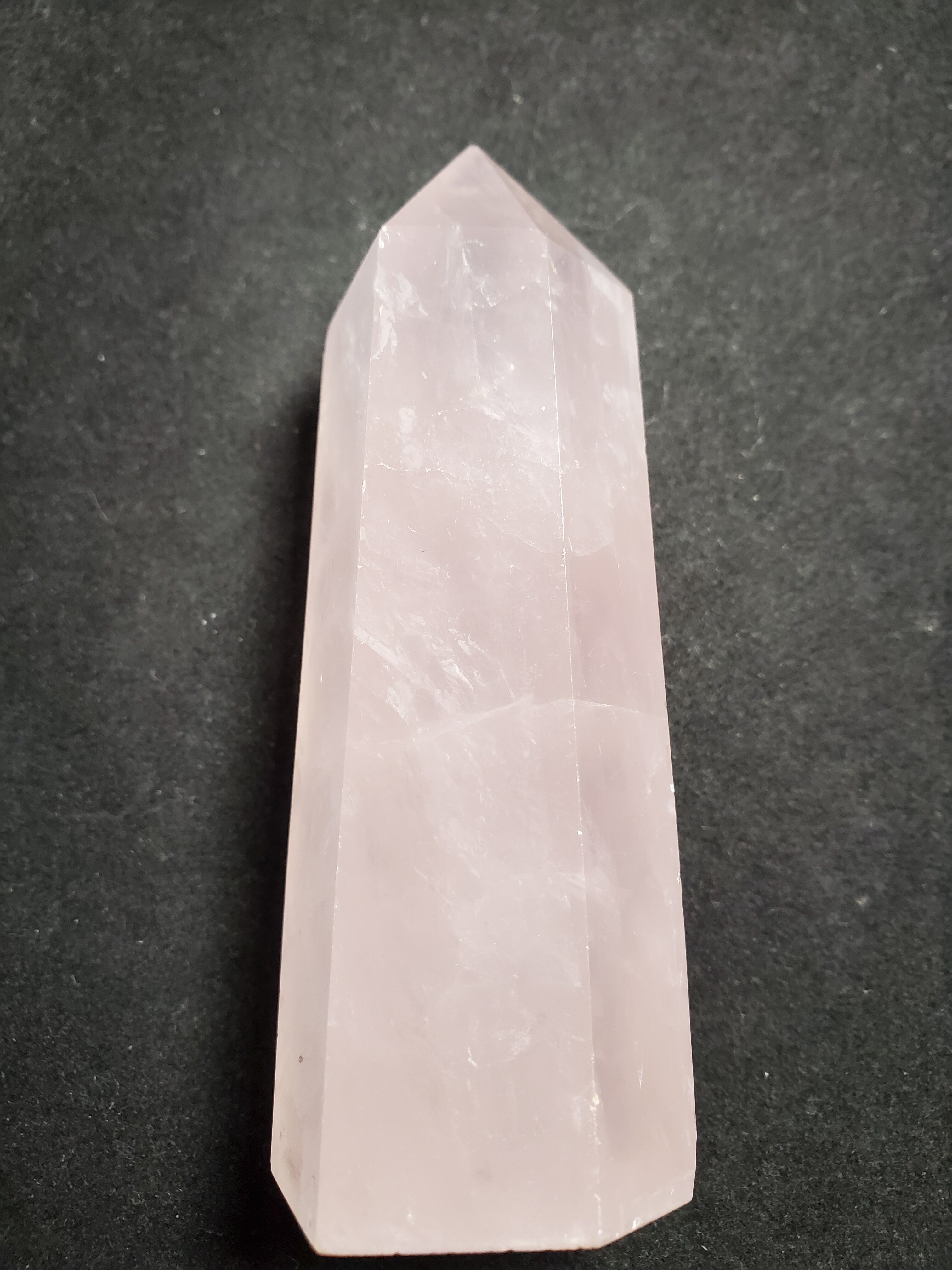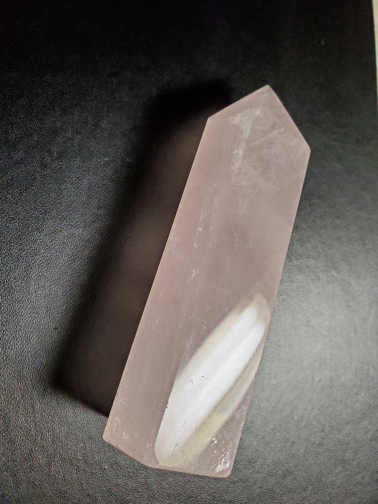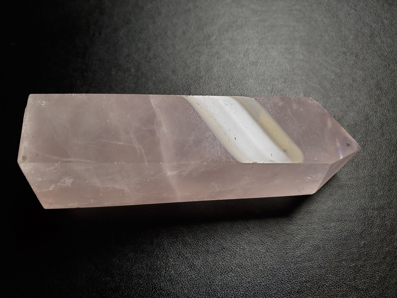 ローズクォーツの六角柱です。大きさは、約97㎜です。ボリュームがあり、淡いピンクで綺麗です。
