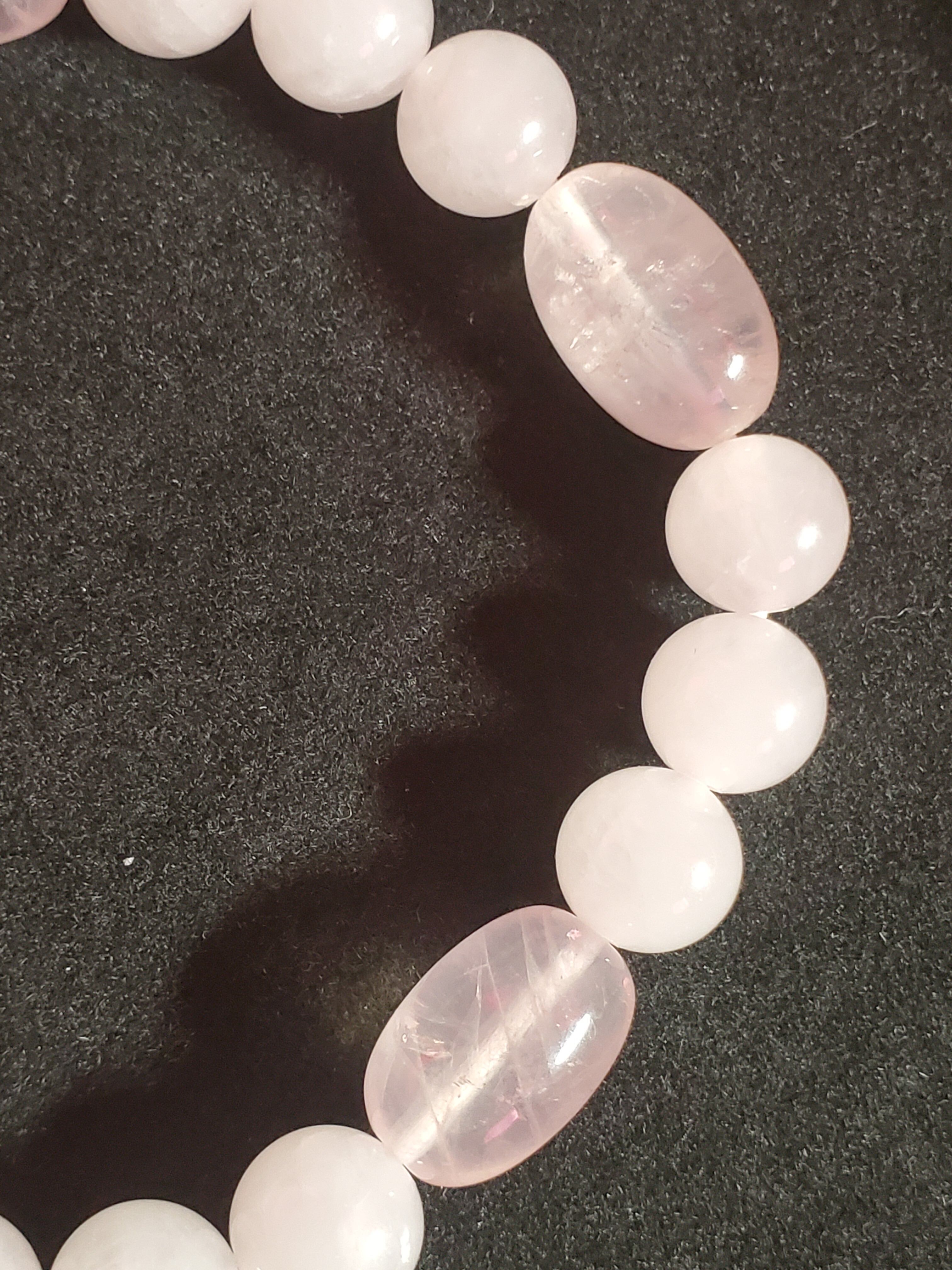 ローズクォーツのオリジナルブレスレットです。内径は約16.5cmです。8㎜のローズクォーツをベースに透明感のある天珠型のローズクォーツを組み合わせました。ローズクォーツを楽しめるブレスレットです。
