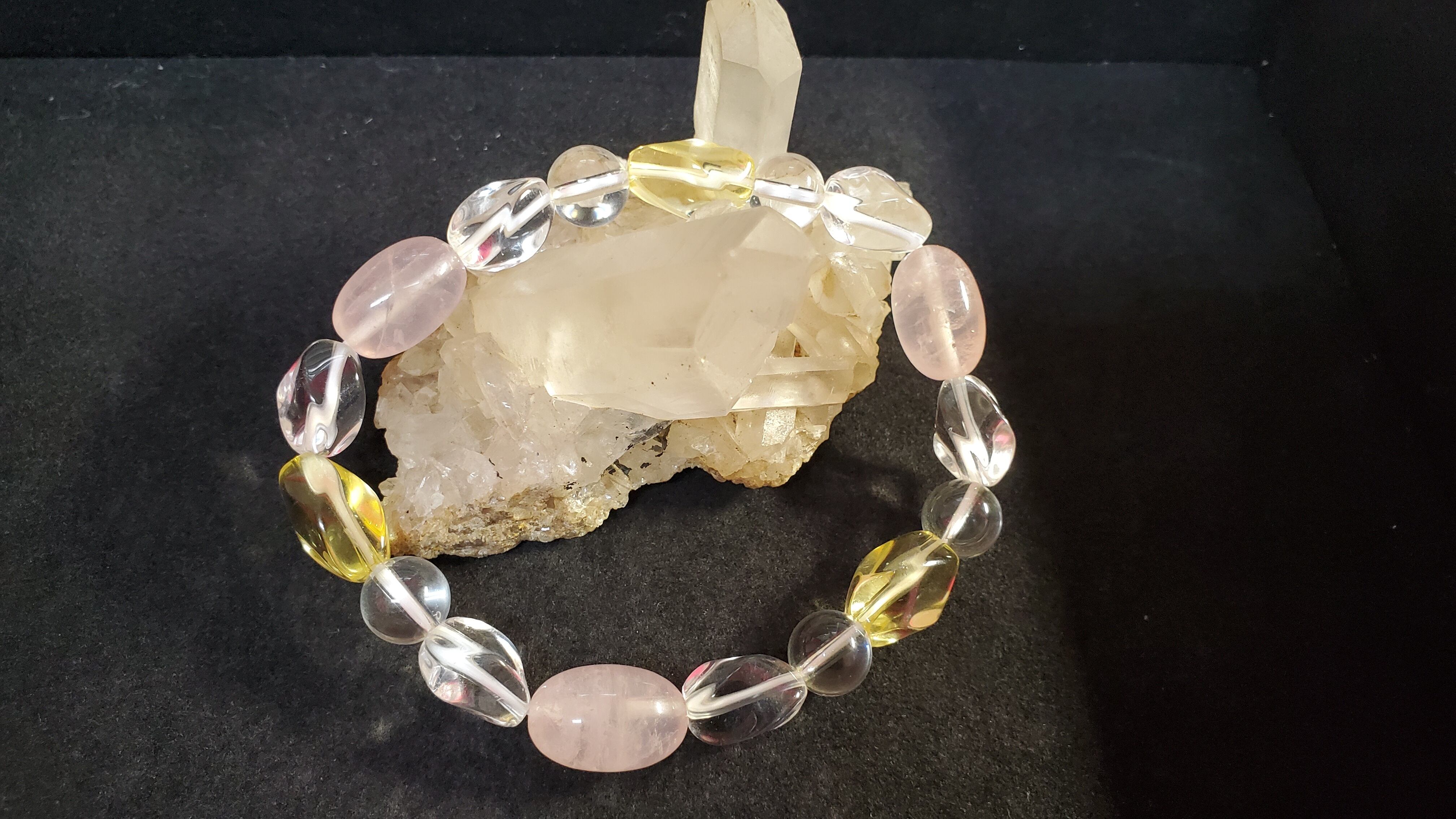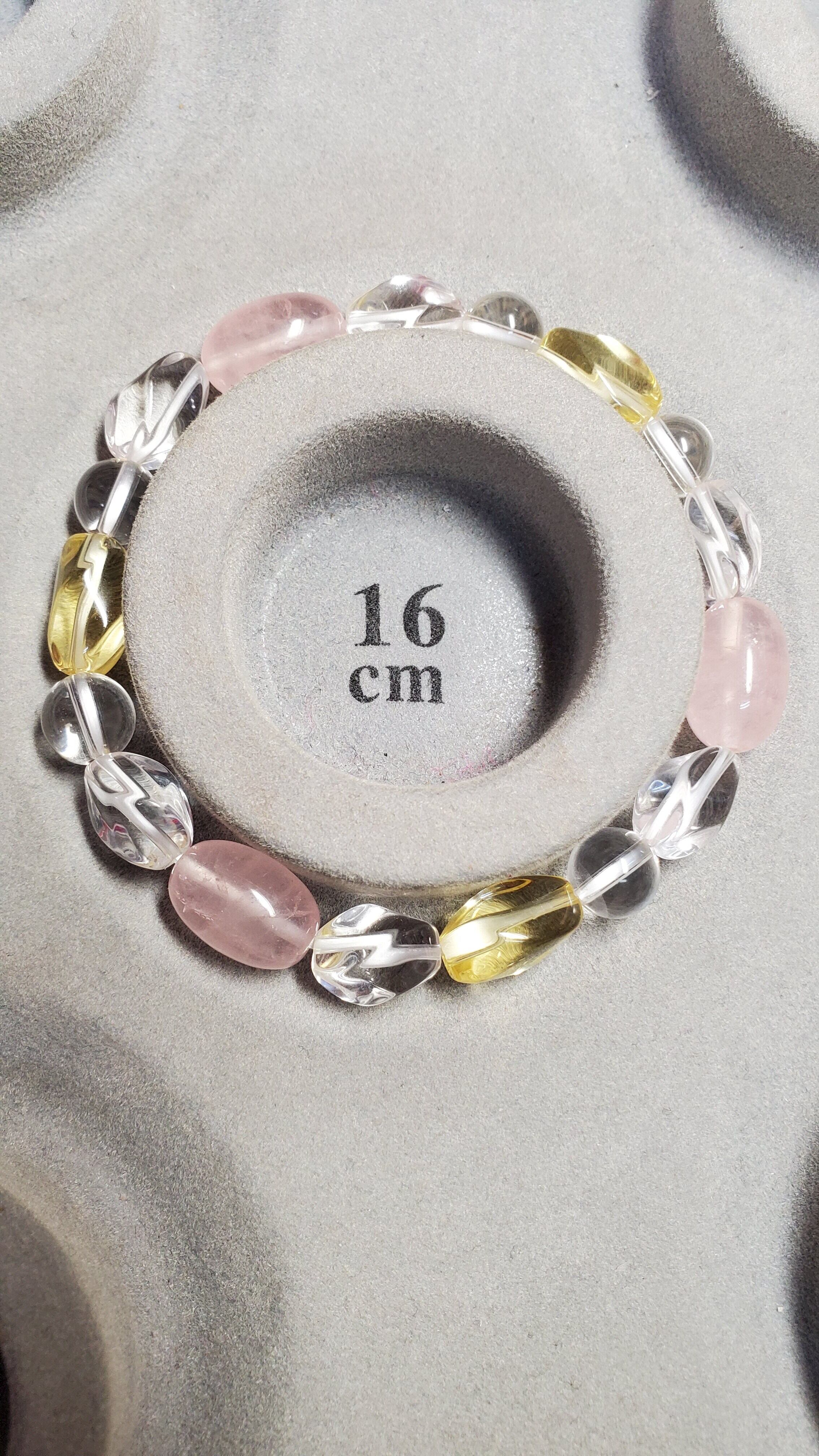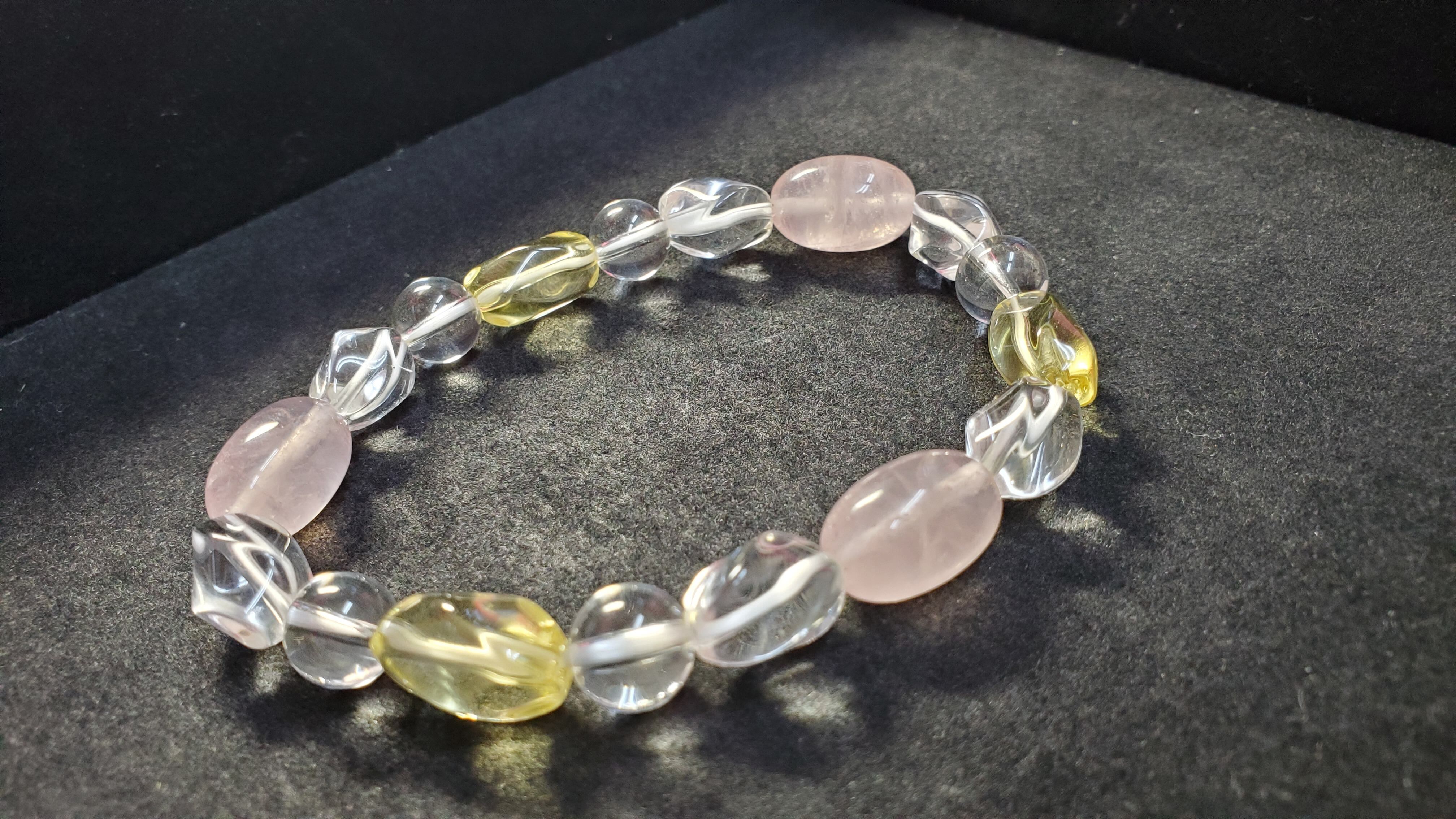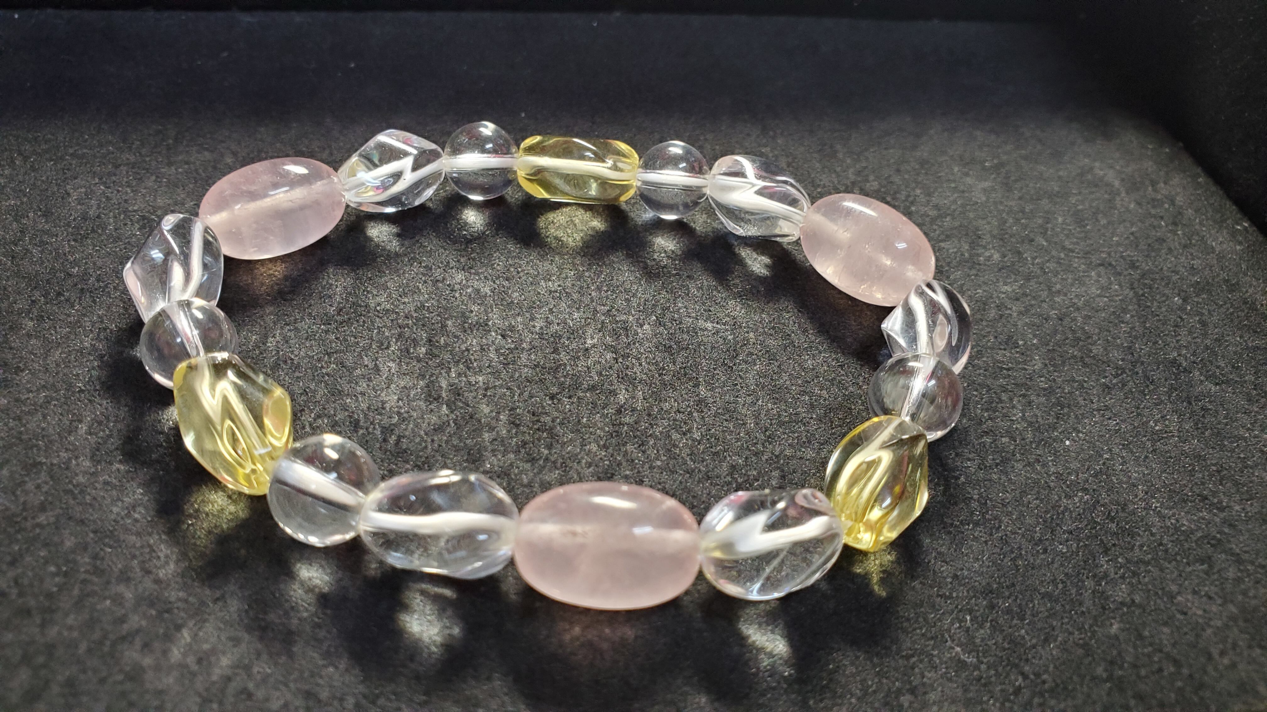 ツイスト型の水晶、シトリン、ディープローズクォーツの天珠型で、組み上げています。内径は約16㎝です。明るく爽やかにつけれそうです。