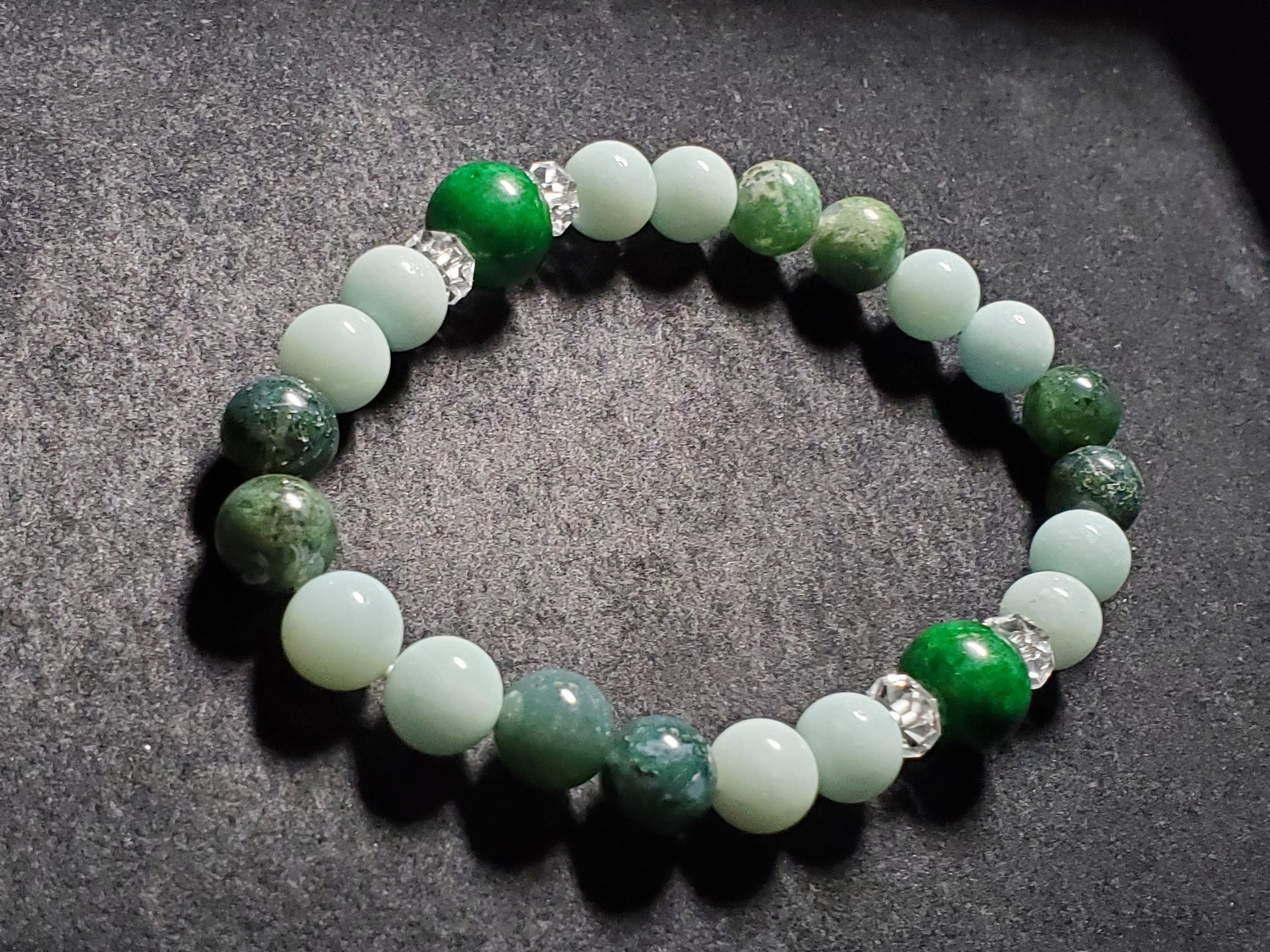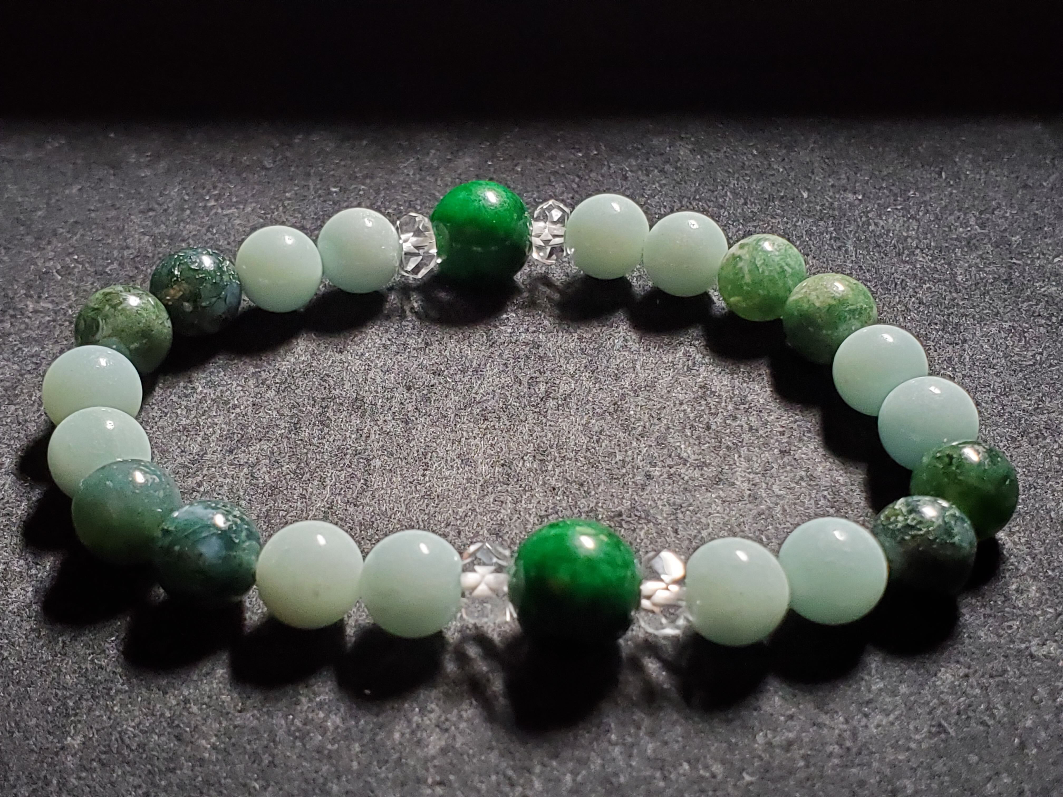 モスアゲート、クォーツァイト、アマゾナイトとカット水晶で組み上げました。