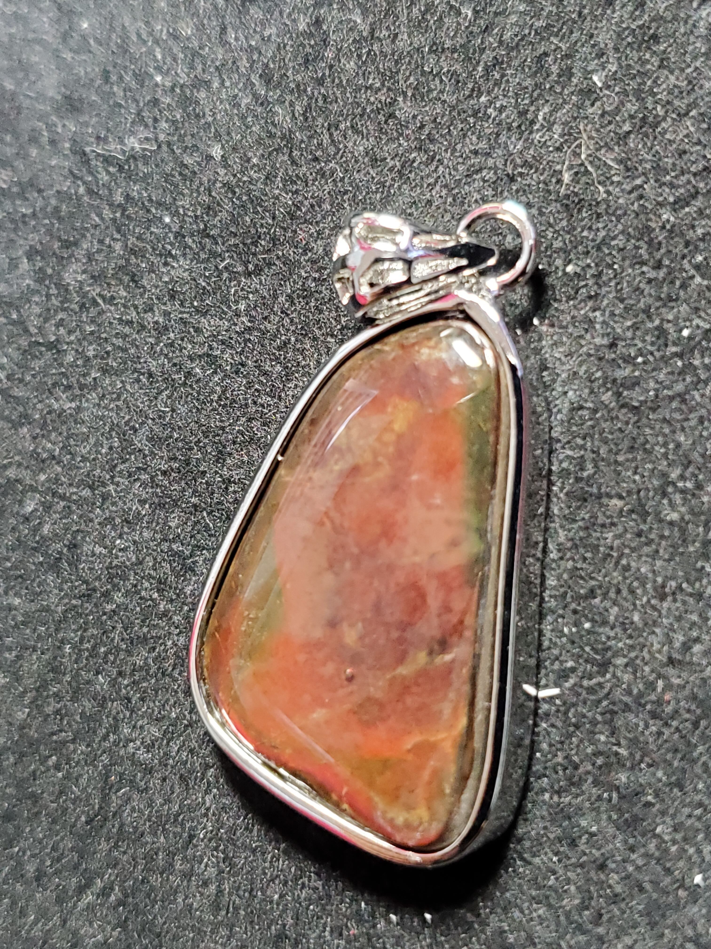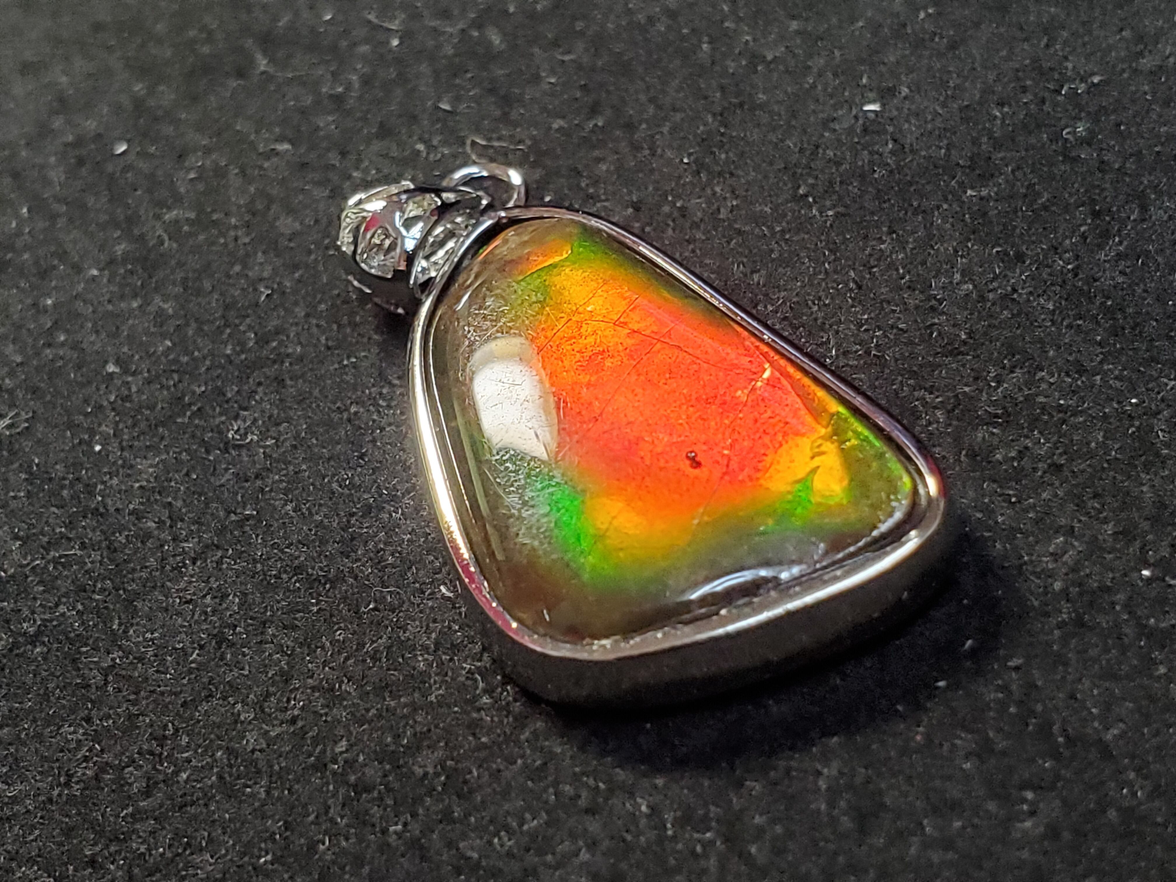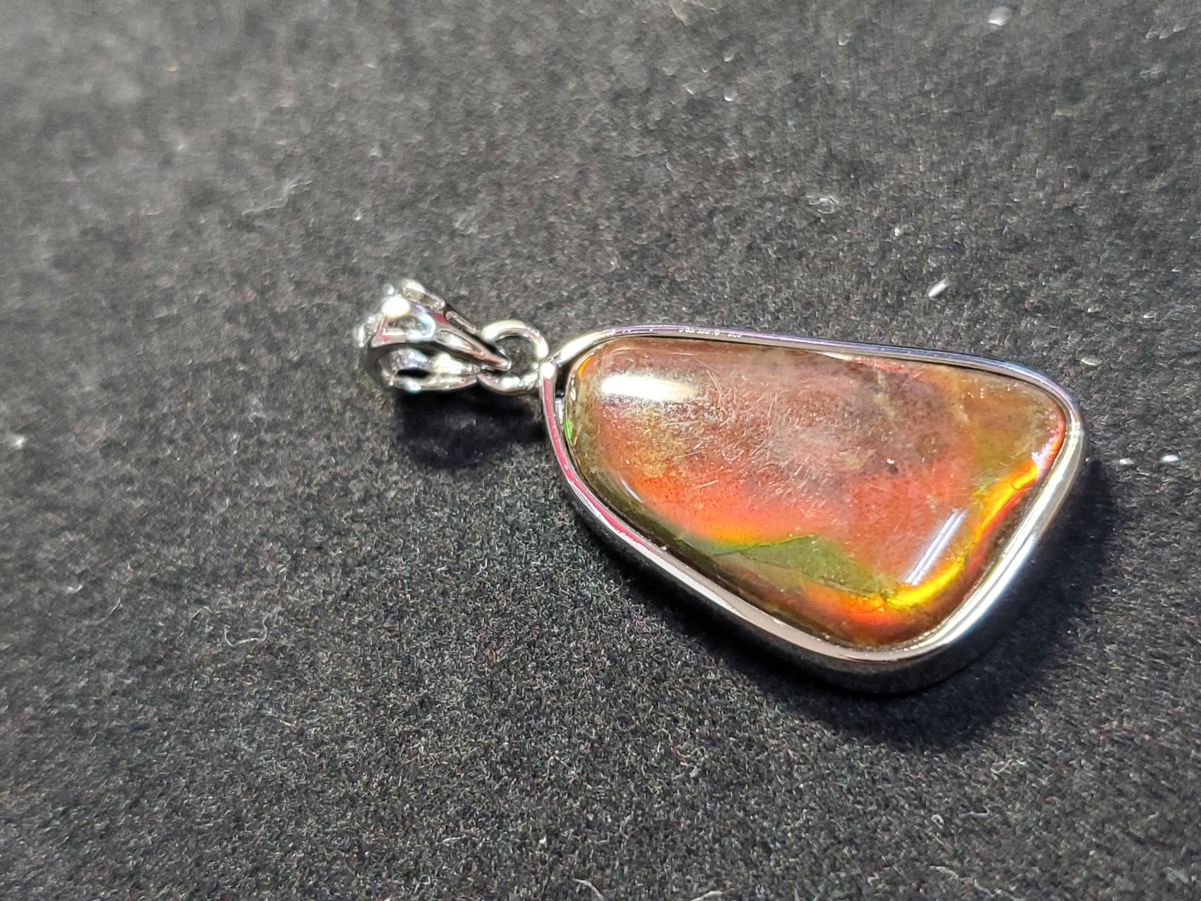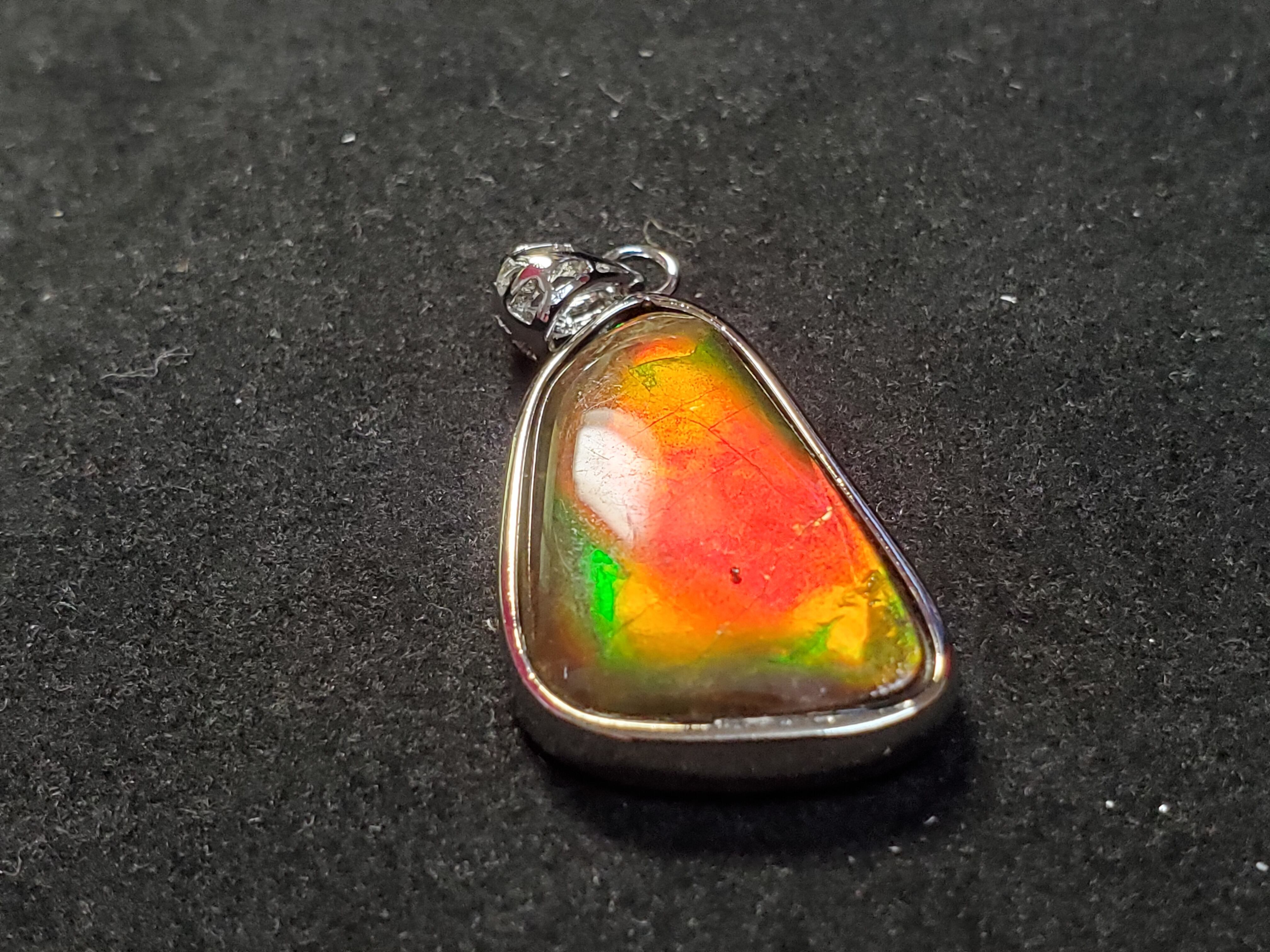 アンモライトのペンダントトップです。基本は、赤っぽい色ですが、遊色がすごいです。