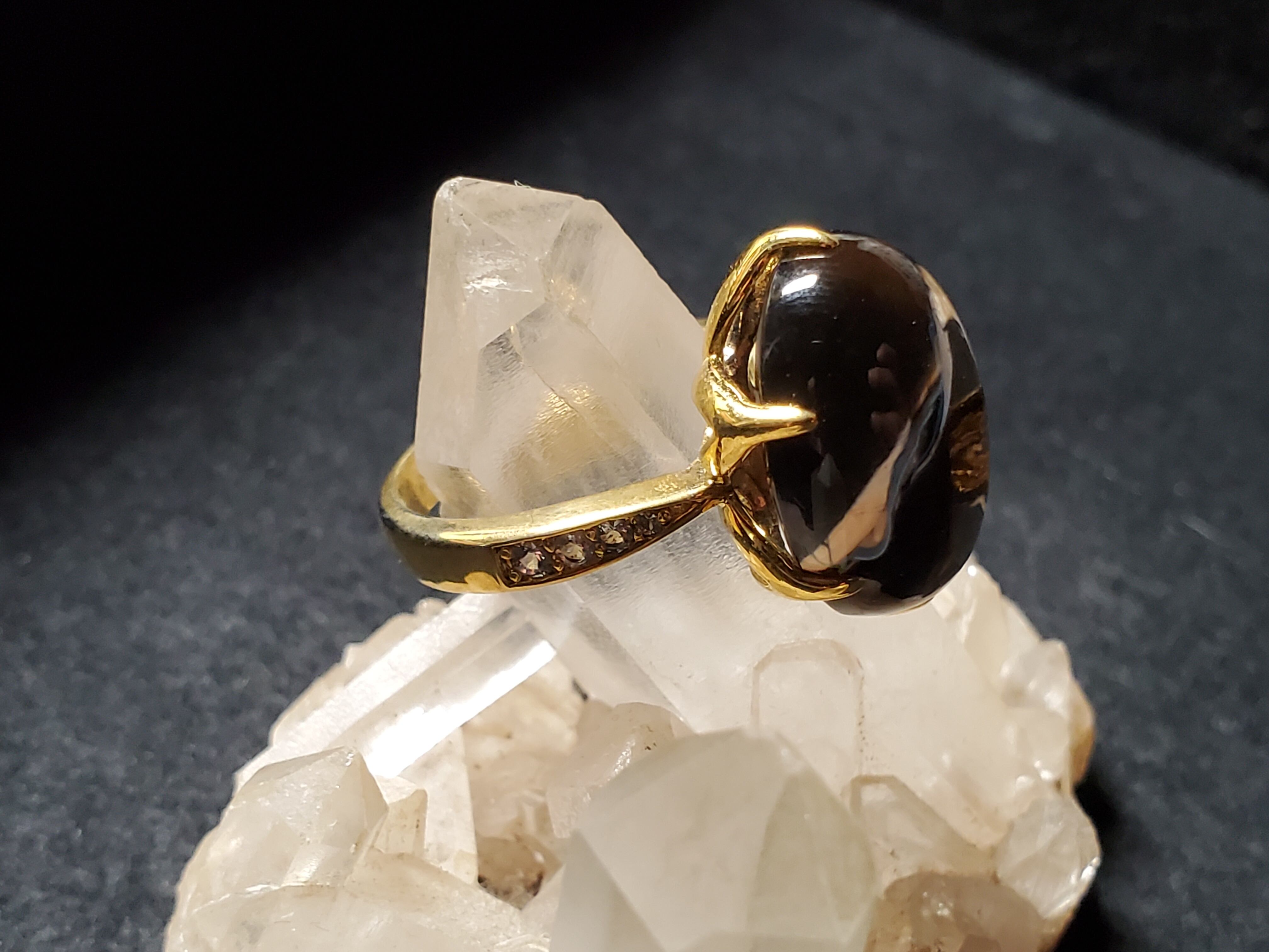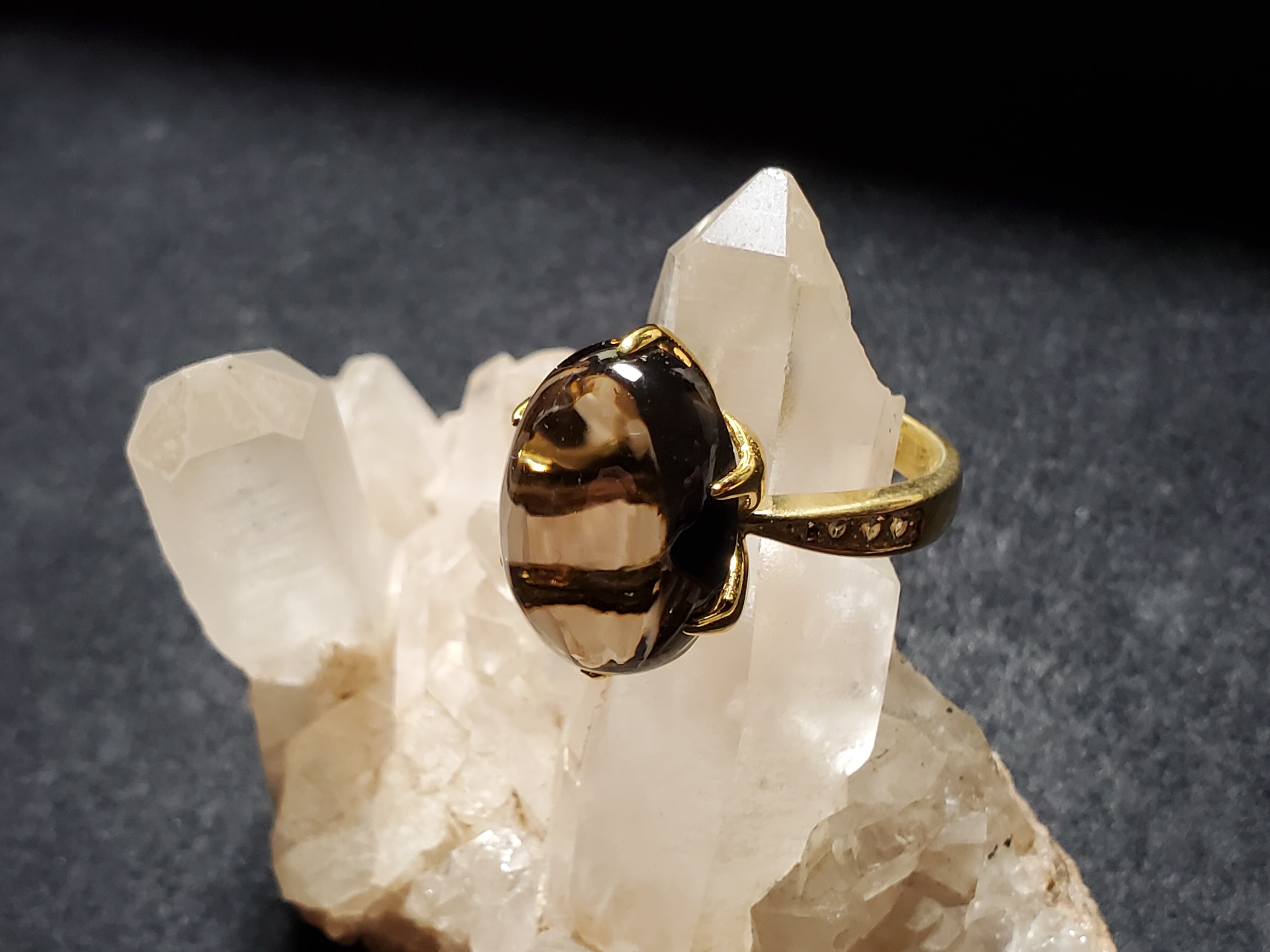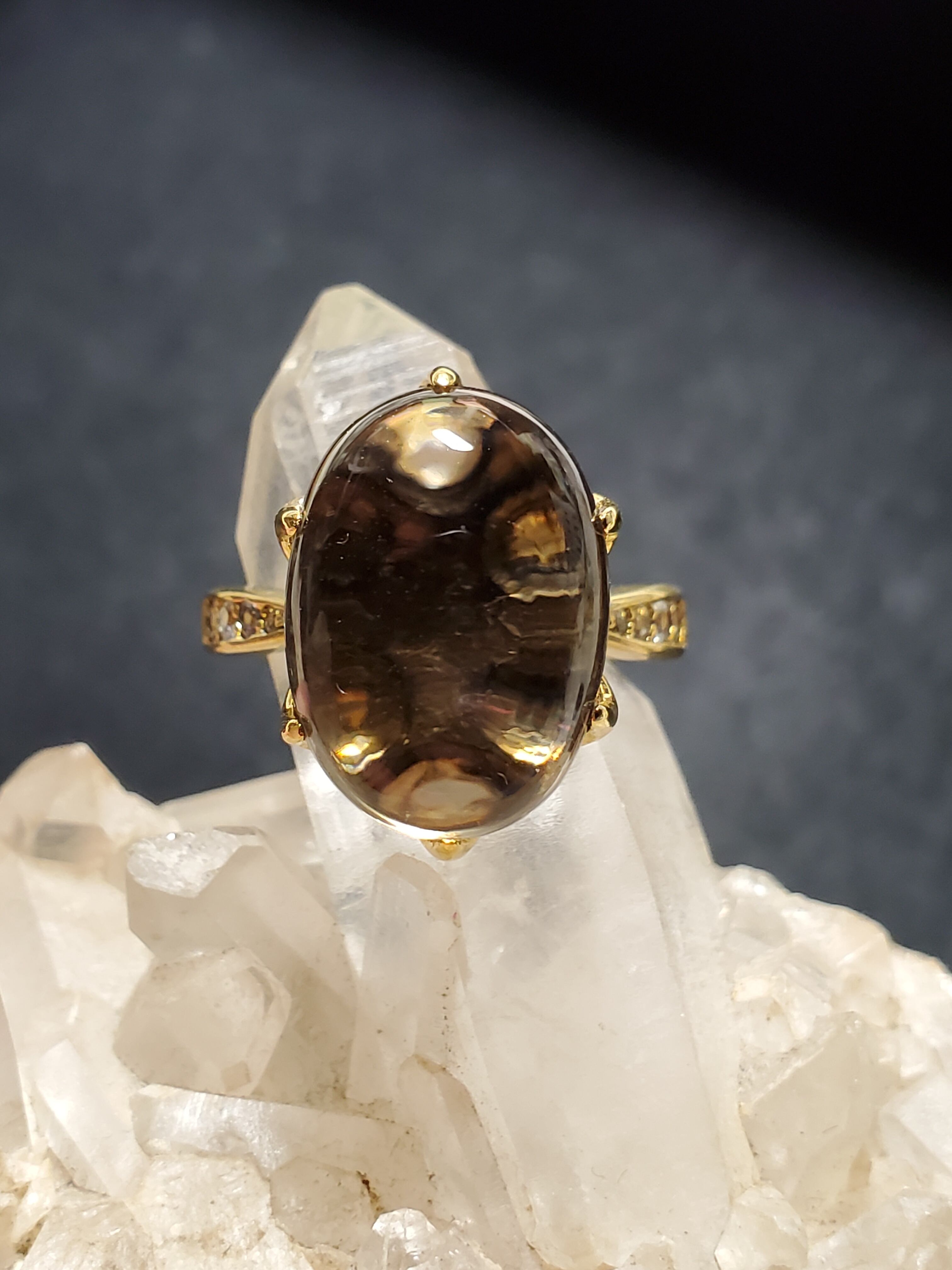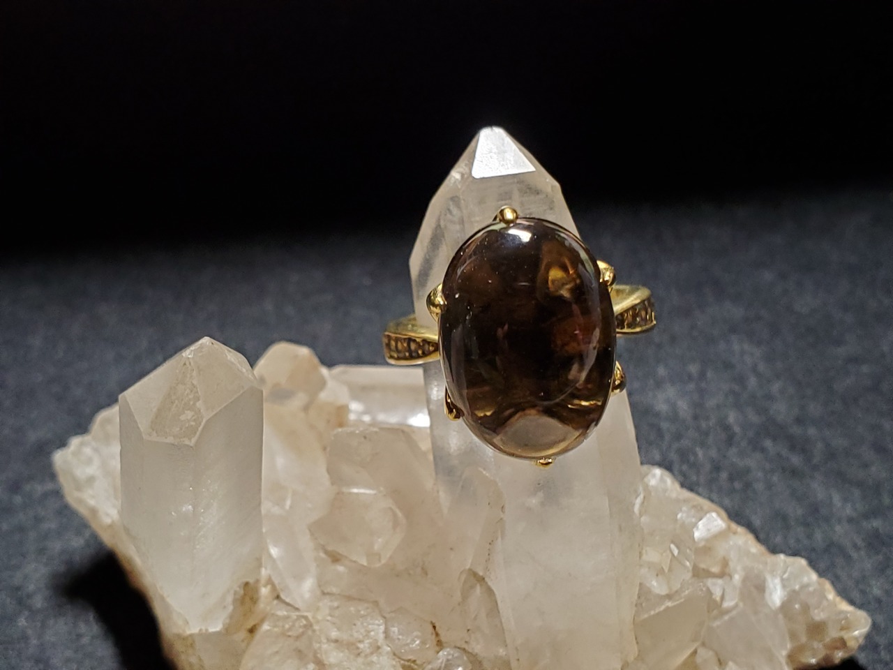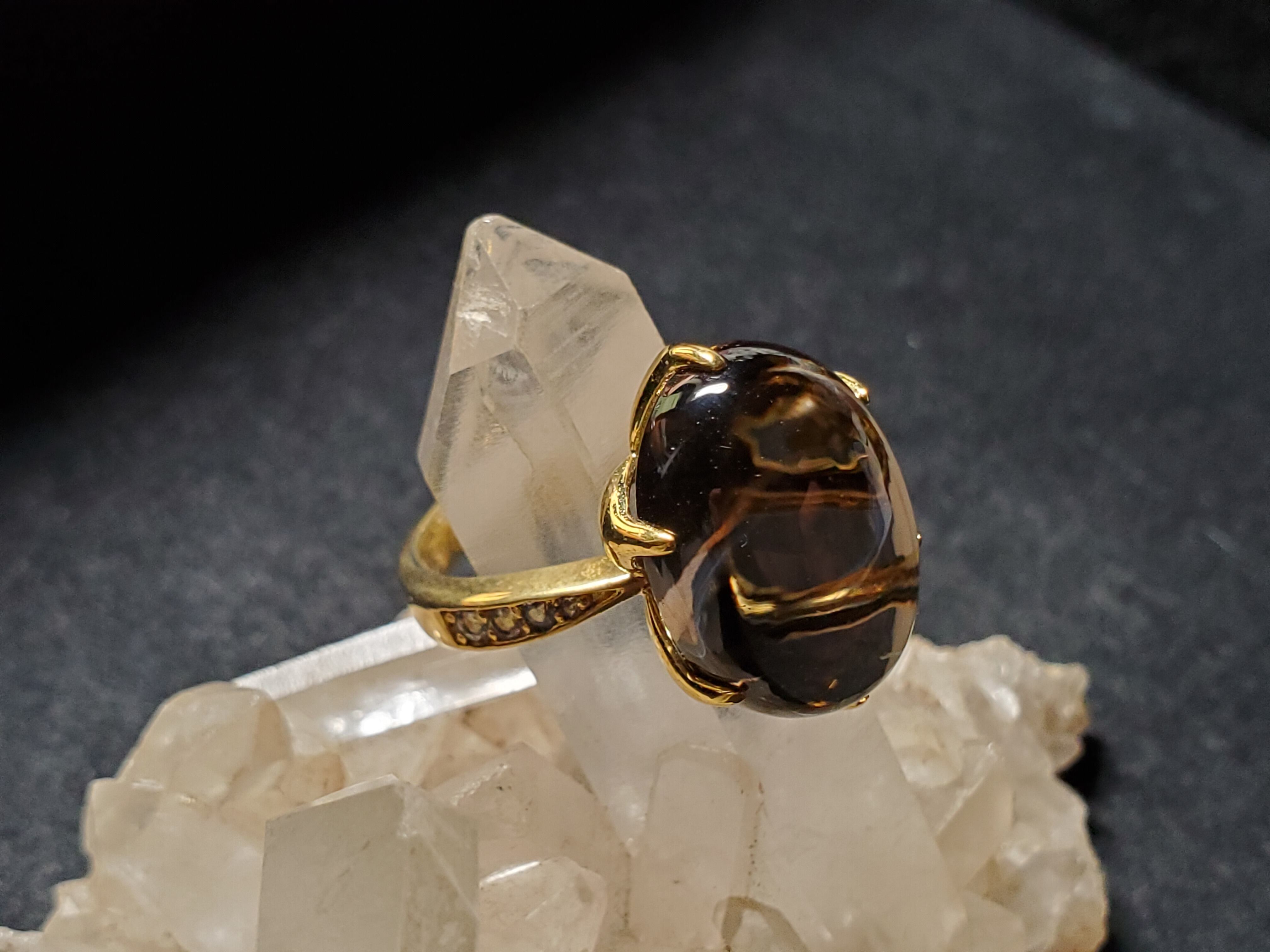 ゴールドカラーで、かなりゴージャスです。スモーキークォーツ自身も傷もクラックもなく美しいです。