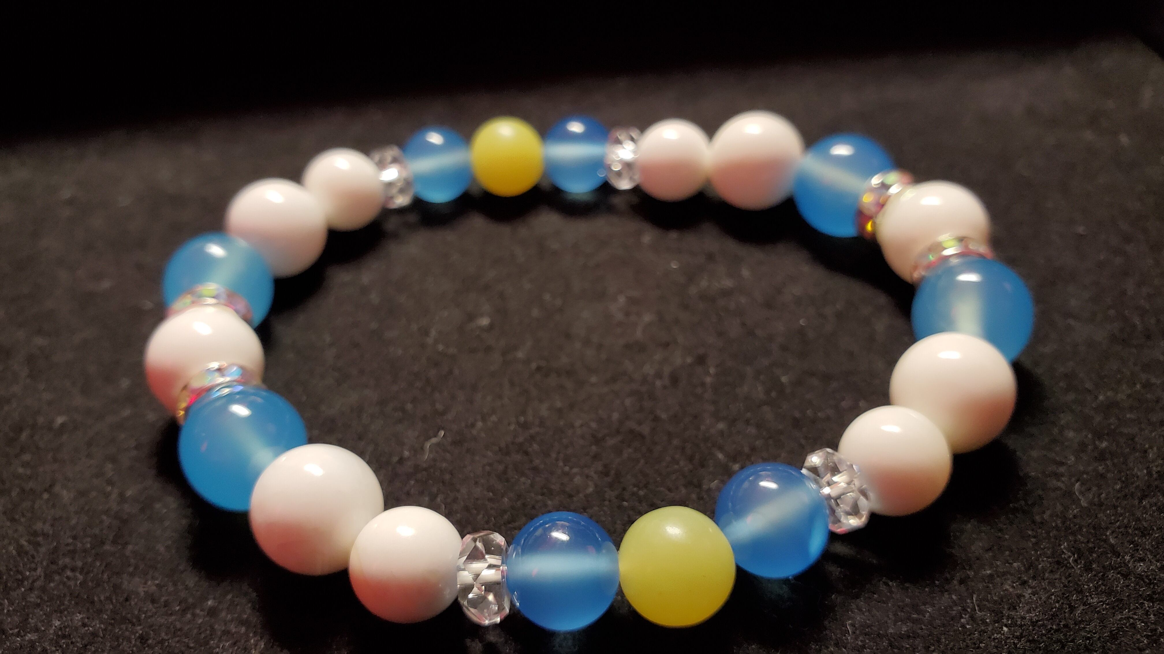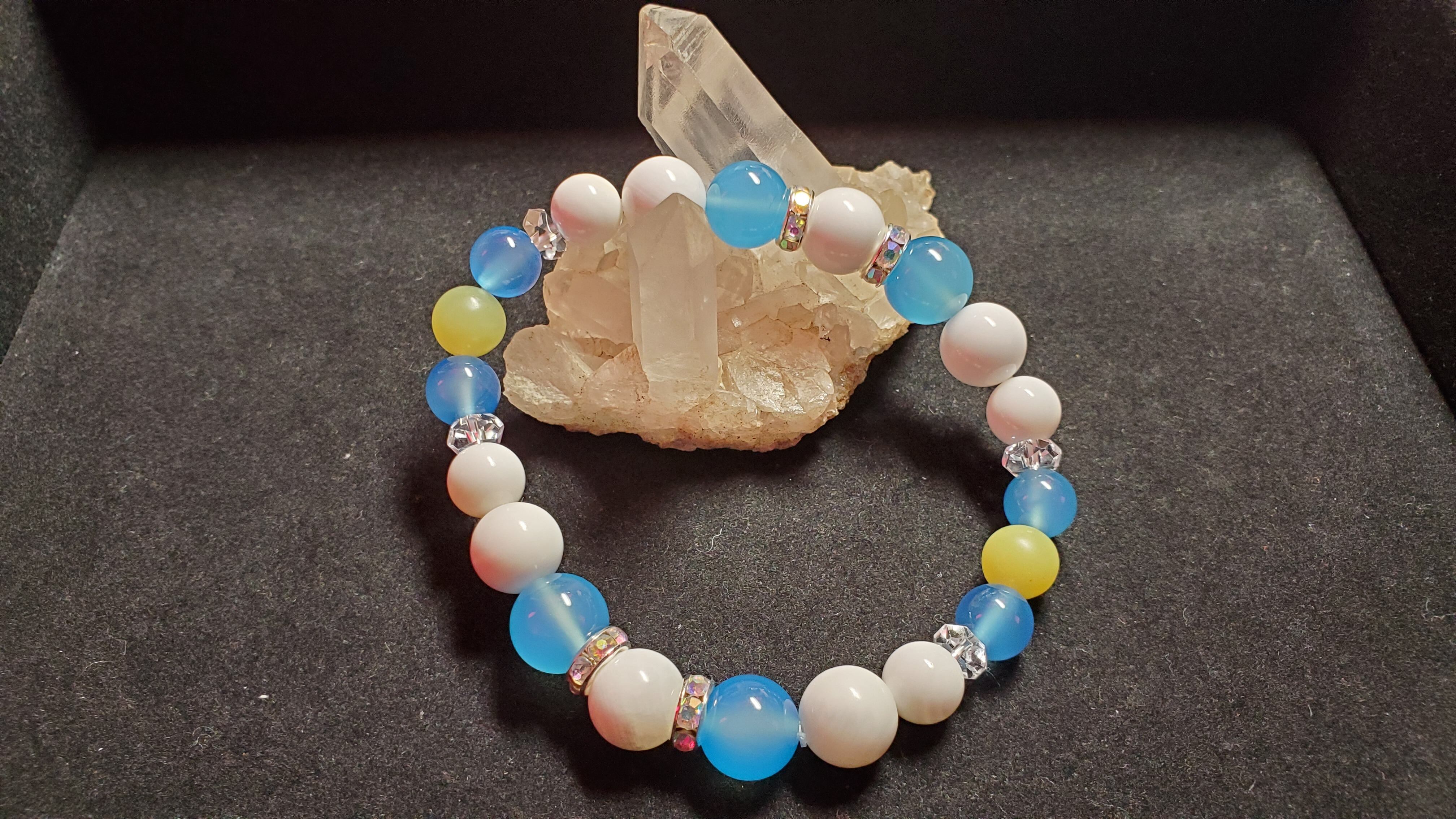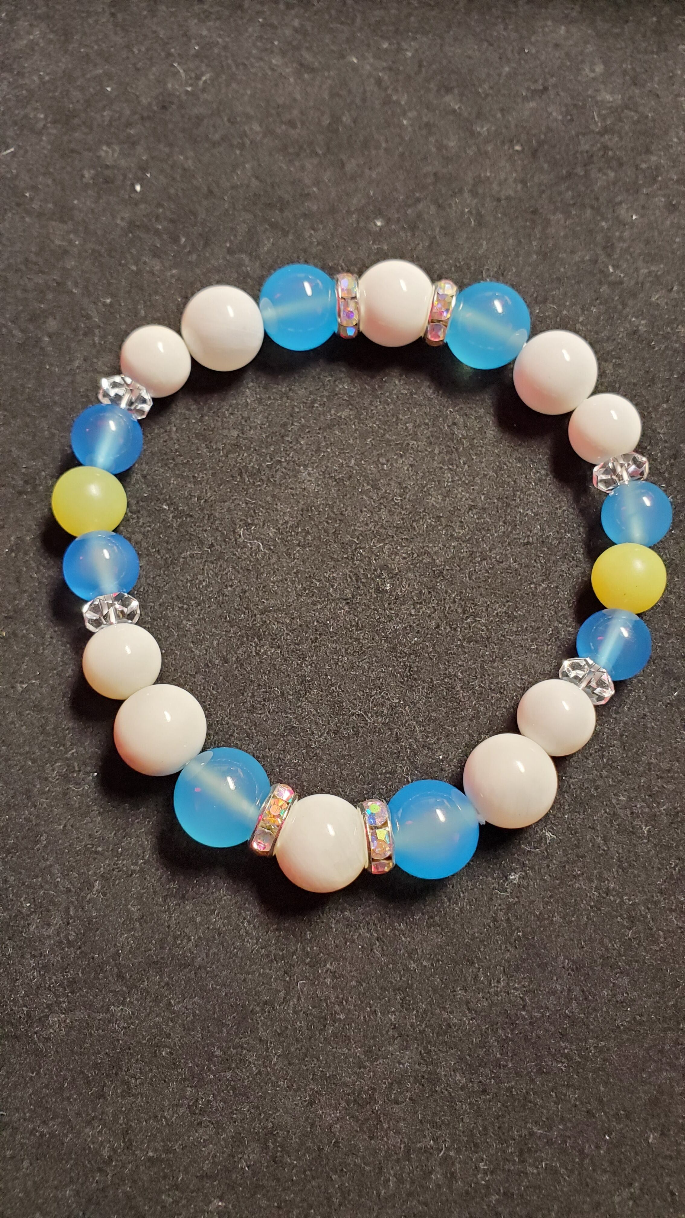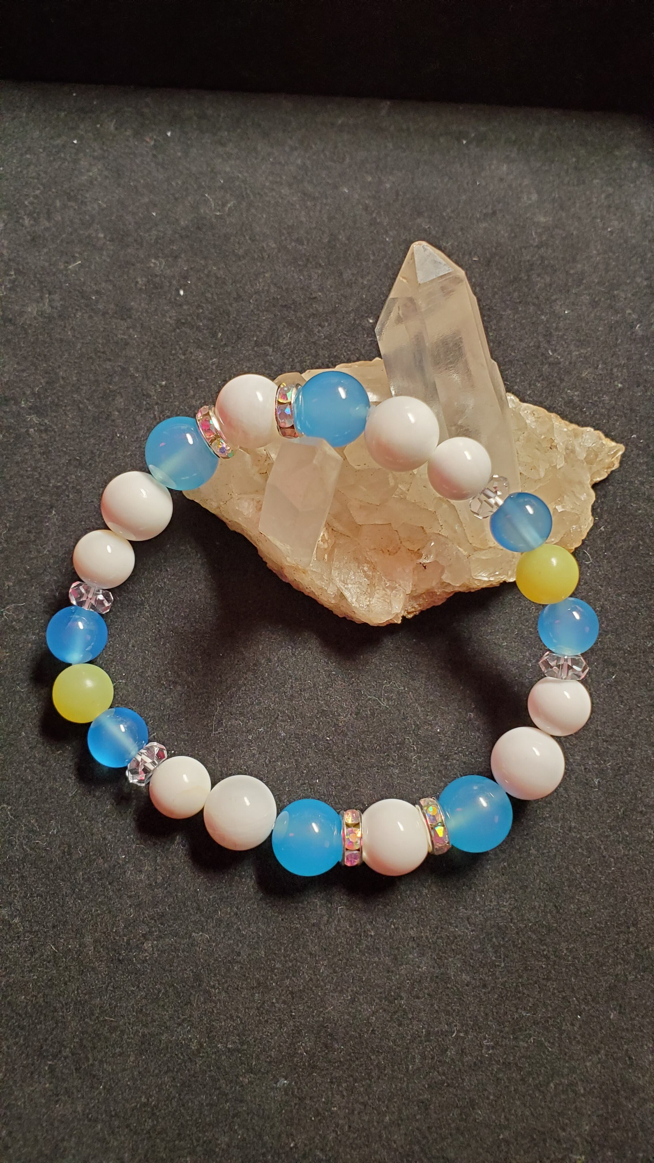 夏らしいオリジナルブレスレットです。内径は、17㎝です。シャコ貝をベースにブルーカルセドニーとサーペンティンを組み合わせました。