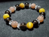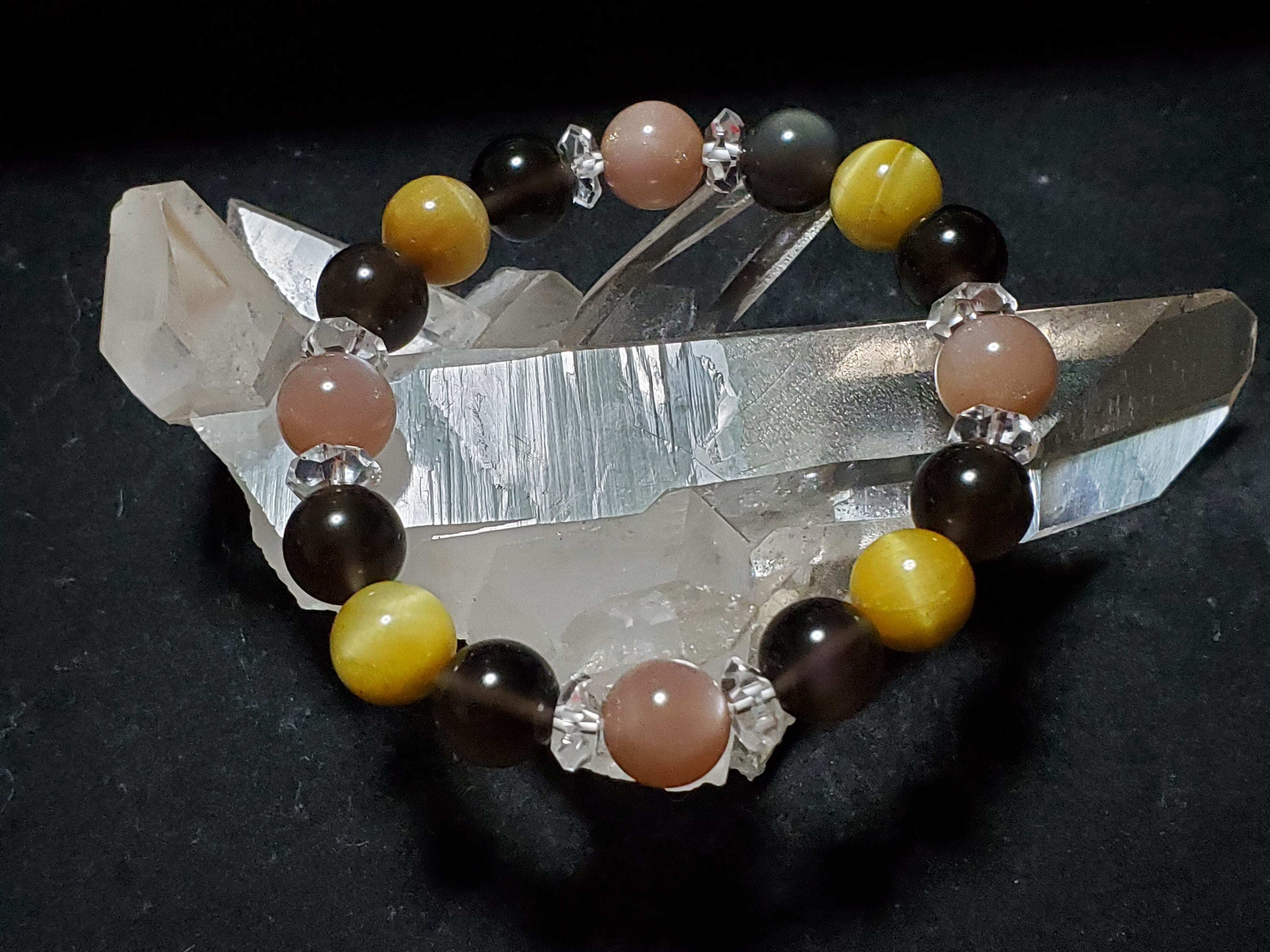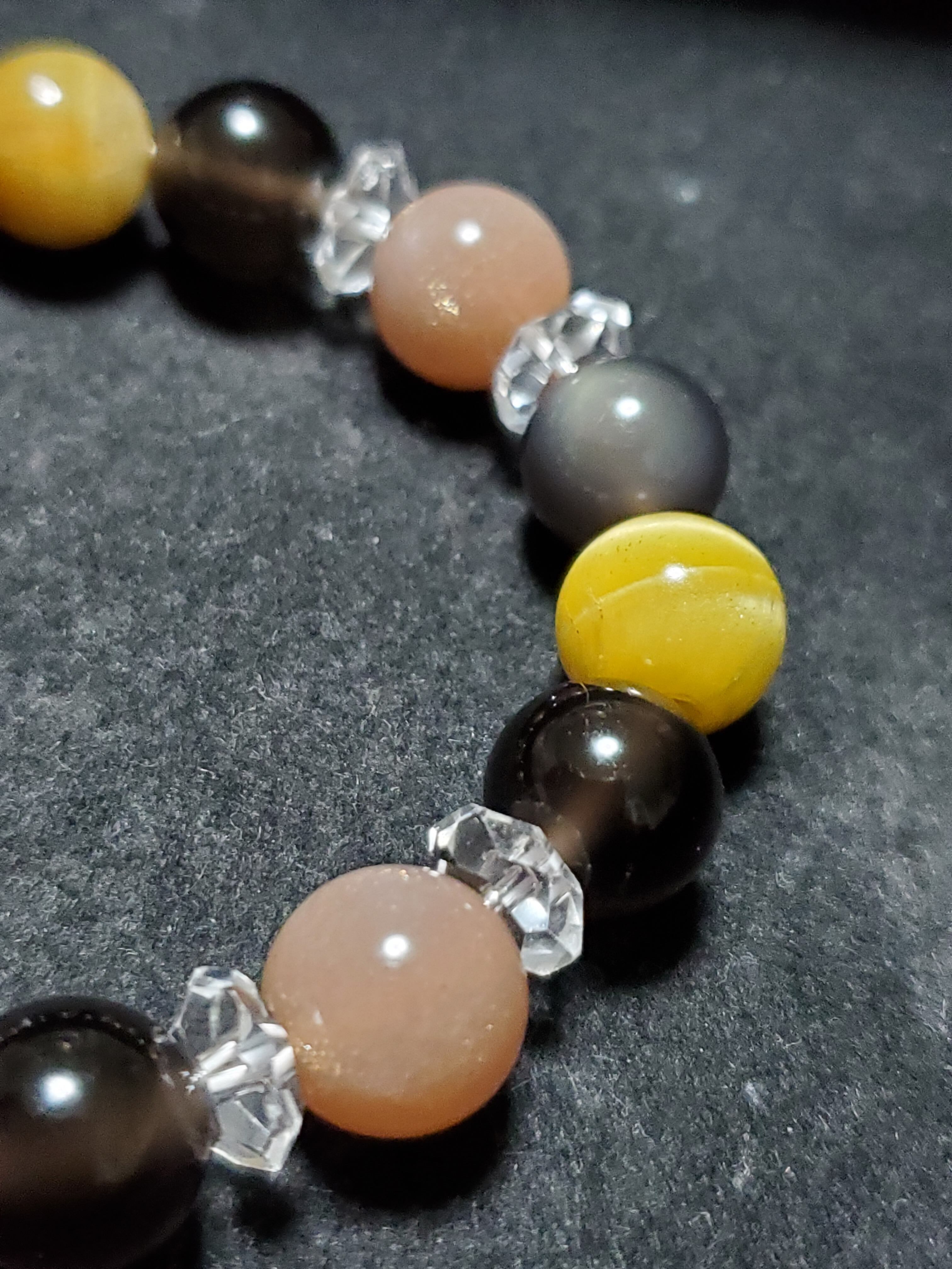 先を見通すという意味合いの天然石を組み合わせました。(アイスオブシディアン、ゴールデンタイガーアイ、オレンジムーンストーン、水晶ボタンカット)