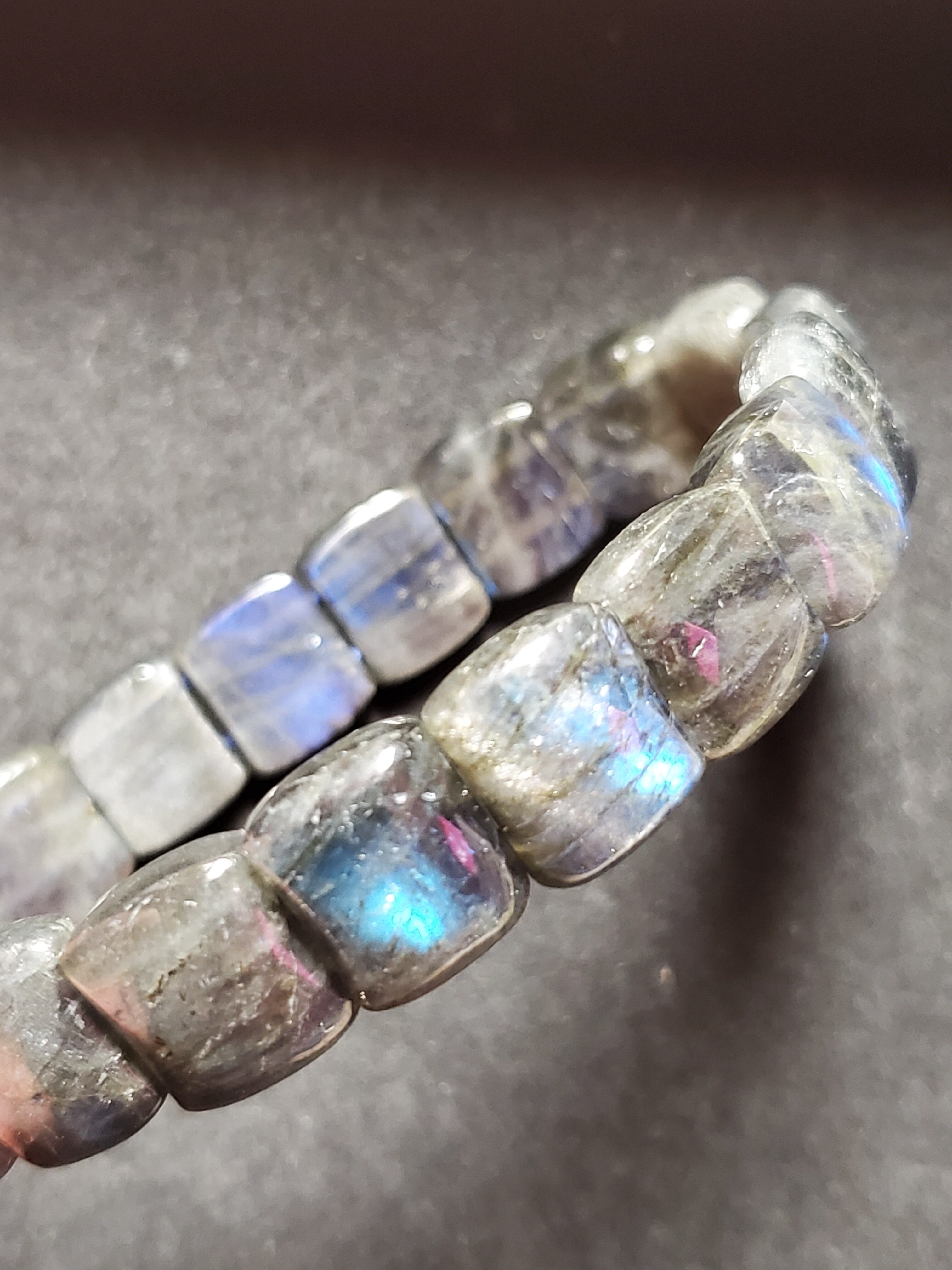月、太陽を象徴するといわれるラブラドライトは、根気強い実行力を養い、信念を貫けるよう導く力があるとされますそして、特に「虹色」の光を持つものは、 「霊性を高める石」として尊ばれ、予知能力や霊的な能力を敏感にし、高次の意識レベルへ到達できるようオーラバランスを整えると言われています。 ラブラドライトの神秘的な輝きは銀河系の惑星から宿ったと言われ、宇宙の叡智を秘めたものとされます。その果てしなく壮大な宇宙空間に広がる神秘のエネル ギーが、人間の意識レベルを超えた鋭いインスピレーションをもたらし、直感力・洞察力・創造性を高めてくれるでしょう。 また、神秘的な波動が強く“魂のルーツ”を象徴する石とも言われ、深く眠った魂レベルでの意識・記憶力を目覚めさせ潜在能力を引き出してくれます。 自信を失いかけた時に、生まれた意味・生きる意味を探し求める人の魂にそっと語りかけ、真理の追求し魂レベルでの自己への探求へと導きます。 魂の成長を促すことで抑圧された感情を解放し、今を生きる力を引き出してくれるのです。エネルギーを良い形で循環させるラブラドライトは、ネガティブなエ ネルギーを除去するのにも有益な石で、ストレスや悪いエネルギーからの要因で起こる精神的な損傷に対しても素晴らしい癒しを施してくれますよ。 自分に合う仕事・環境・人脈を引き寄せるパワーがあるので、転職や就職、自分と価値観の近い人や共通点を持つ人に出会いたいと願う時に力を貸してくれる石 です。