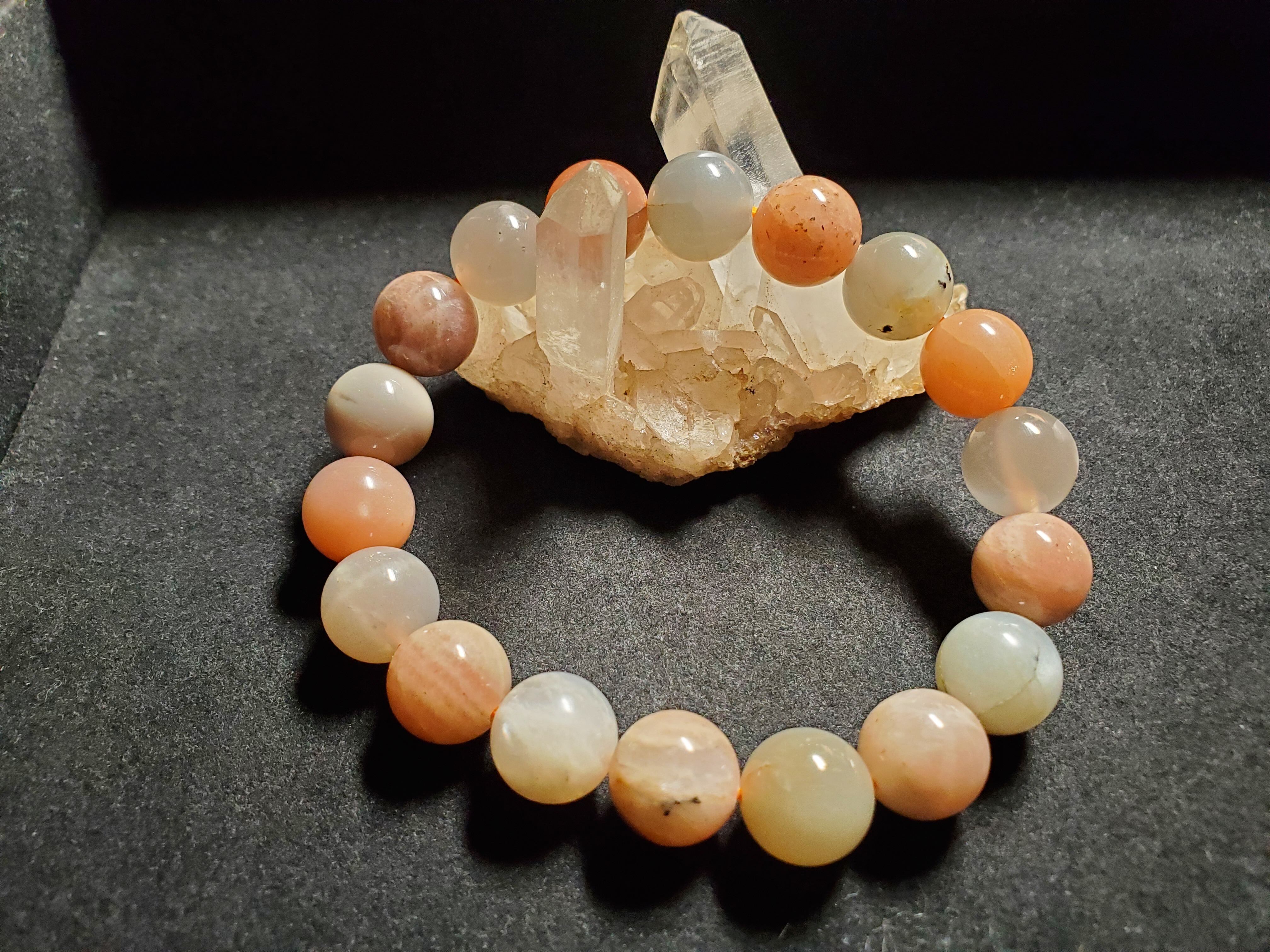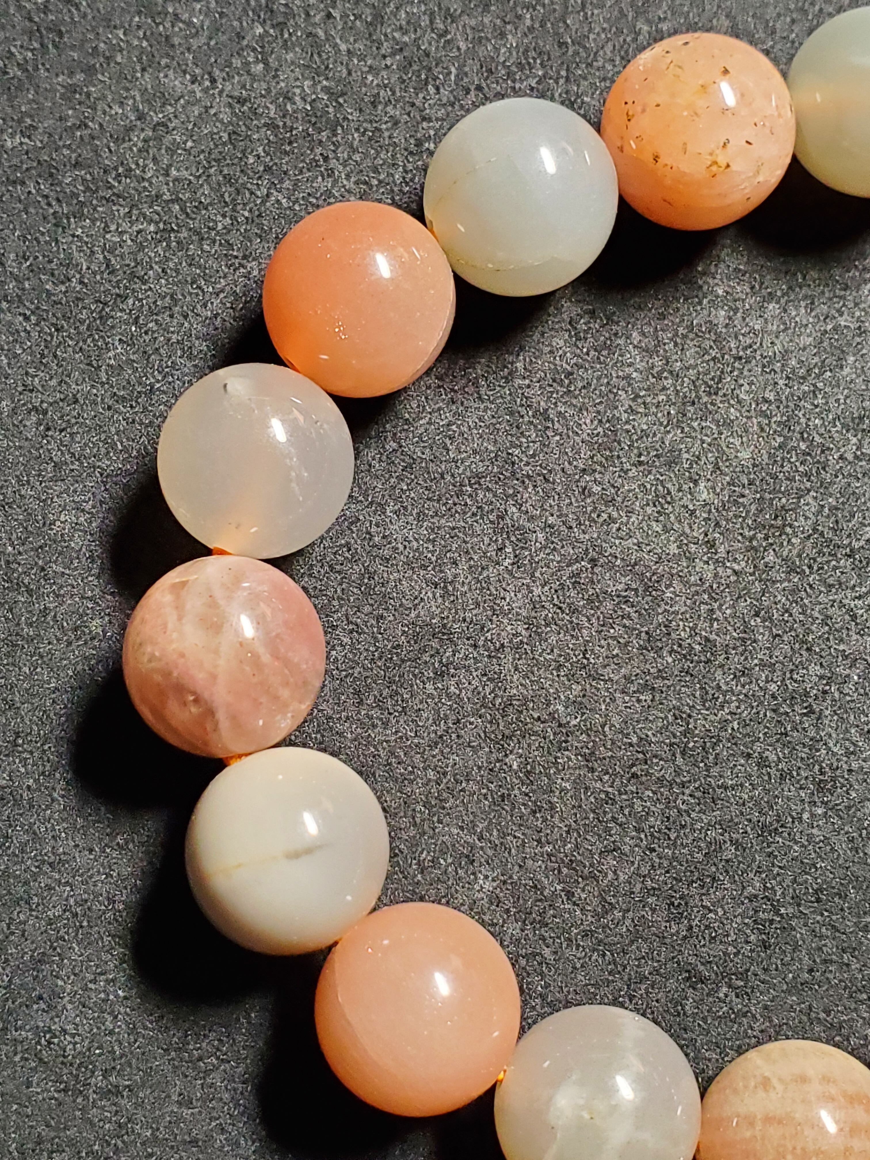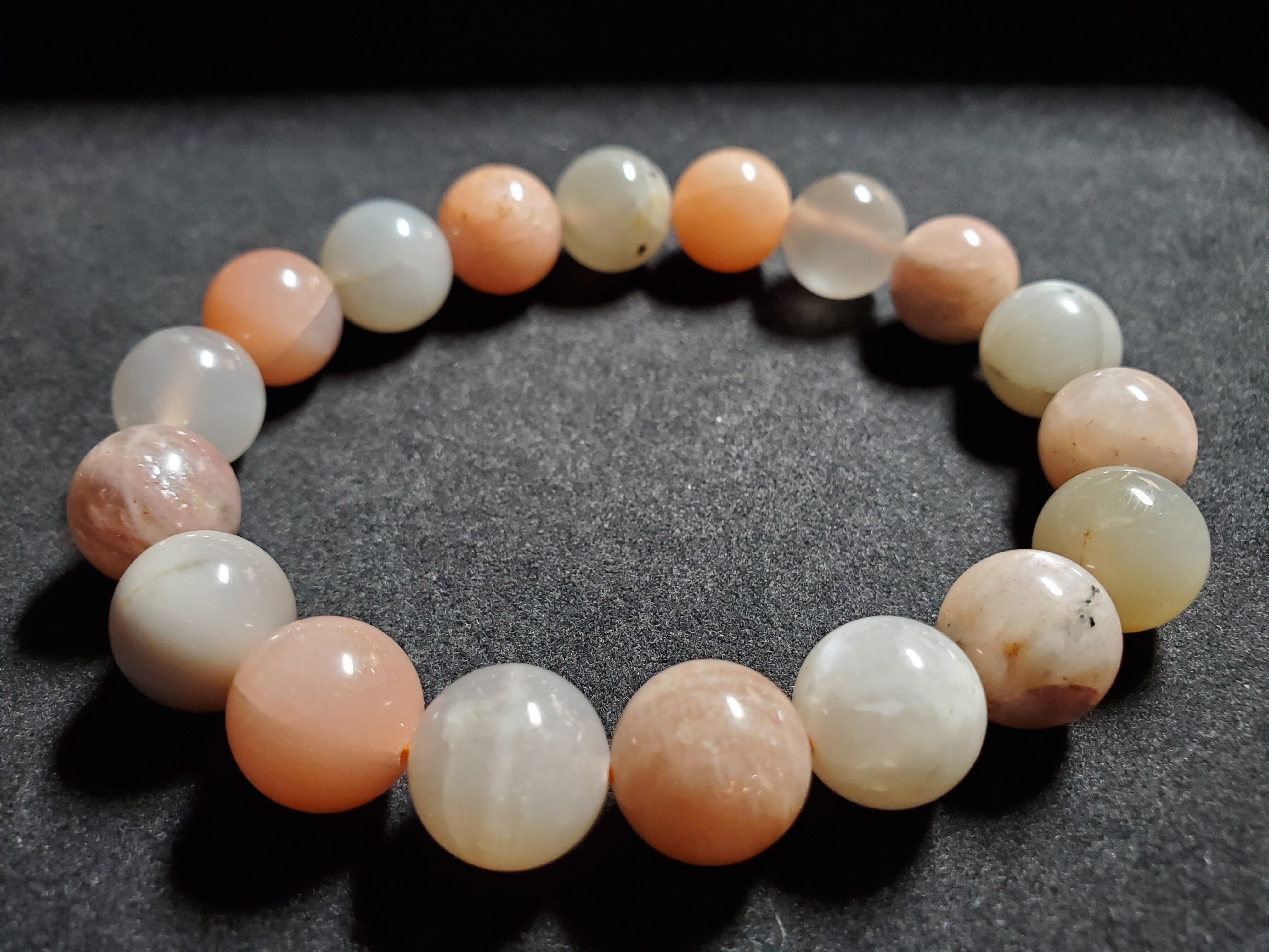 12㎜のミックスムーンストーンのブレスレットです。内径は17.5cmです。ホワイト、オレンジ、グレーなどのムーンストーンのシラーが輝きます☆