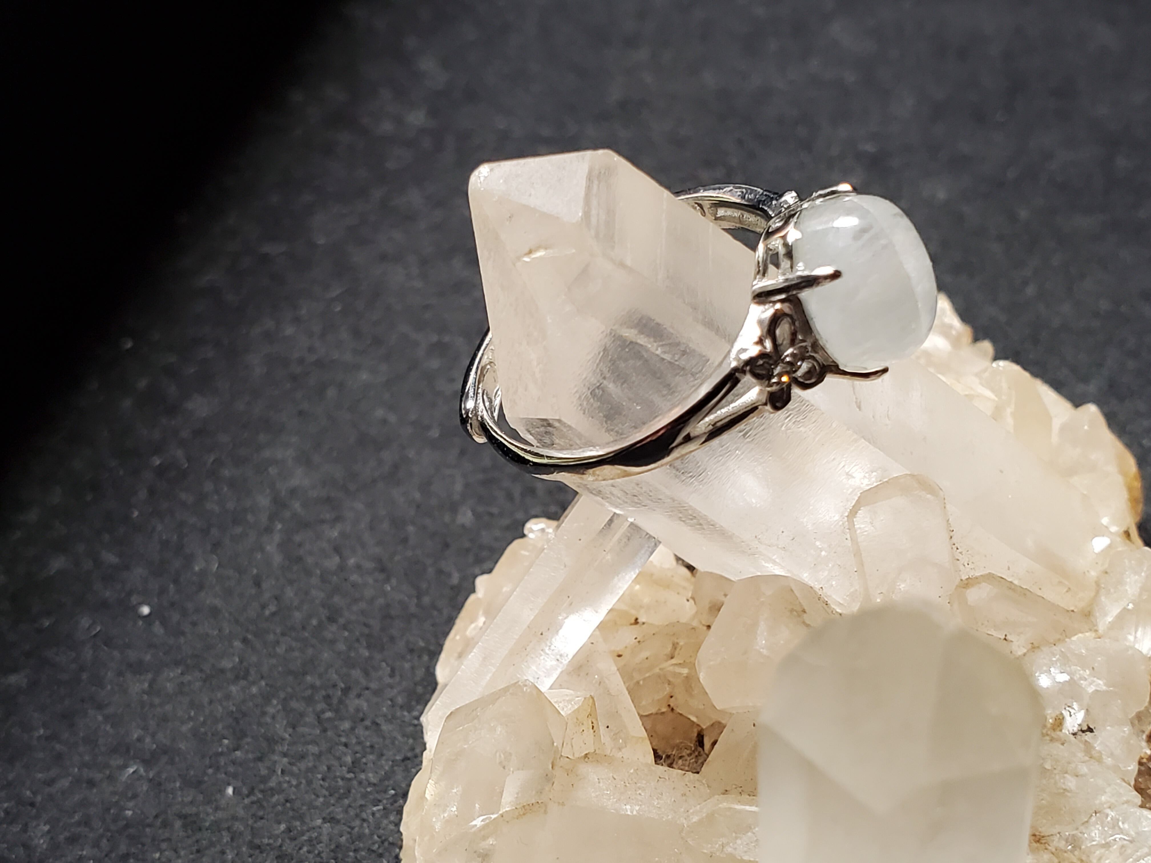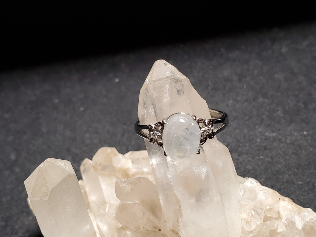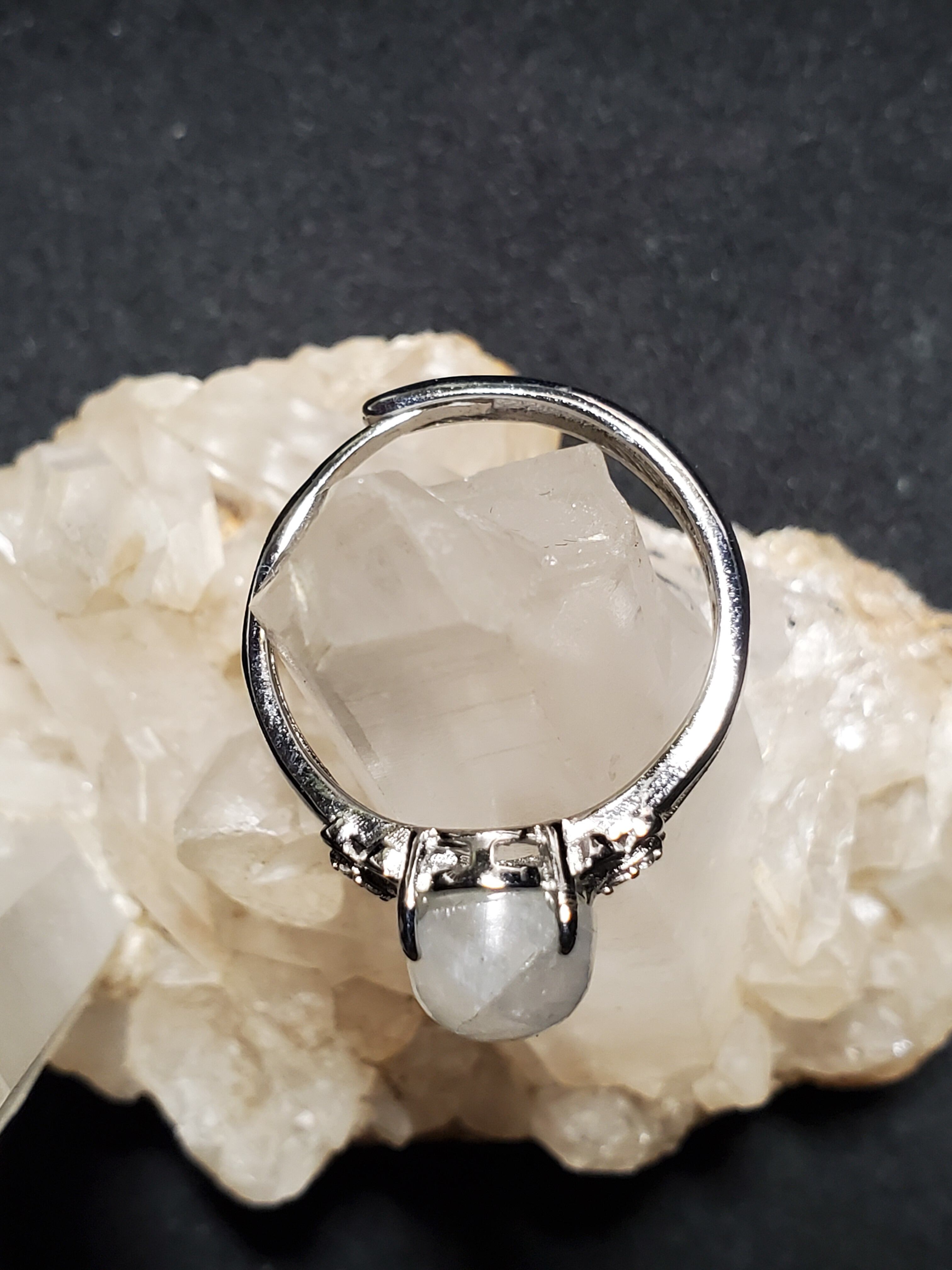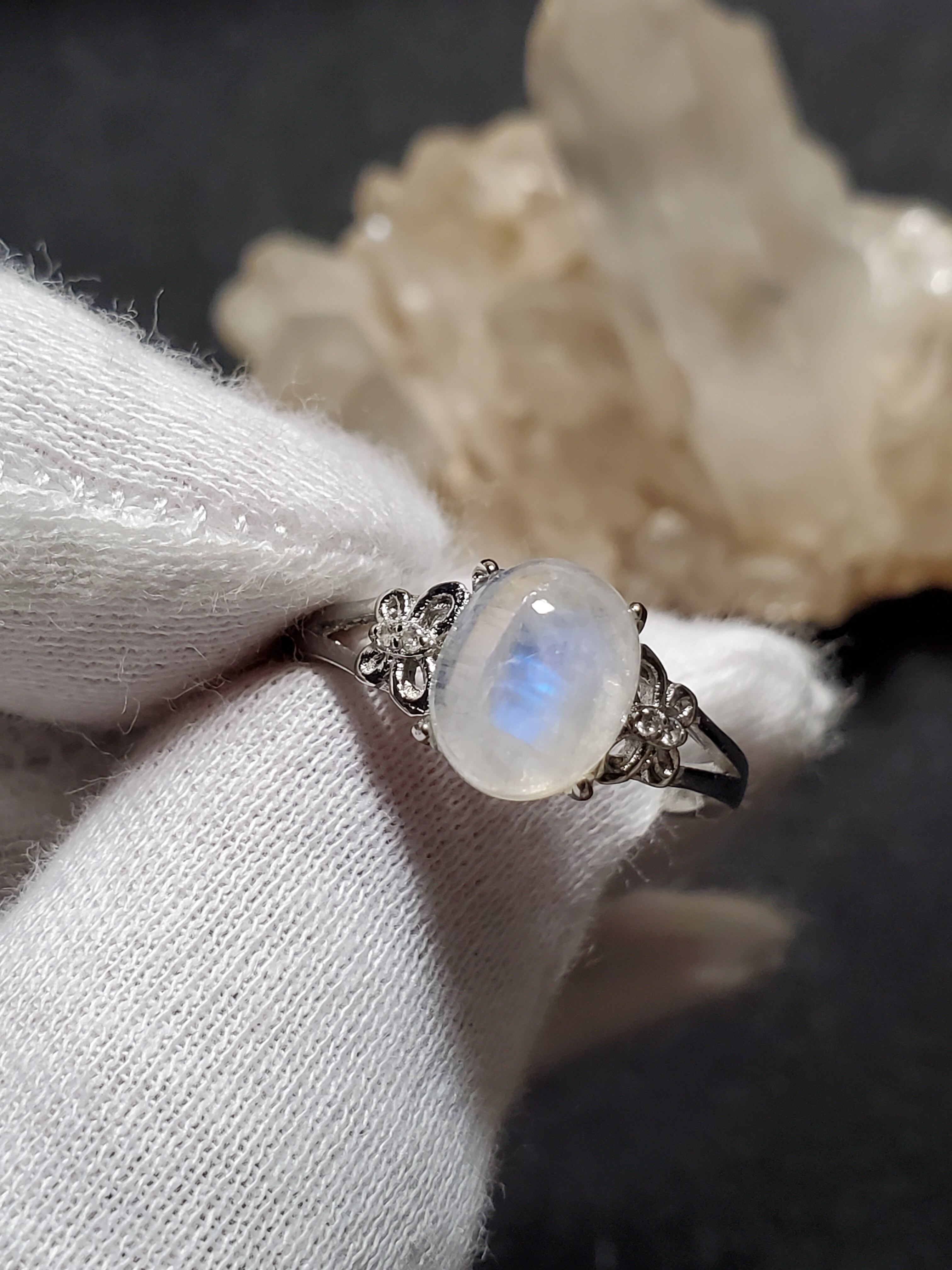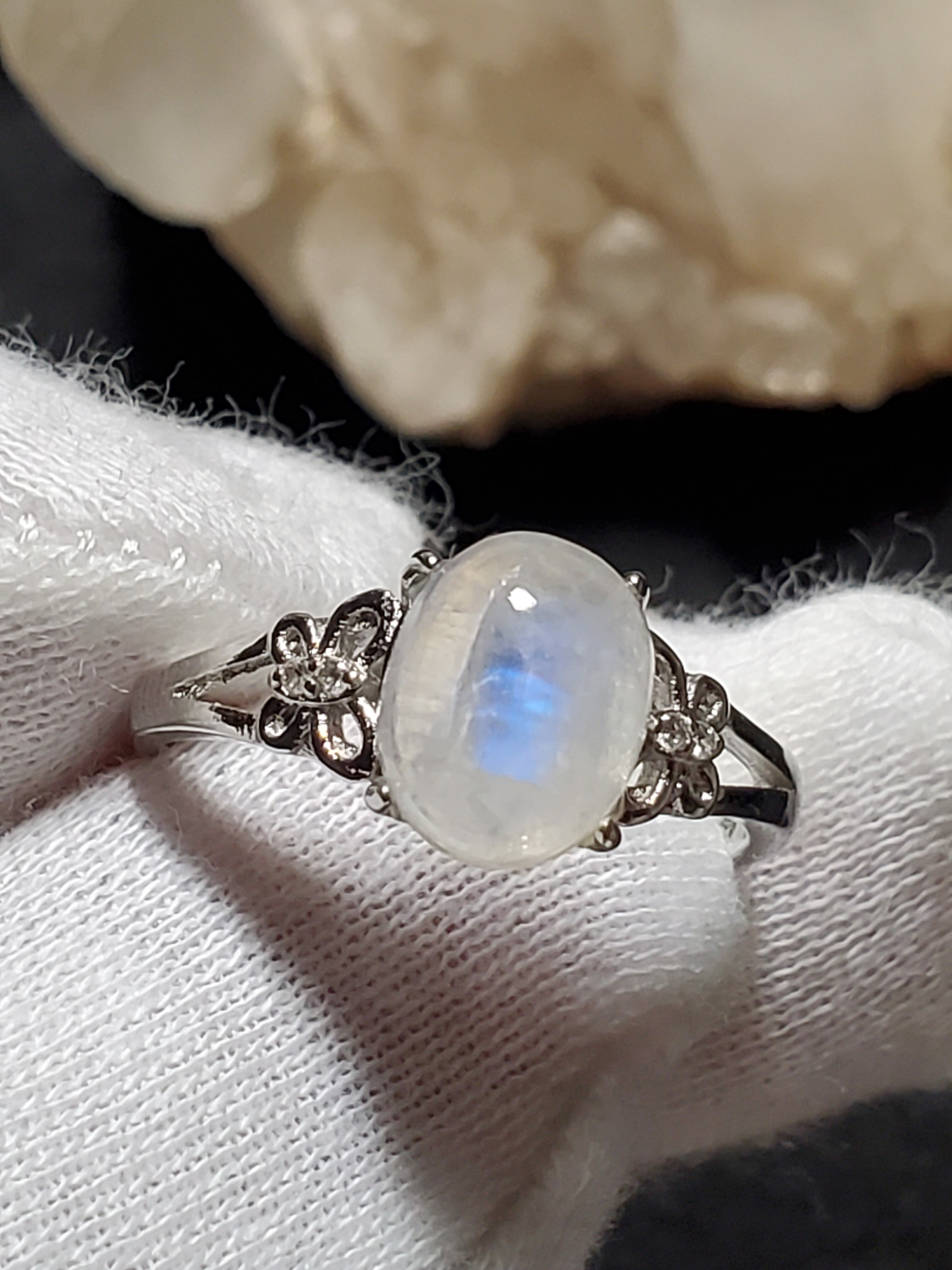 ブルームーンストーンのリング(16号)です。青いシラーが出る透明感のあるムーンストーンです。