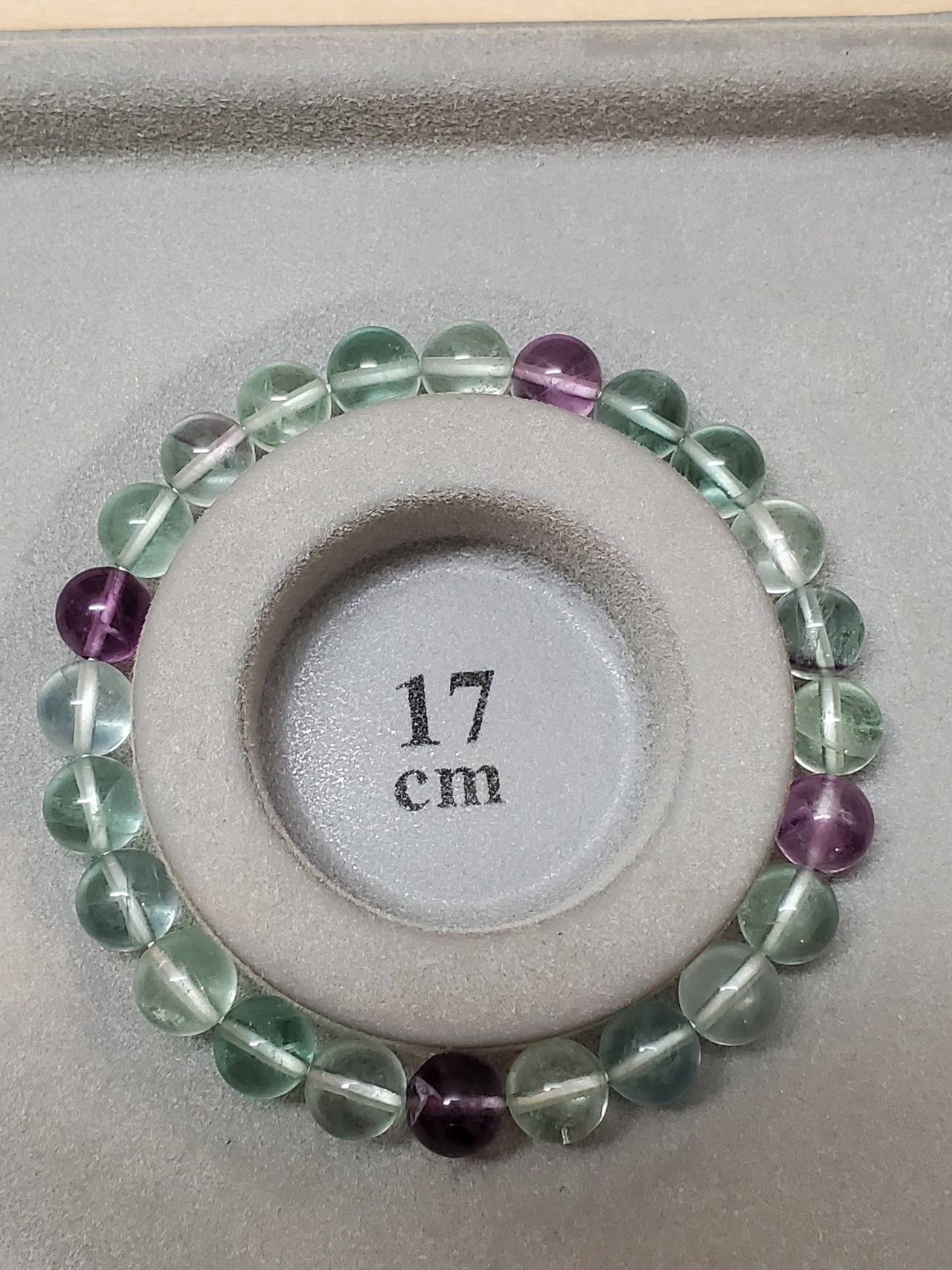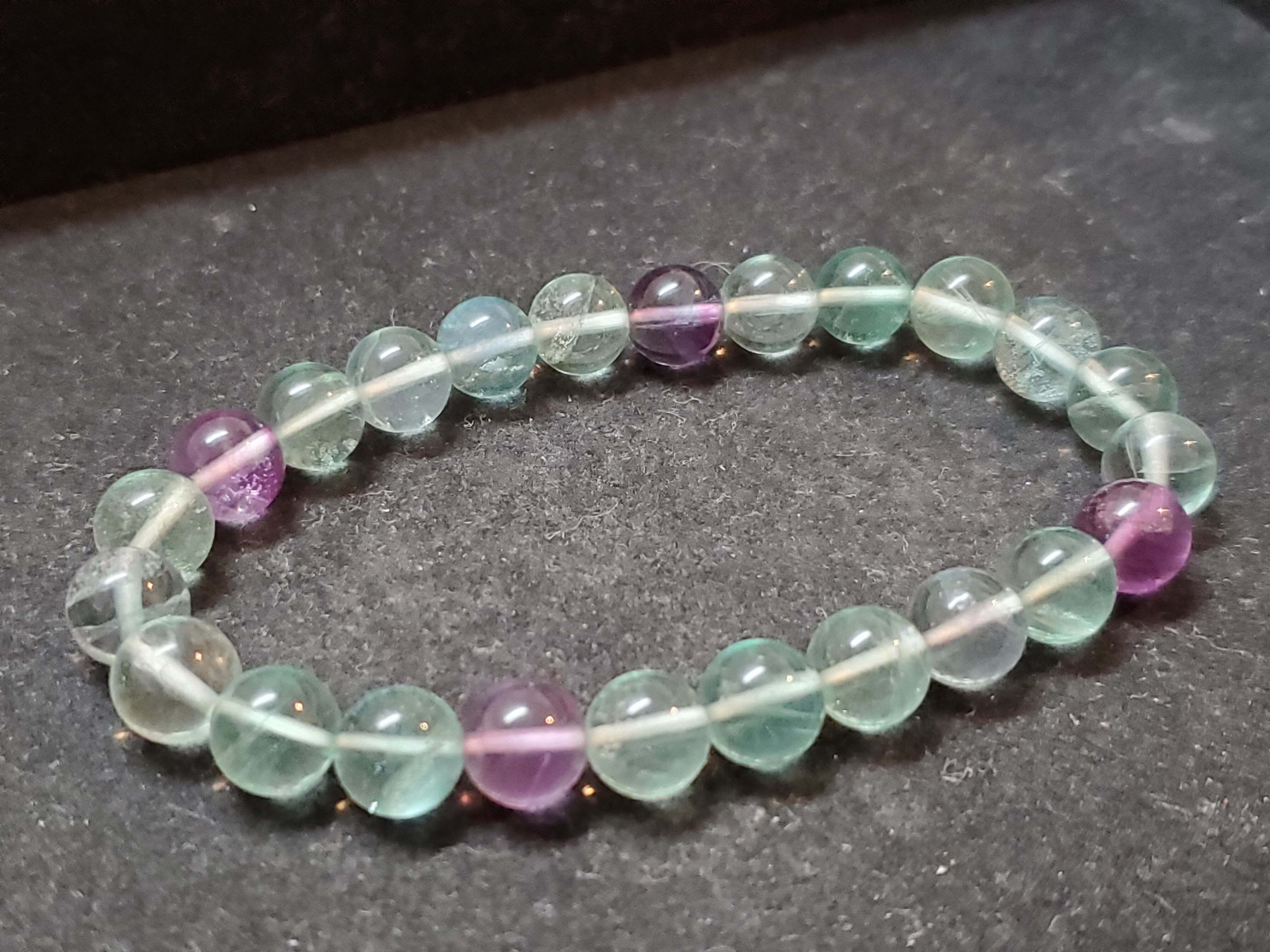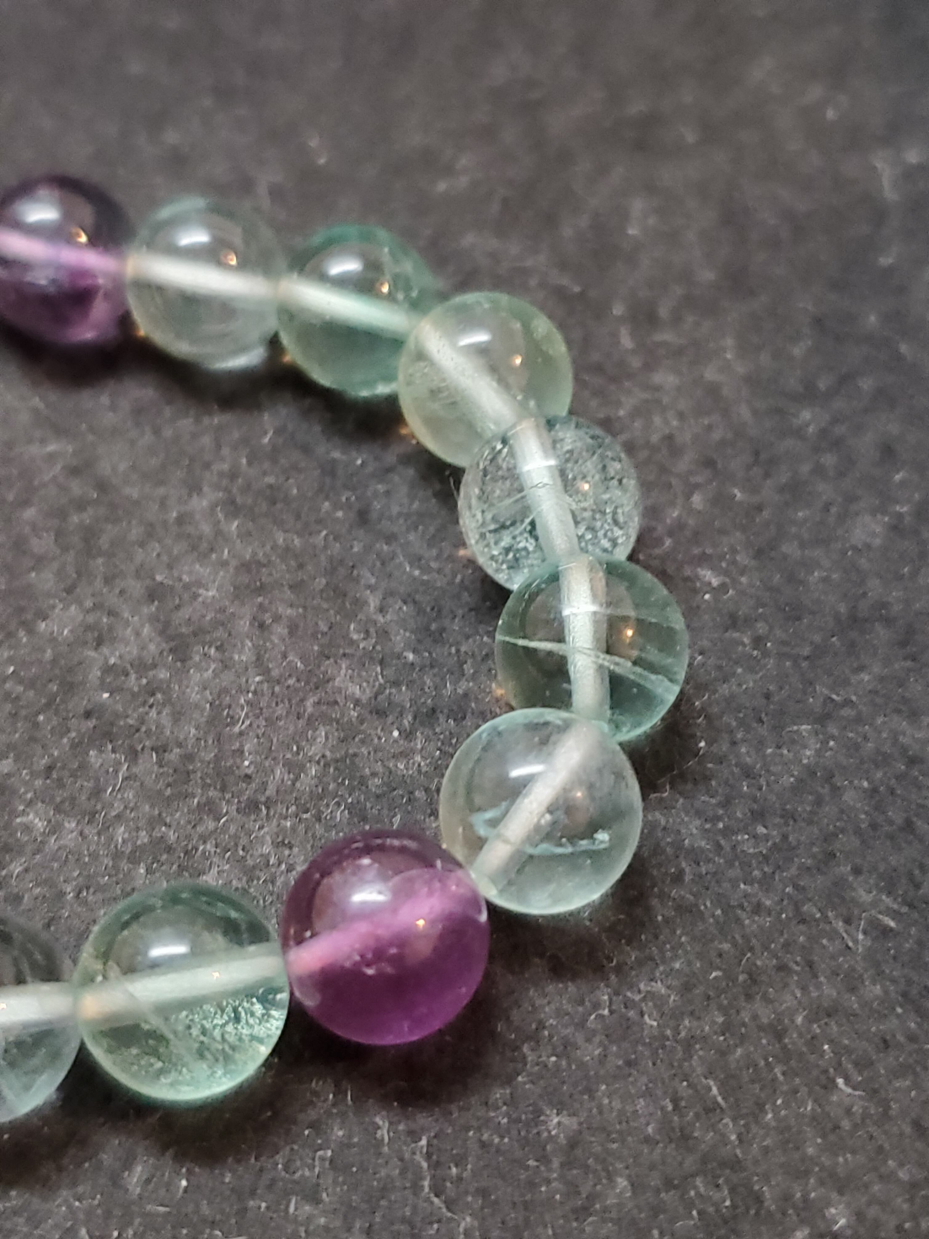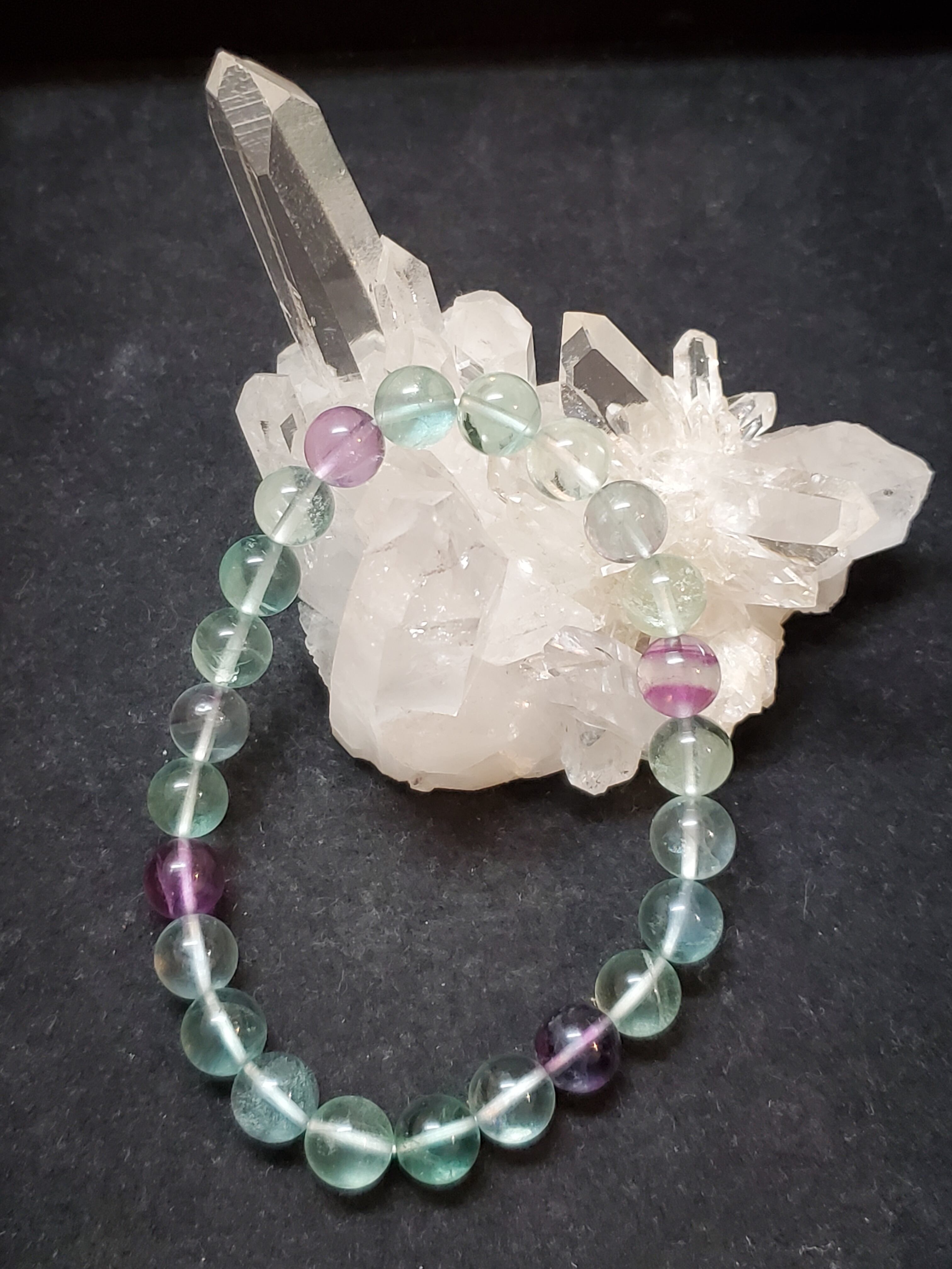 フローライトは色別にエネルギー的特性が多少異なります。あくまでも傾向としてですが、パープル系は明晰性や感受性を高める傾向、グリーン系は癒し的に働き、グラデーションカラーのものは、想像力を高める傾向が強いようです。