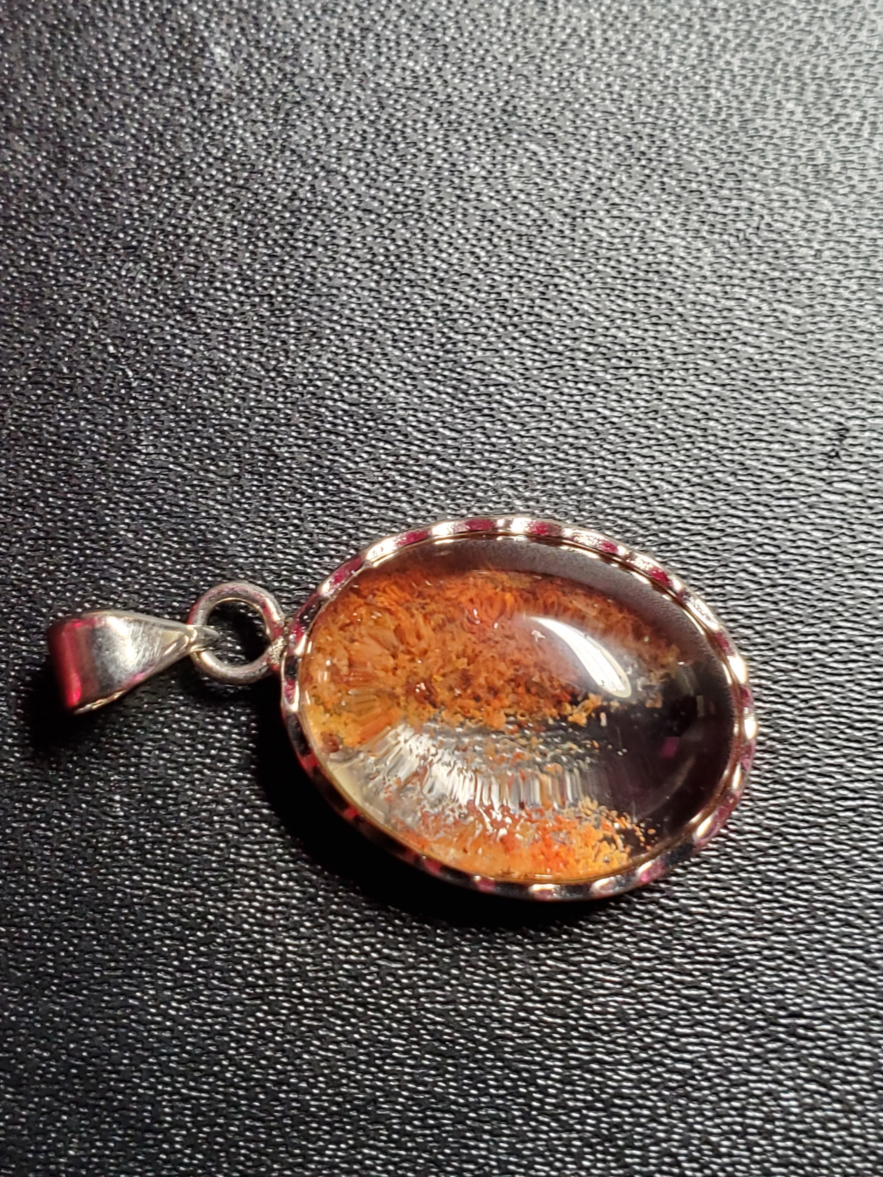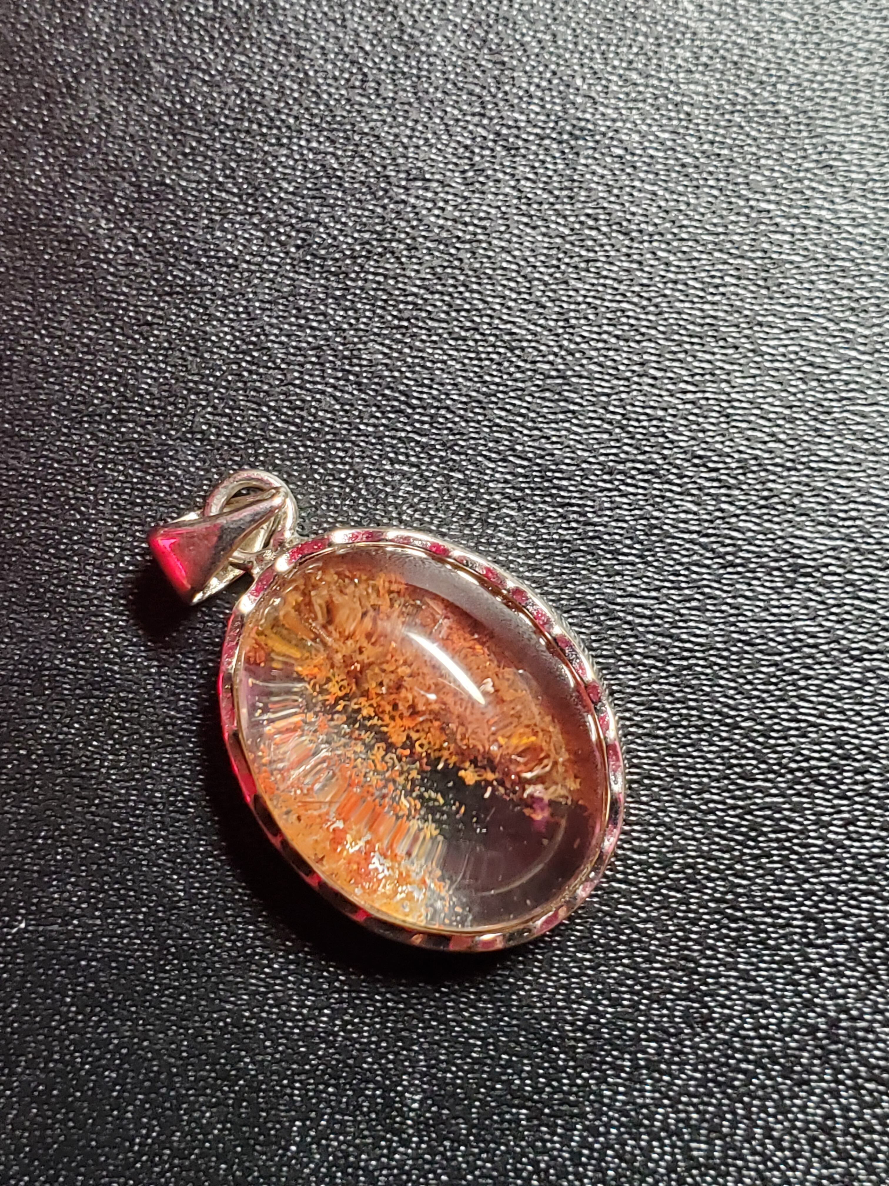 大きさは、約21㎜です。ブラウンオレンジの内包物です。水晶の透明感は高いです。