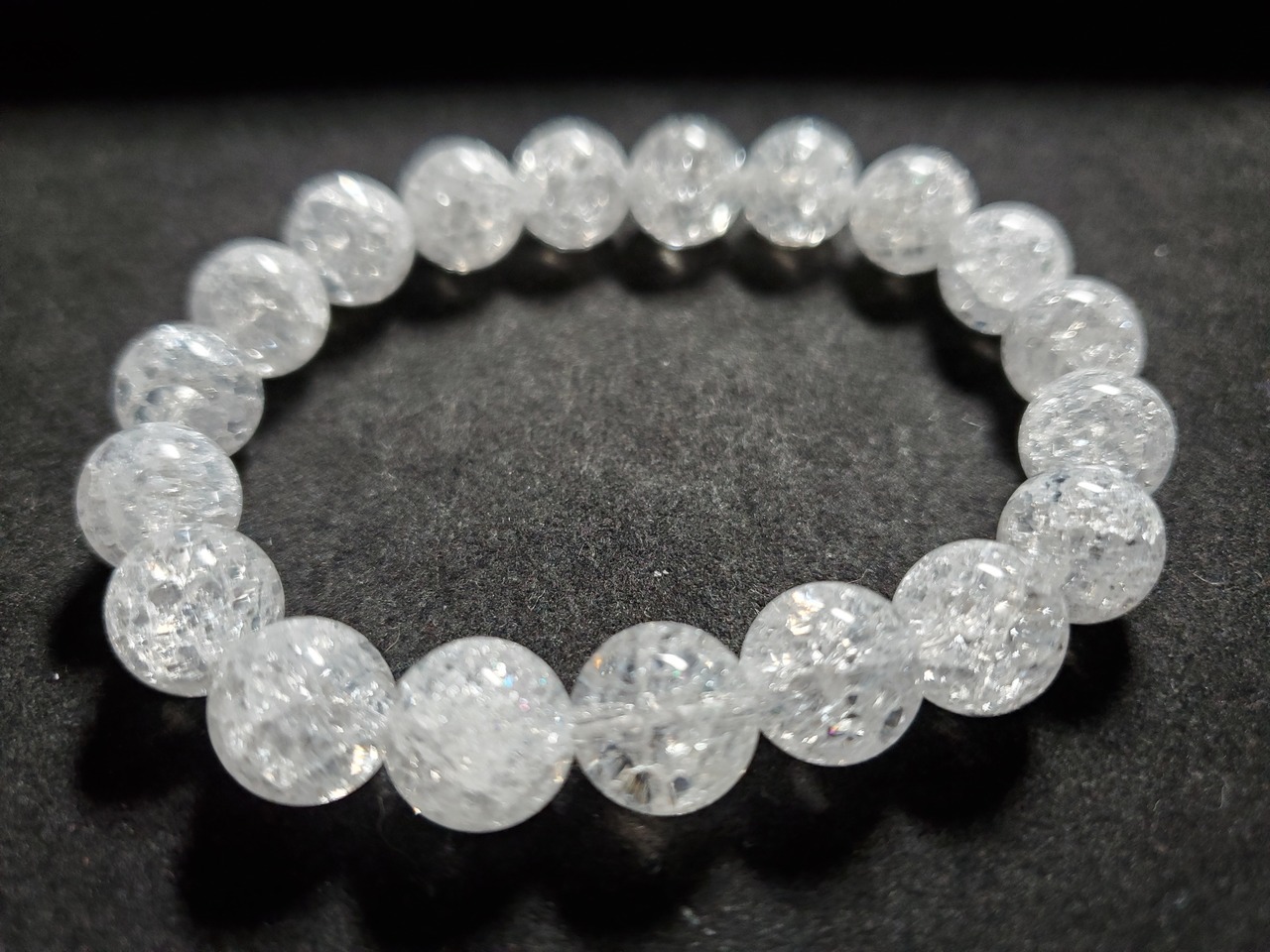 光の角度によってあらわれるクラックの輝きが魅力のクラック水晶。水晶にクラックを人工的に入れて輝きを出していますが、クラックの輝きは一粒一粒異なります。クラックの輝きがきれいに出ているもののみを厳選してブレスレットに仕上げました。