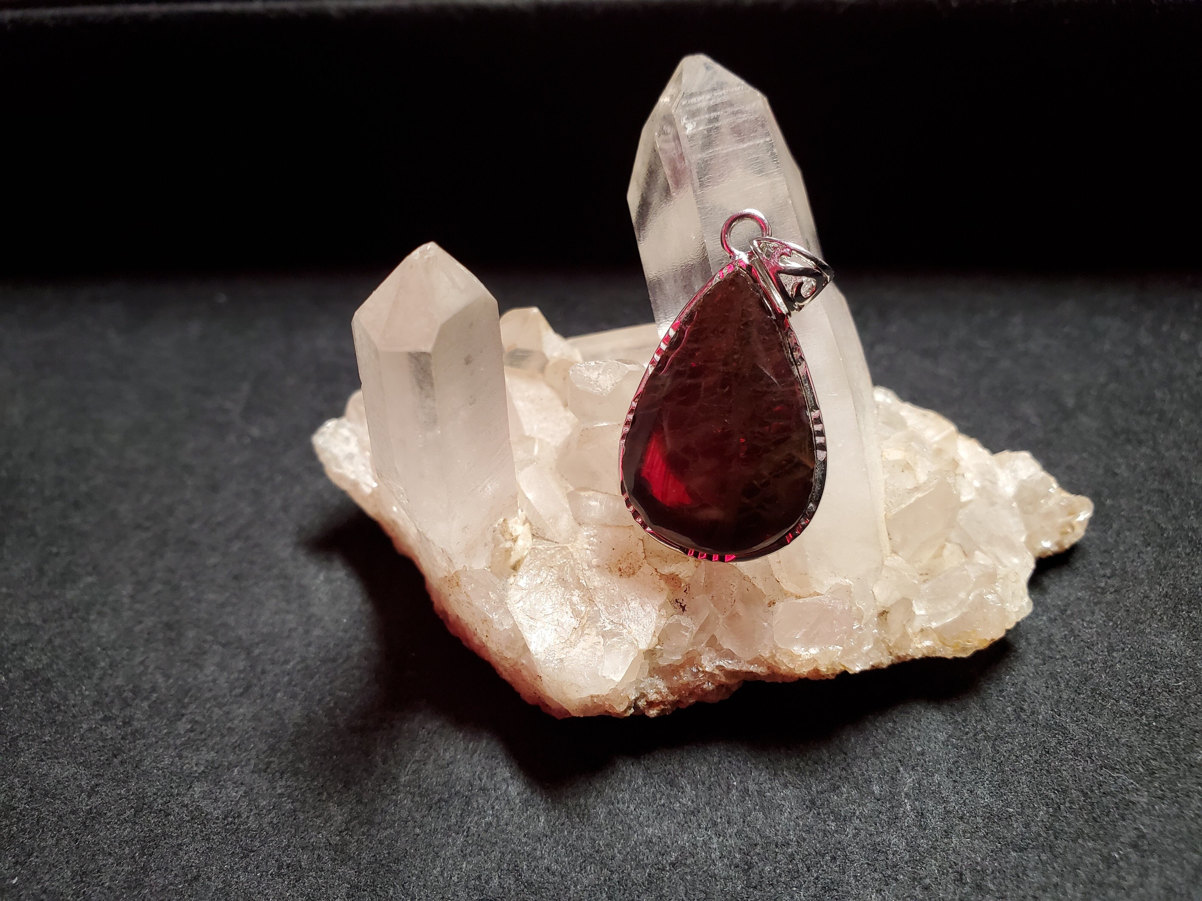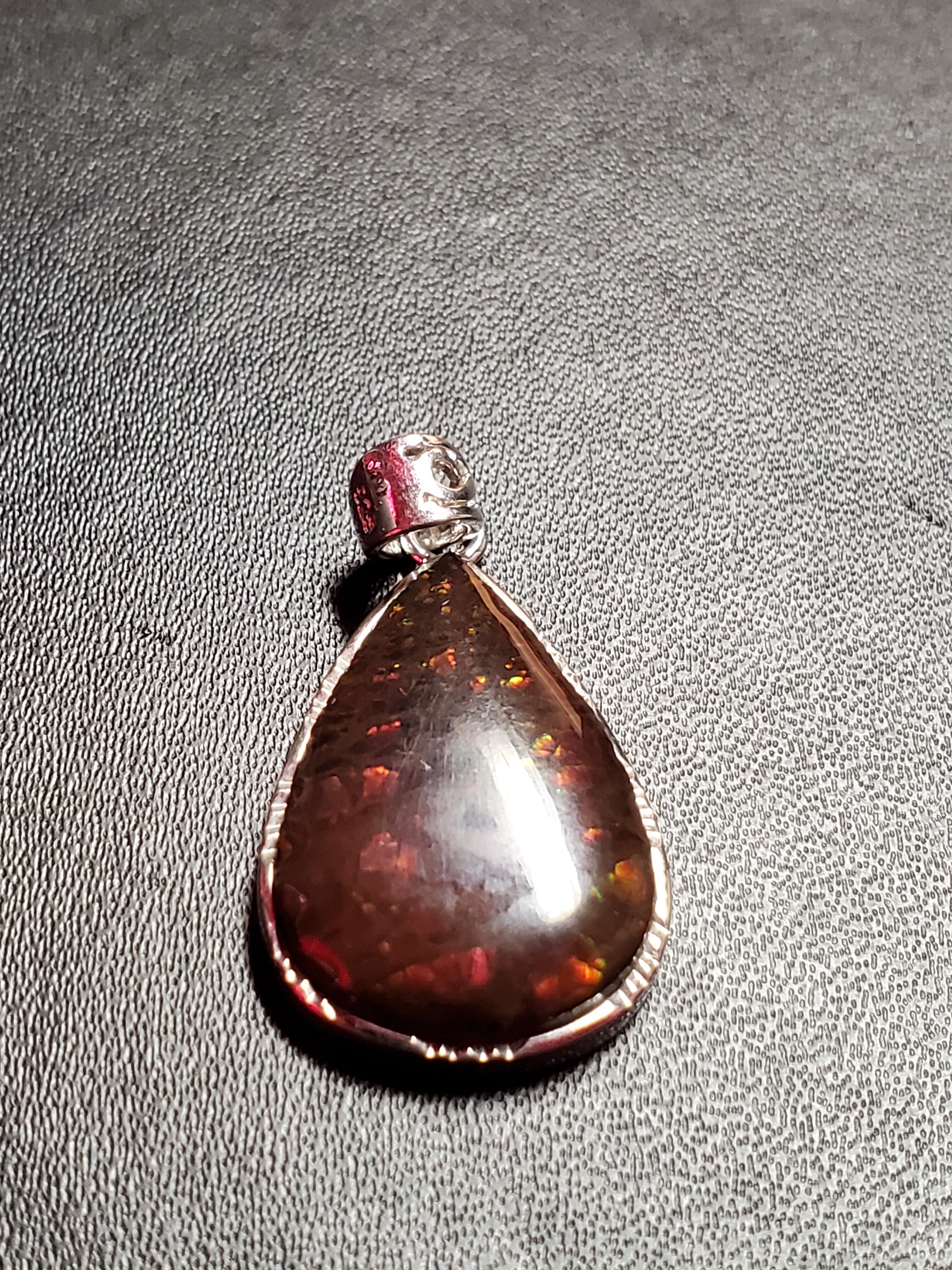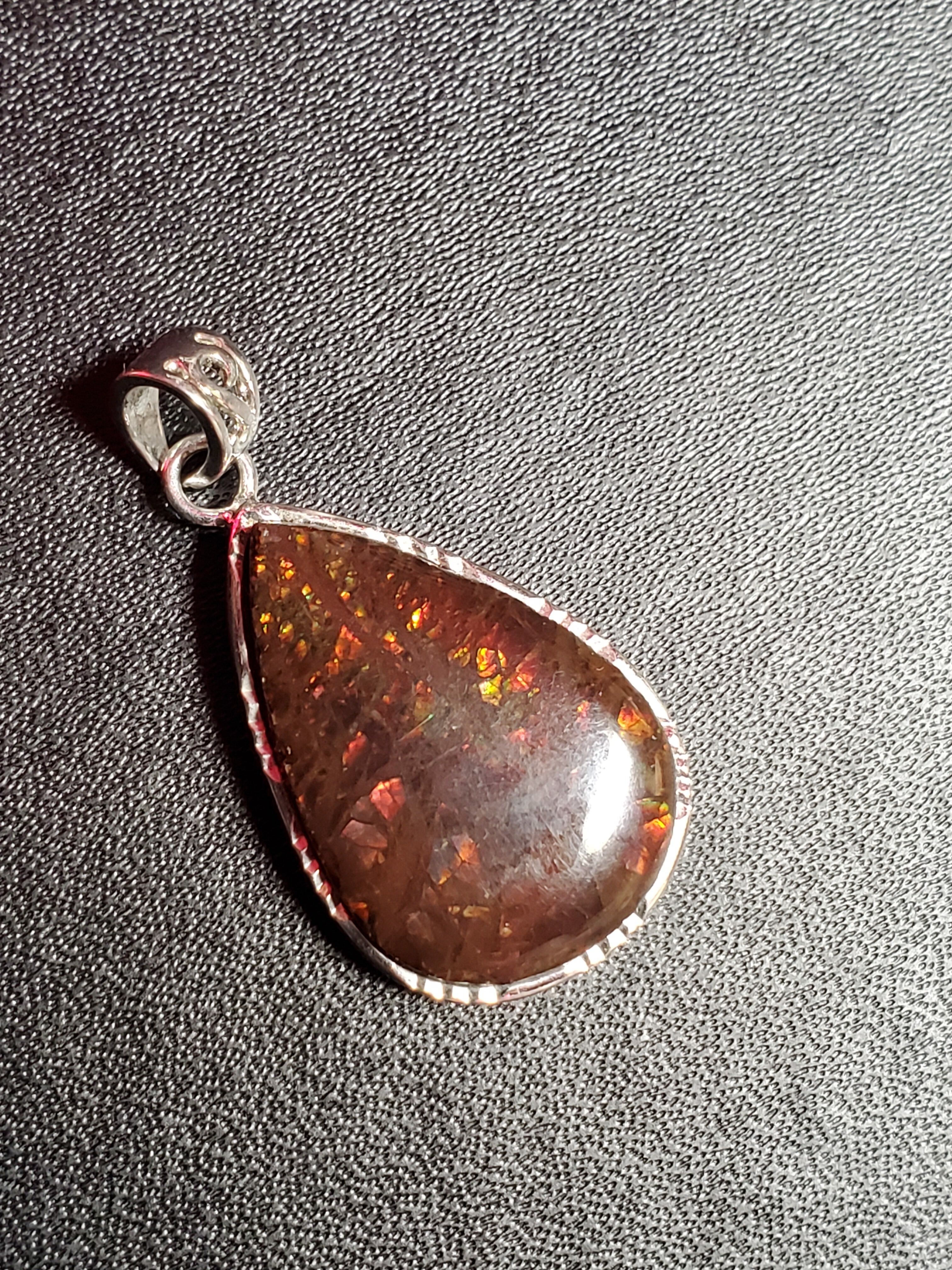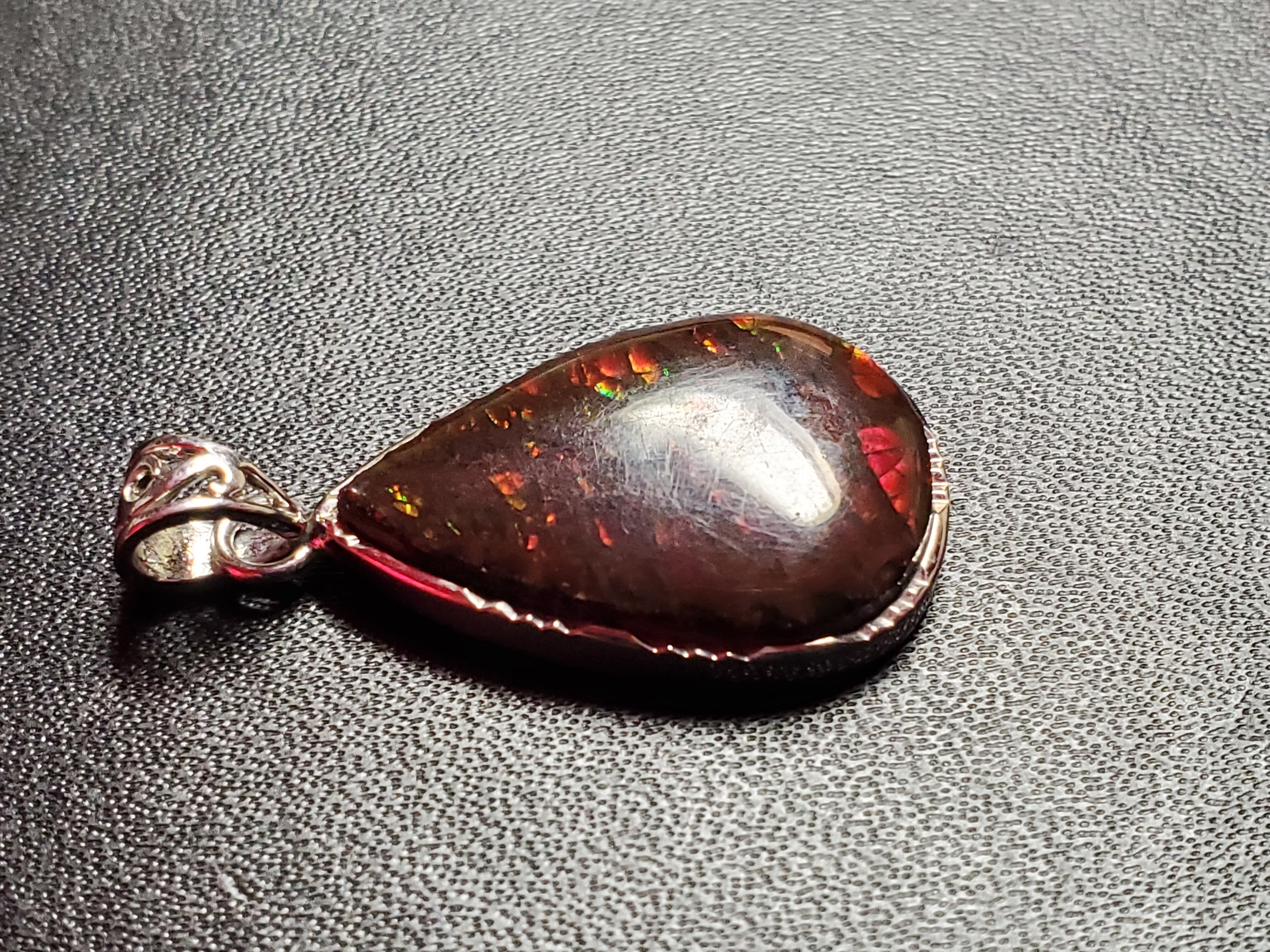アンモライトのペンダントトップです。赤い遊色が綺麗に輝きます。