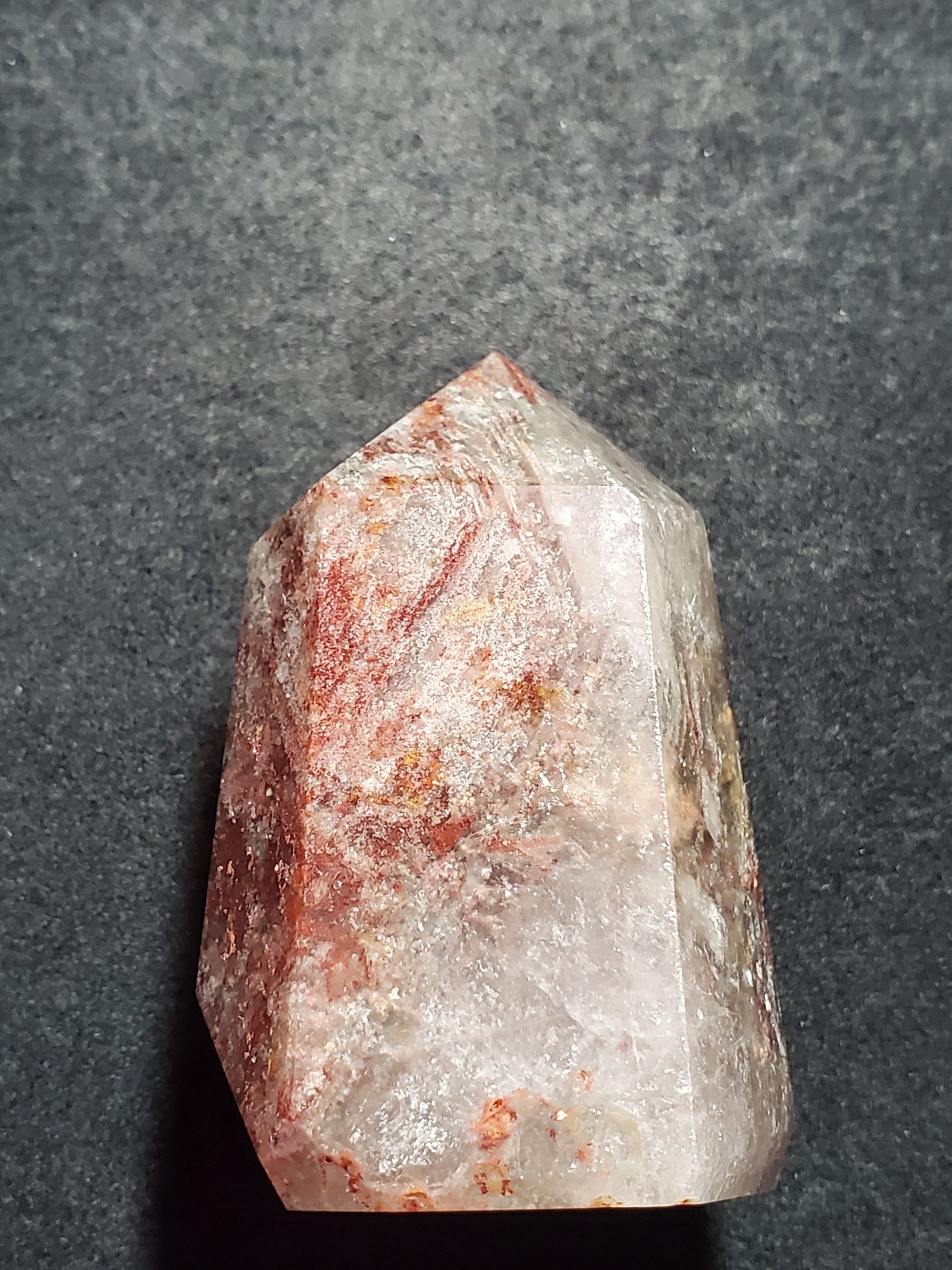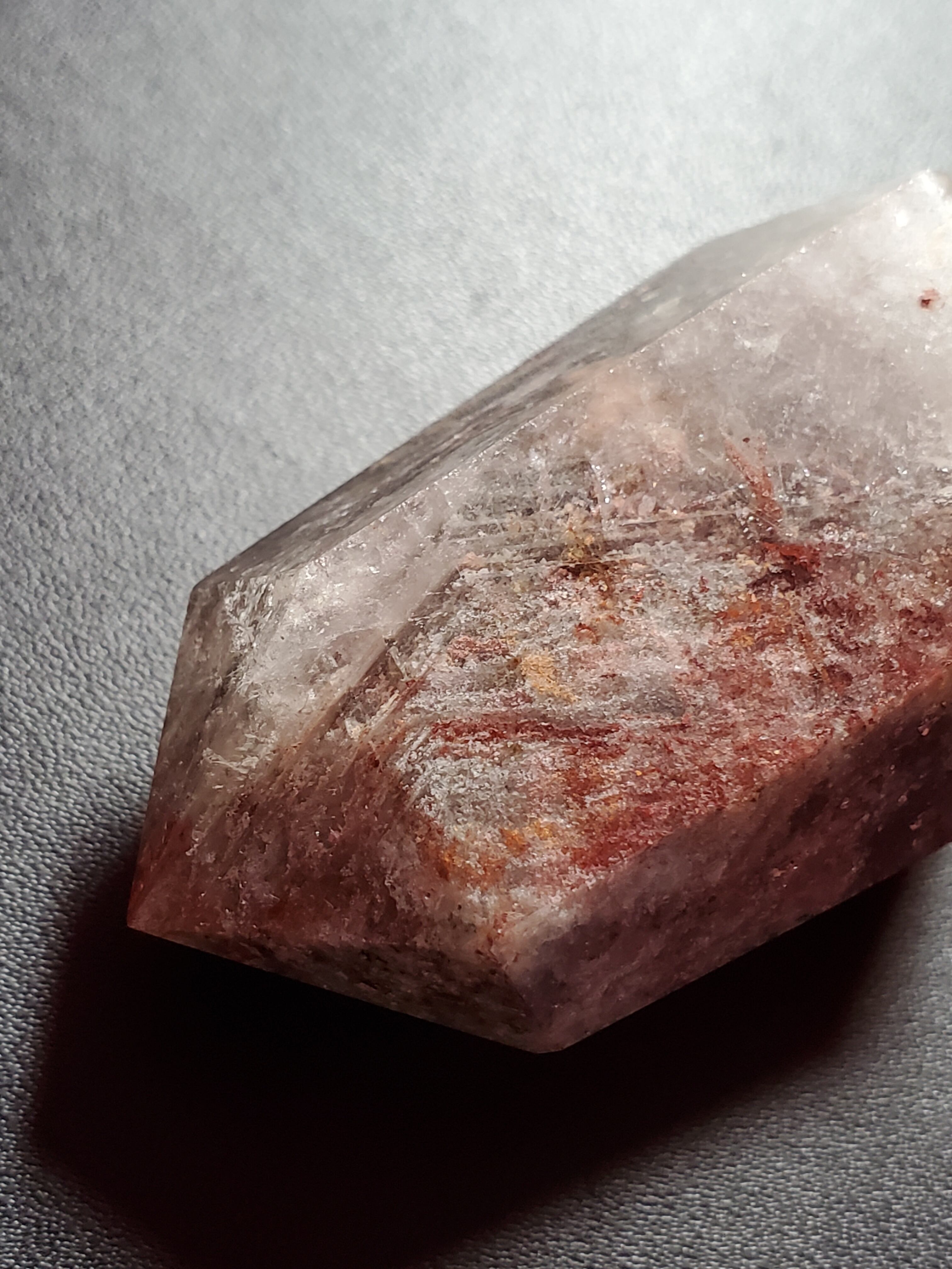 ひとくくりにガーデンクォーツといっても、その表情や種類は様々です。茶色い内包物が含まれるもの、緑色の内包物が含まれるもの、その両方が含まれるもの、さらにファントムが見られるものもあります。ファントムとは、水晶が成長していく過程で地殻変動などのショックが加わり、水晶の成長が一時的に停止した際に、その表面に別の元素が付着し、さらにその後長い年月を経て、水晶が再び成長を始めたために、結晶の中に斜めや三角、山型の像が模様として残る現象を言います。ファントムタイプのガーデンクォーツは、自らの成長の記憶を内部に刻み込んでいるため、持ち主の潜在能力を引き出し、成長を促してくれると伝えられています。