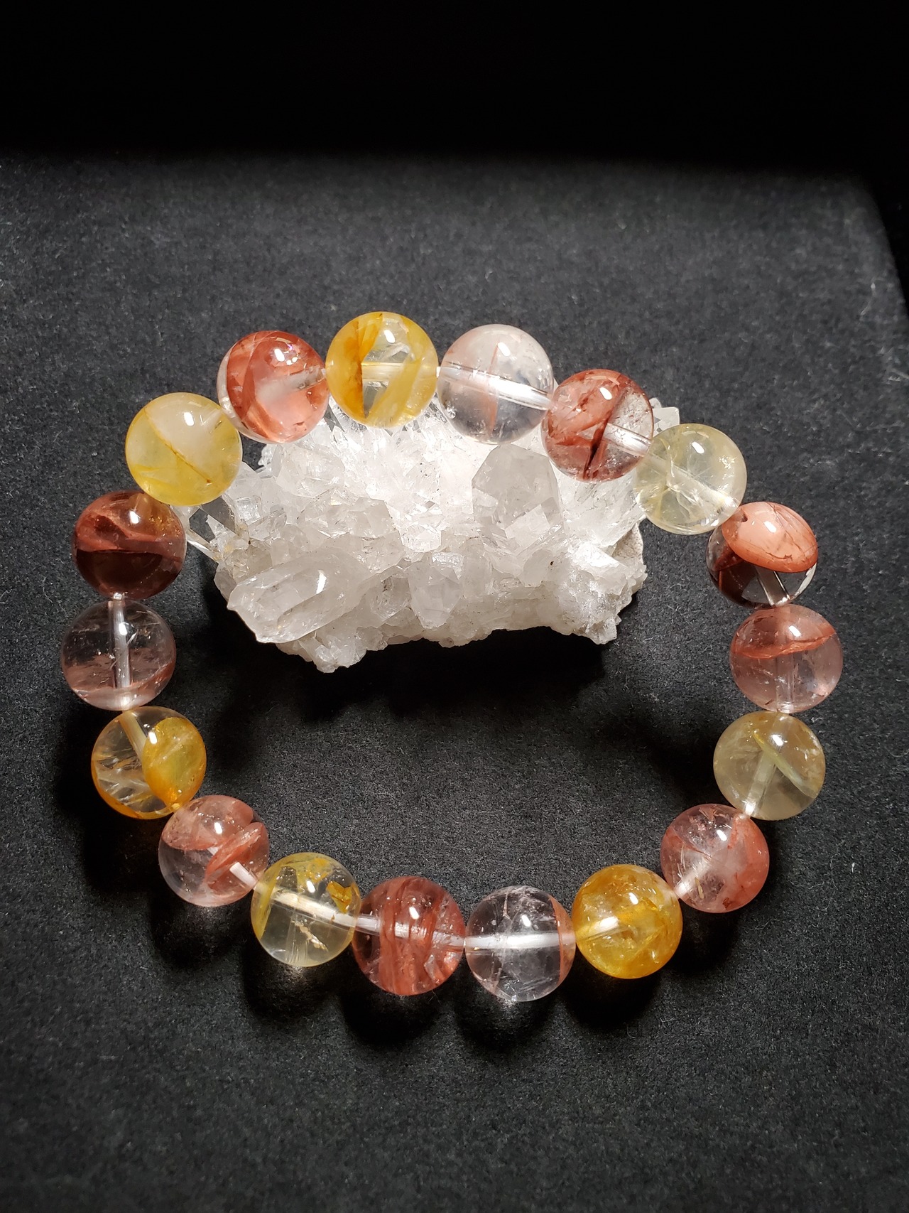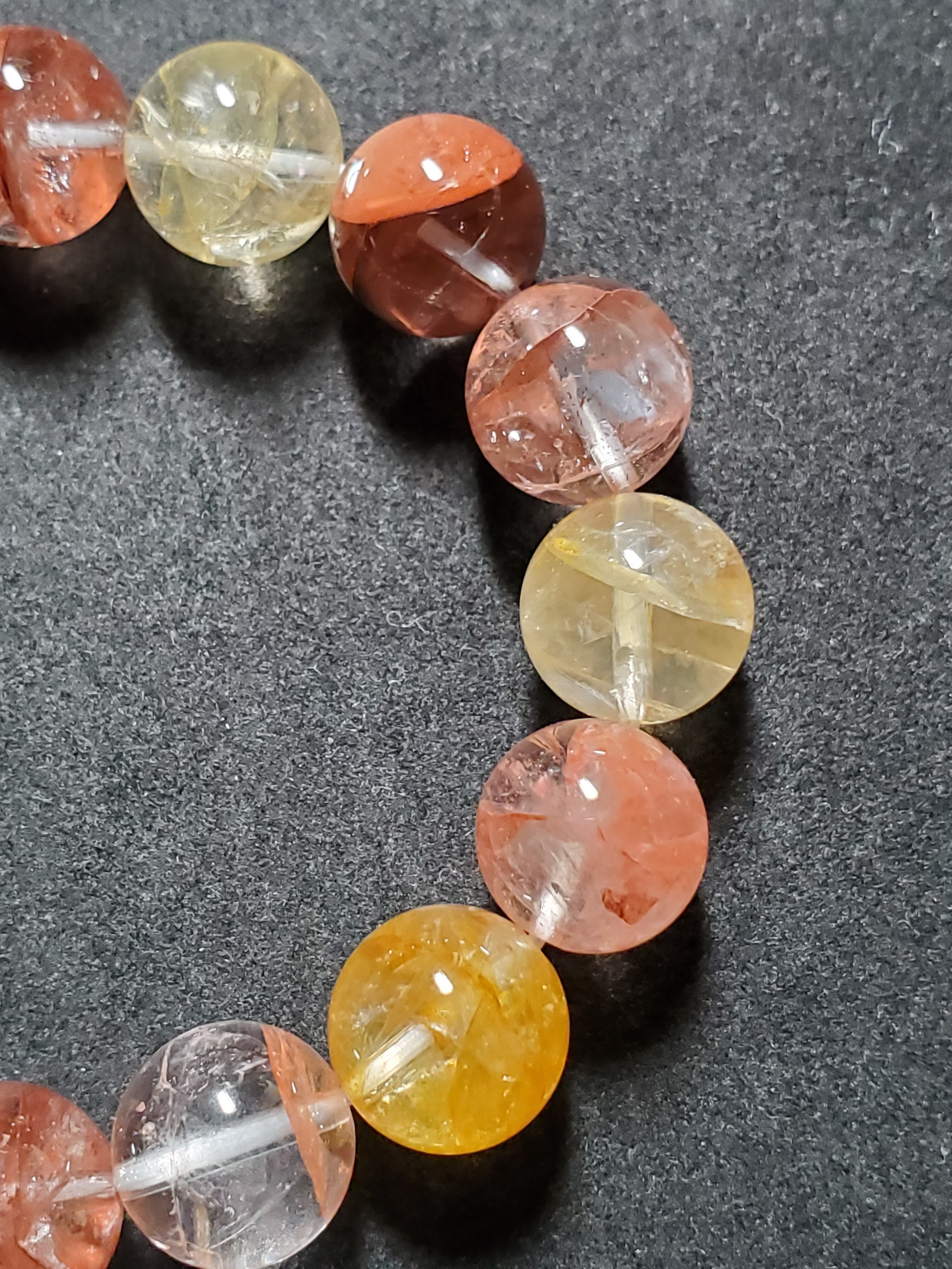 オーロラクォーツは水晶内部のクラックにヘマタイトやライモナイト(リモナイト)が染み込み色の膜を形成し、その色鮮やかな赤や黄色の模様がオーロラのように見えることから「オーロラクォーツ」とも言います。
