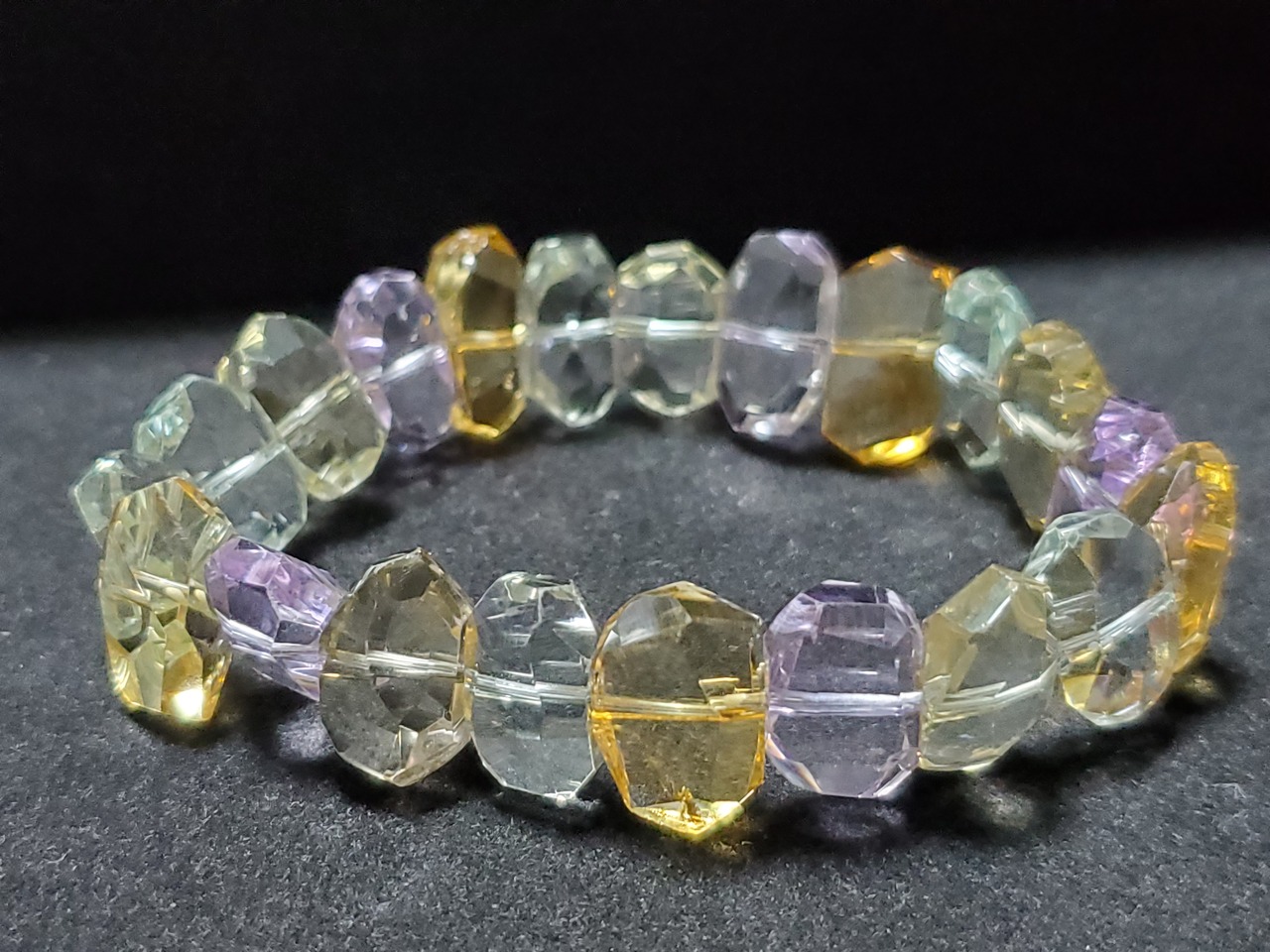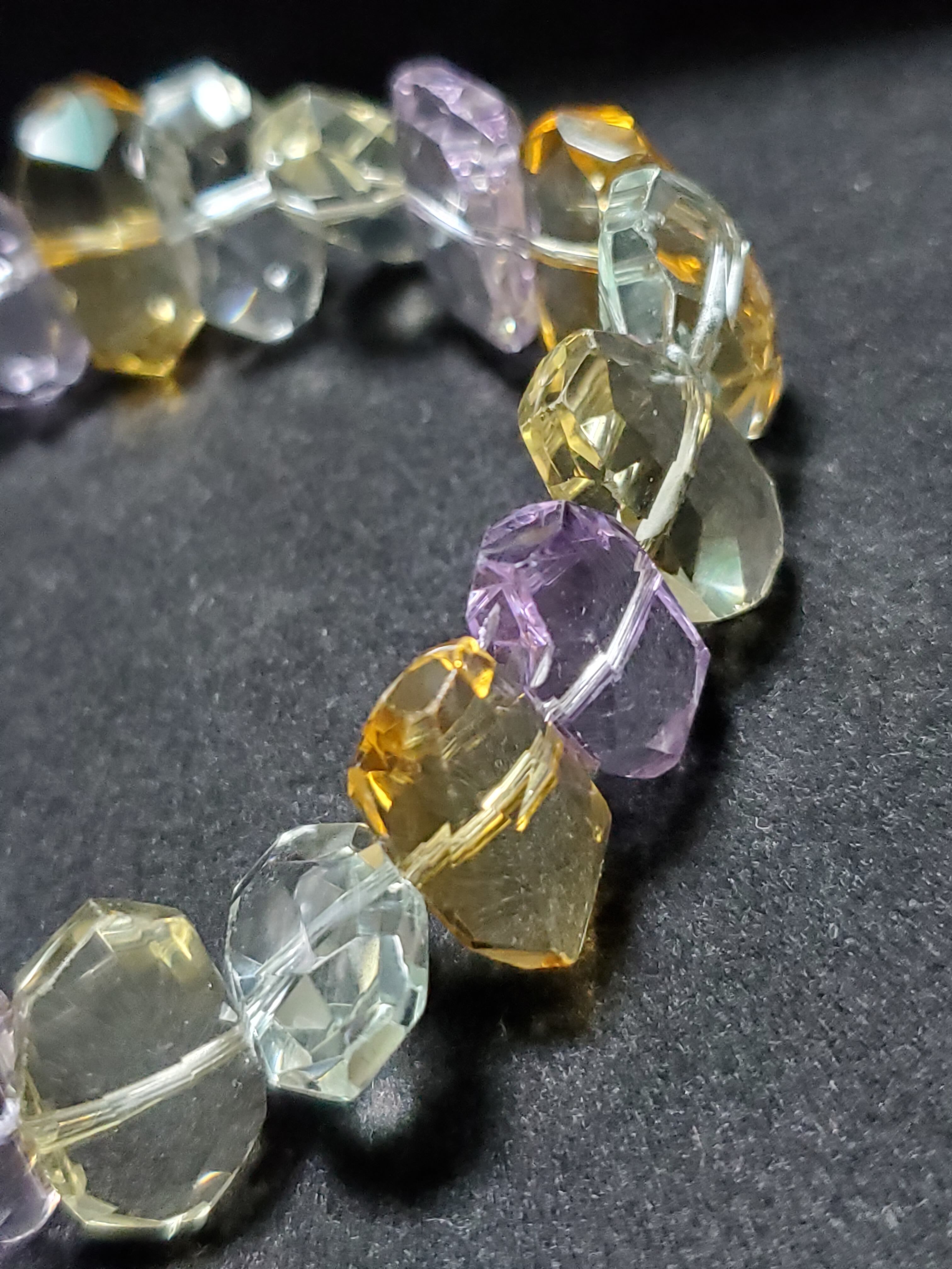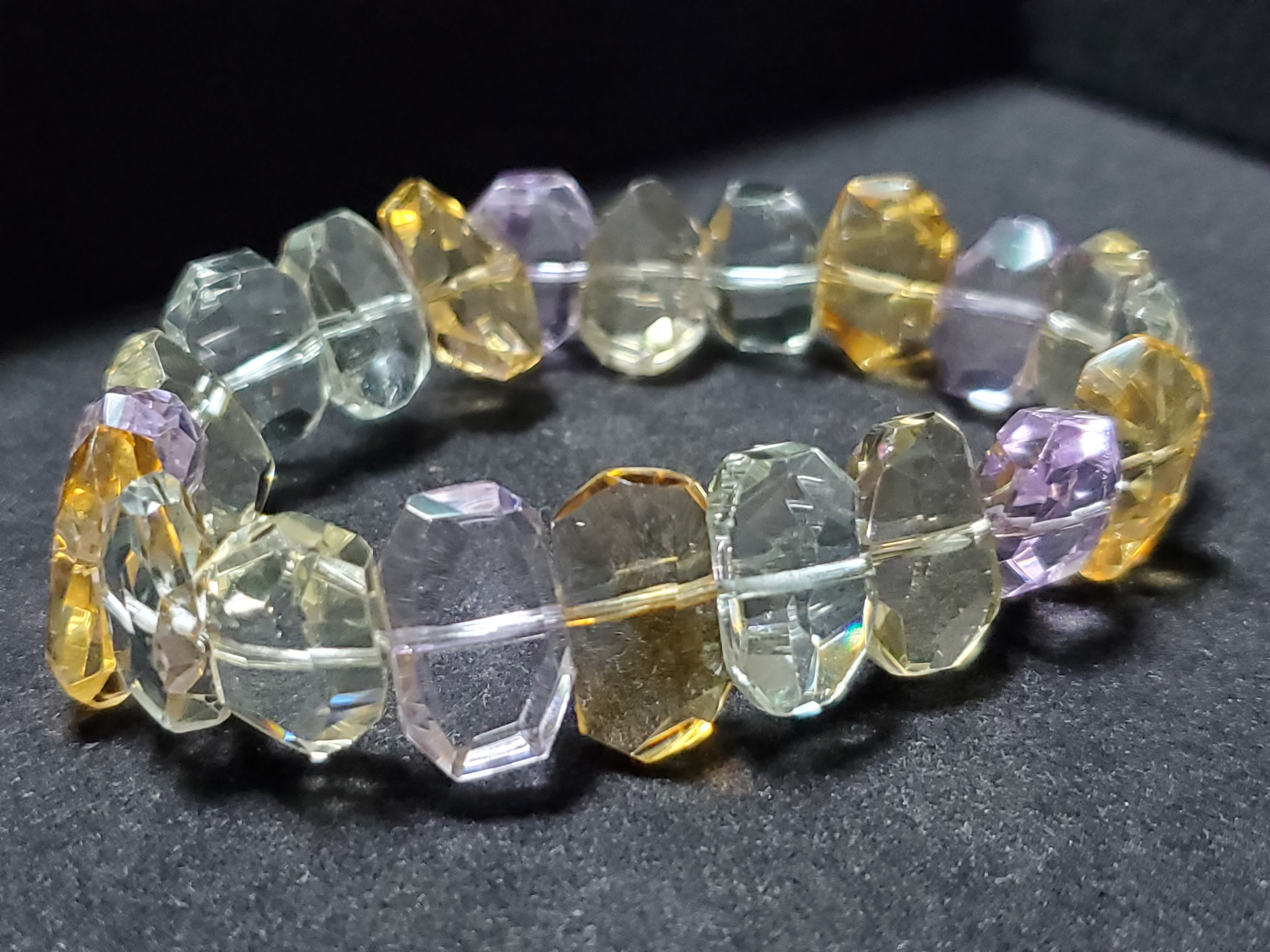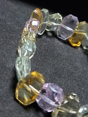 グリーンアメジスト(プラシオライト)、アメジスト、シトリンで組み上げた宝石質クラスのブレスレットです。