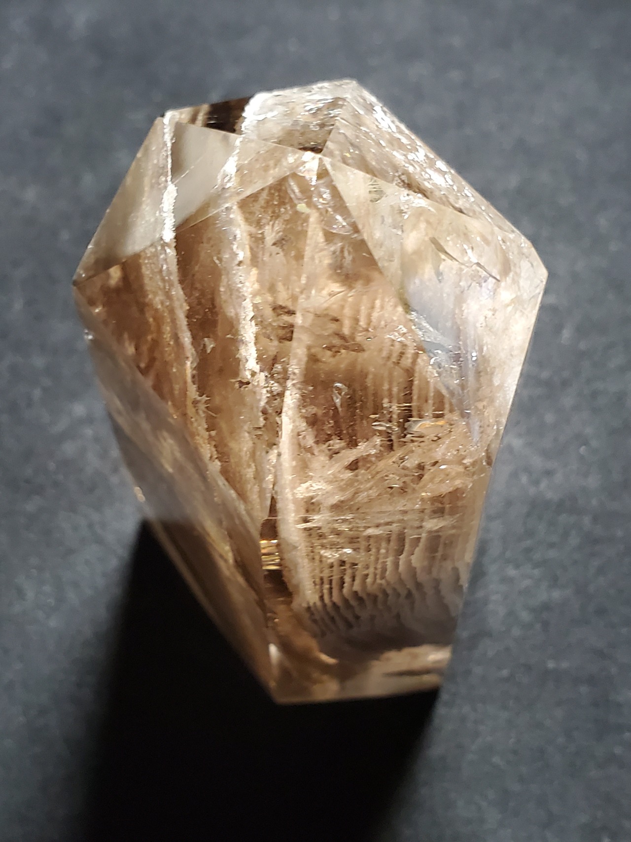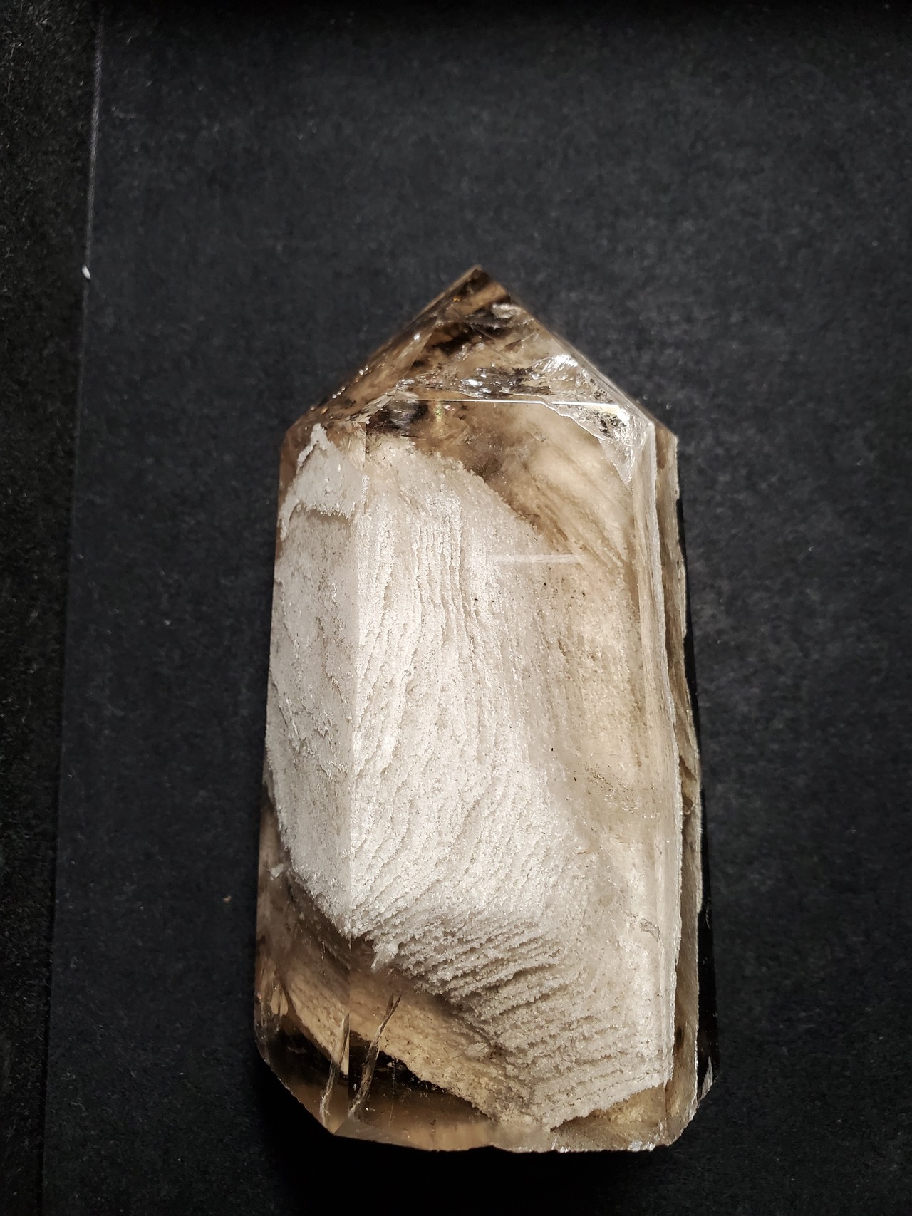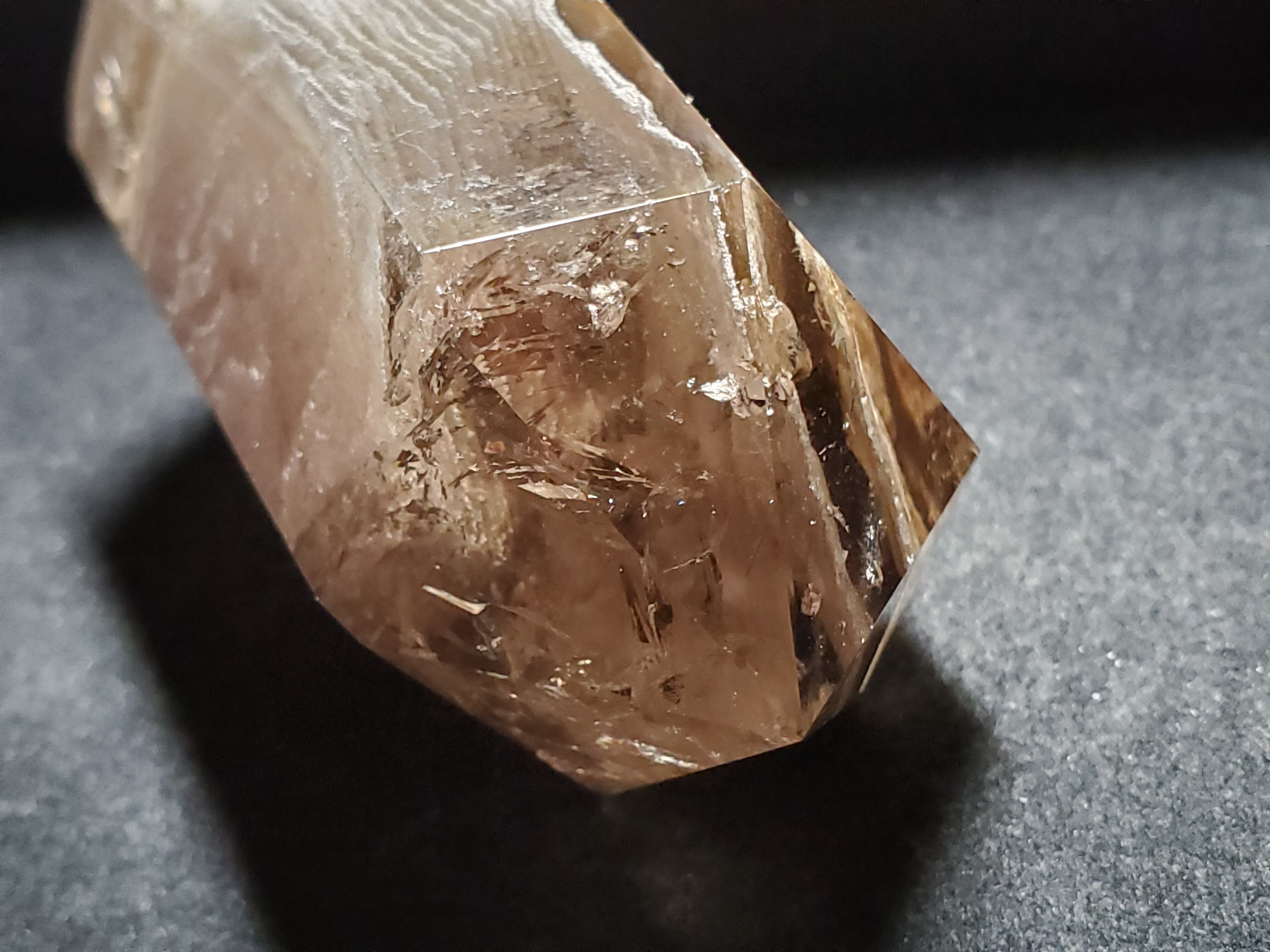 ひとくくりにガーデンクォーツといっても、その表情や種類は様々です。茶色い内包物が含まれるもの、緑色の内包物が含まれるもの、その両方が含まれるもの、さらにファントムが見られるものもあります。ファントムとは、水晶が成長していく過程で地殻変動などのショックが加わり、水晶の成長が一時的に停止した際に、その表面に別の元素が付着し、さらにその後長い年月を経て、水晶が再び成長を始めたために、結晶の中に斜めや三角、山型の像が模様として残る現象を言います。ファントムタイプのガーデンクォーツは、自らの成長の記憶を内部に刻み込んでいるため、持ち主の潜在能力を引き出し、成長を促してくれると伝えられています。