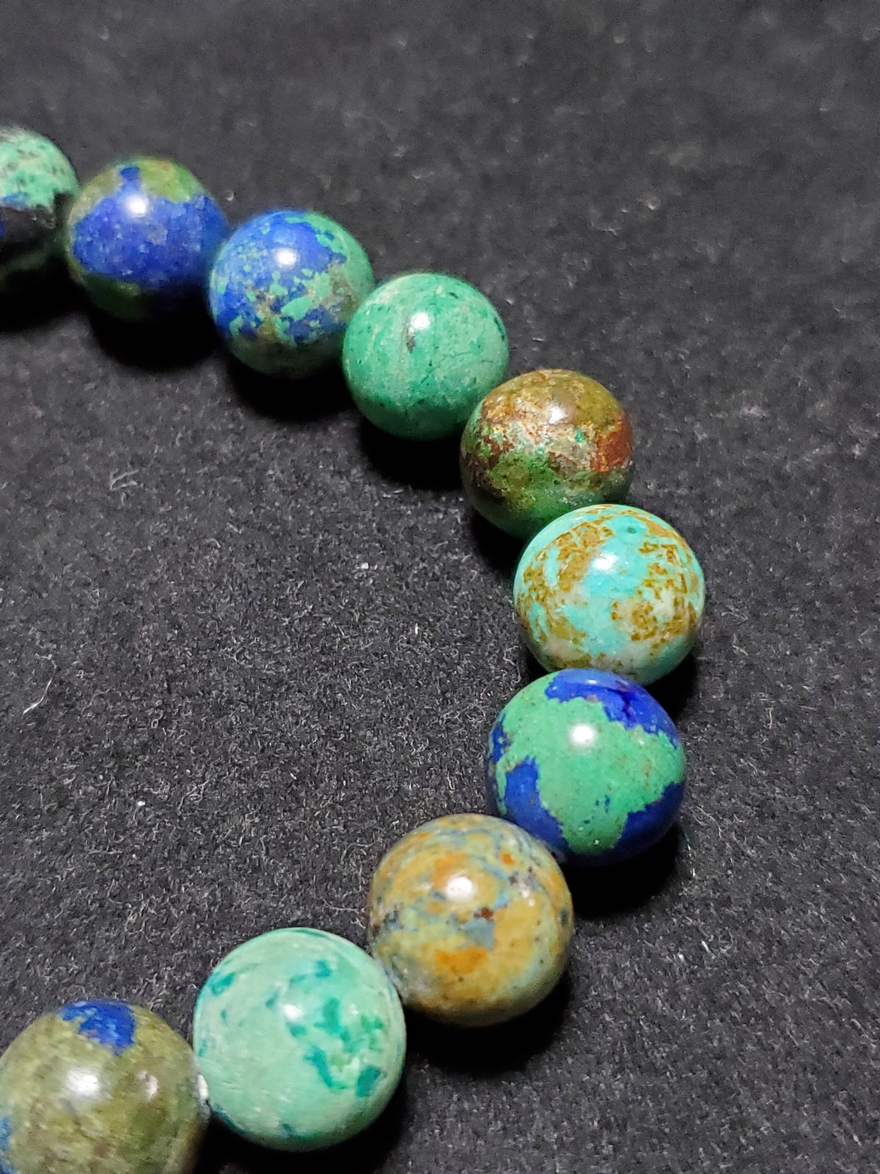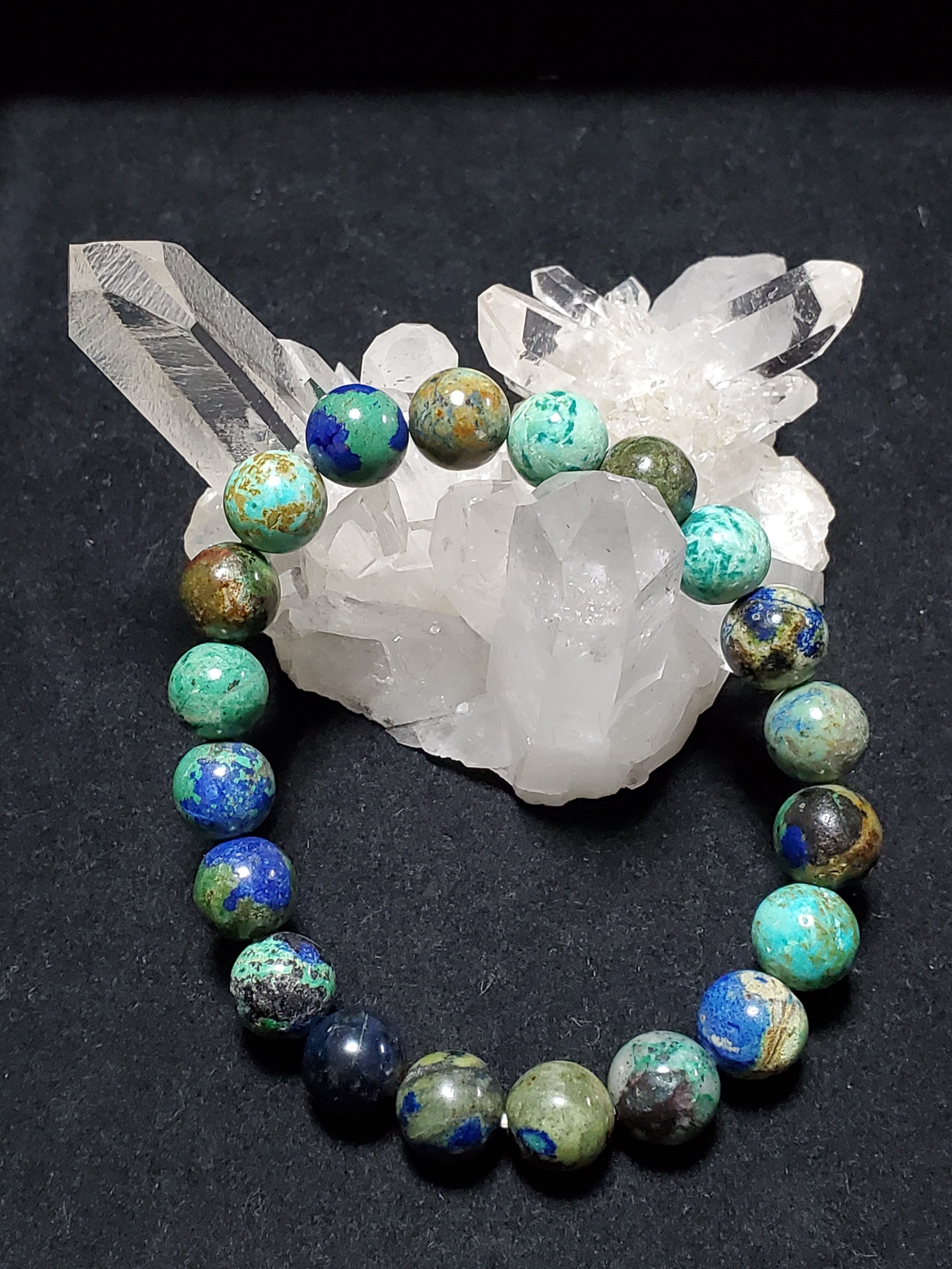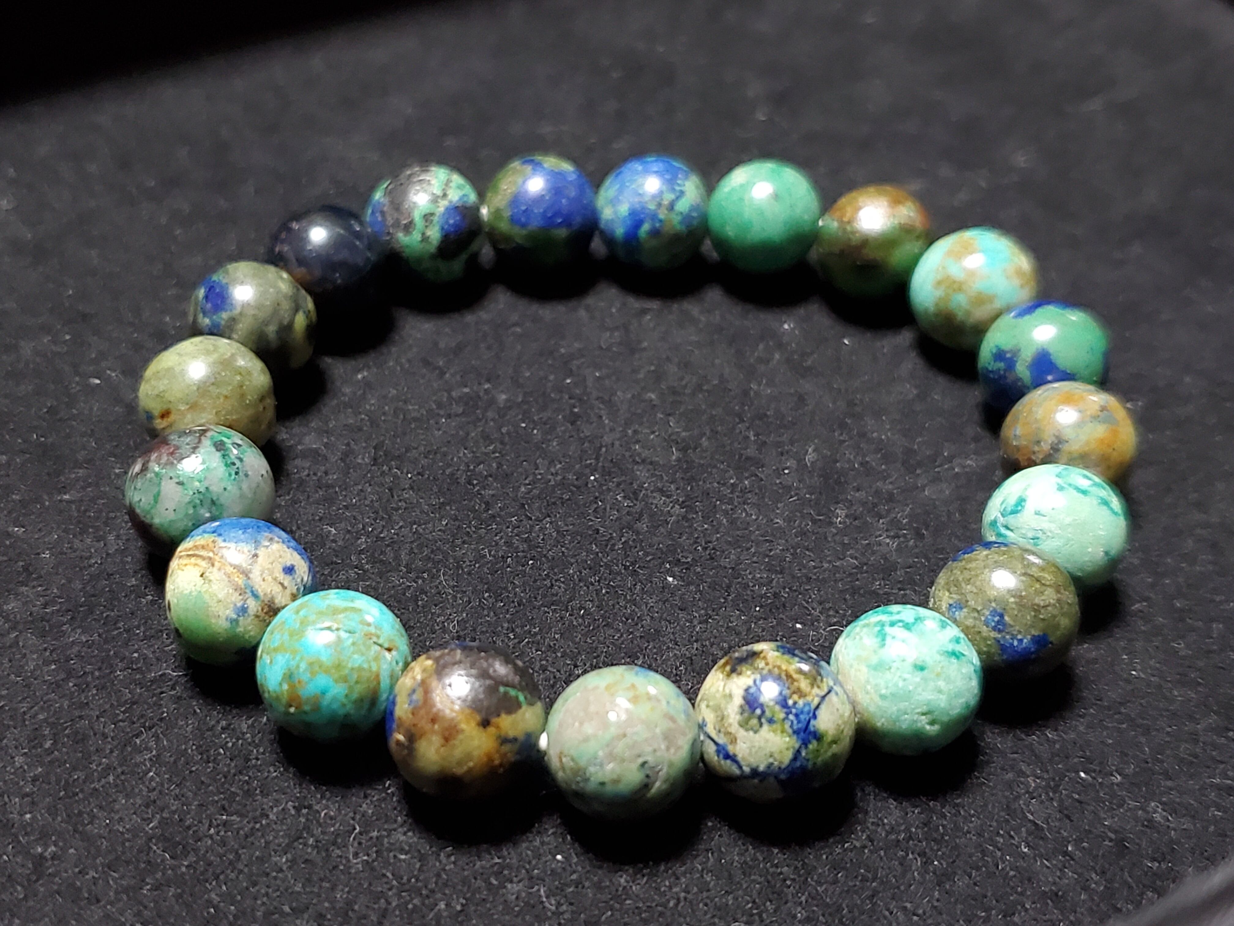 2つの鉱物が美しく混ざり合ったアズロマラカイトは、ネガティブな感情を浄化し、新しいパワーを生み出す効果をもつとされます。幼少期のトラウマが、今の自分の思考や行動をマイナスの方向へ向かわせていると感じたとき身につけてみてください。恐怖心を癒し、高い精神性をもたらしてくれるでしょう。アズロマラカイトは、現状を変えたいときに、大きなパワーを発揮してくれるとされる石です。明晰な判断をもたらすアズライトと、大胆な変化をもたらすマラカイトが組み合わせれているため、思い切った判断も実行に移すことができるでしょう。マラカイトはポジティブなエネルギーを増幅させる力があるとされ、アズライトがより正しい方向にそのエネルギーを導いてくれるといわれています。古い固定観念を取り去り、新しい能力に目覚めさせる効果があるといわれています。自分のなかの凝り固まった古い思考や偏見を取り去り、一歩先の新しい考え方をもたらしてくれるでしょう。