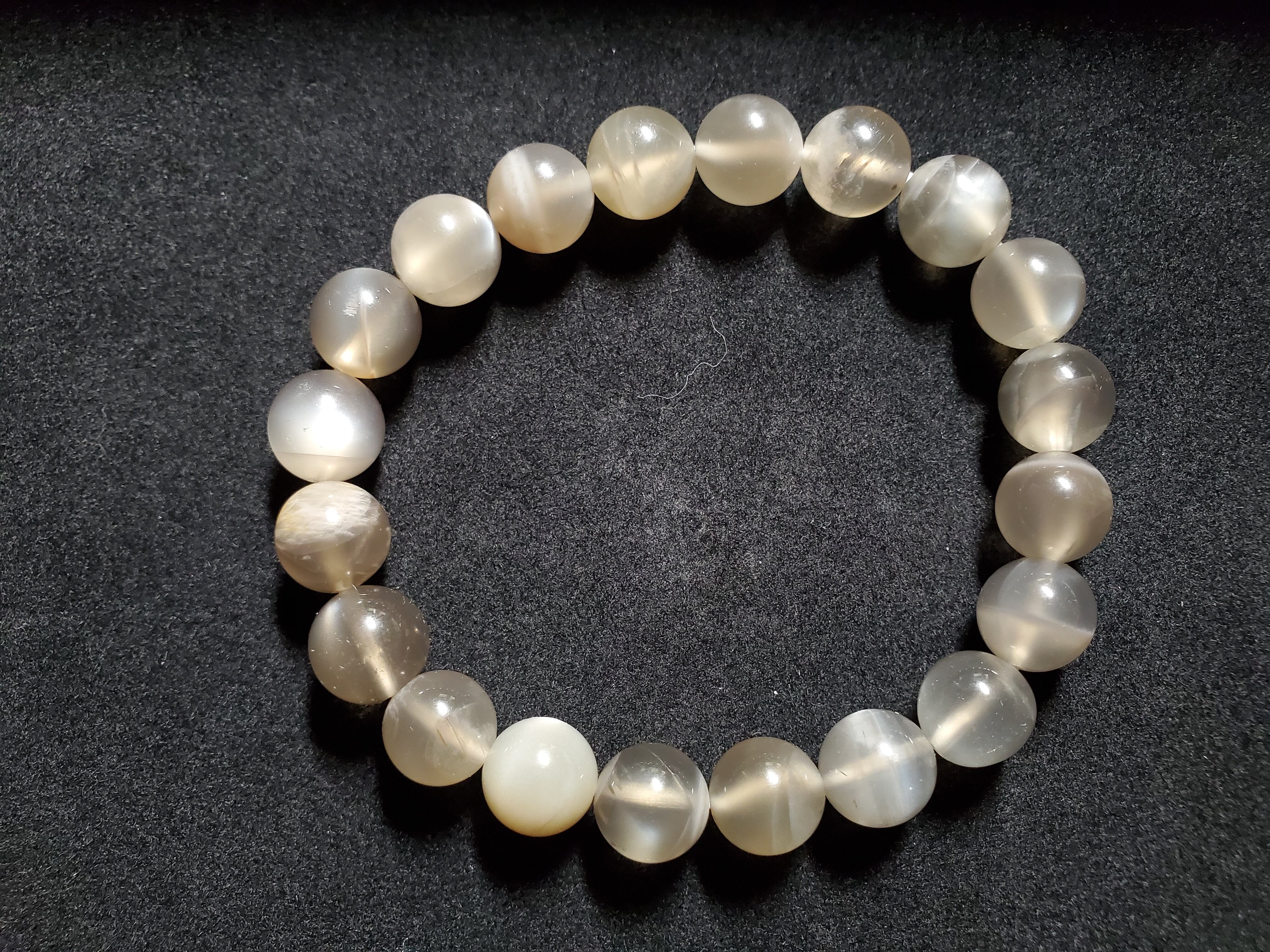 ムーンストーンは長石(フェルドスパー)という鉱物グループの一種。長石グループの石には、ラブラドライト、サンストーン、アマゾナイトなどがあり、同じ仲間とは思えないほど多種多様です。ムーンストーンはオーソクレース(正長石)を主とし、アルバイト(曹長石)を含むものをいい、この二種類の長石の層が重なり合って、光の内部反射と干渉が起こり、「シラー(シーン)」と呼ばれる幻想的な光の効果を見ることができます。この光こそがムーンストーンの最も特徴的な魅力でもあり、名前の元となるイメージをかきたてたのだと思います。一般的に知られるムーンストーンは乳白色、または半透明の物が多いようですが、他にもオレンジ、ピンク、イエロー、グリーン、灰色がかったグリーン、灰色、茶色、褐色など様々な色があります。