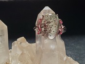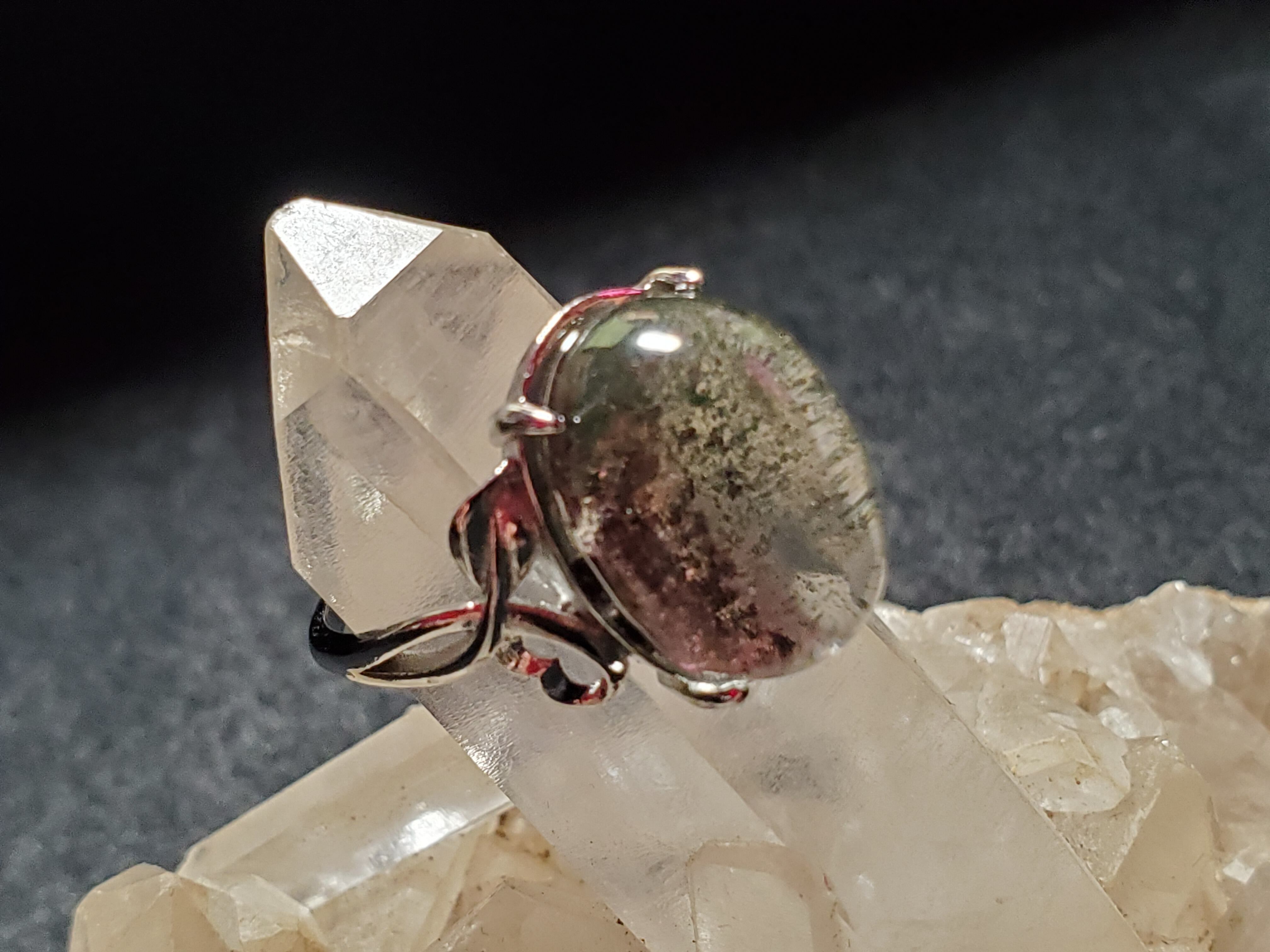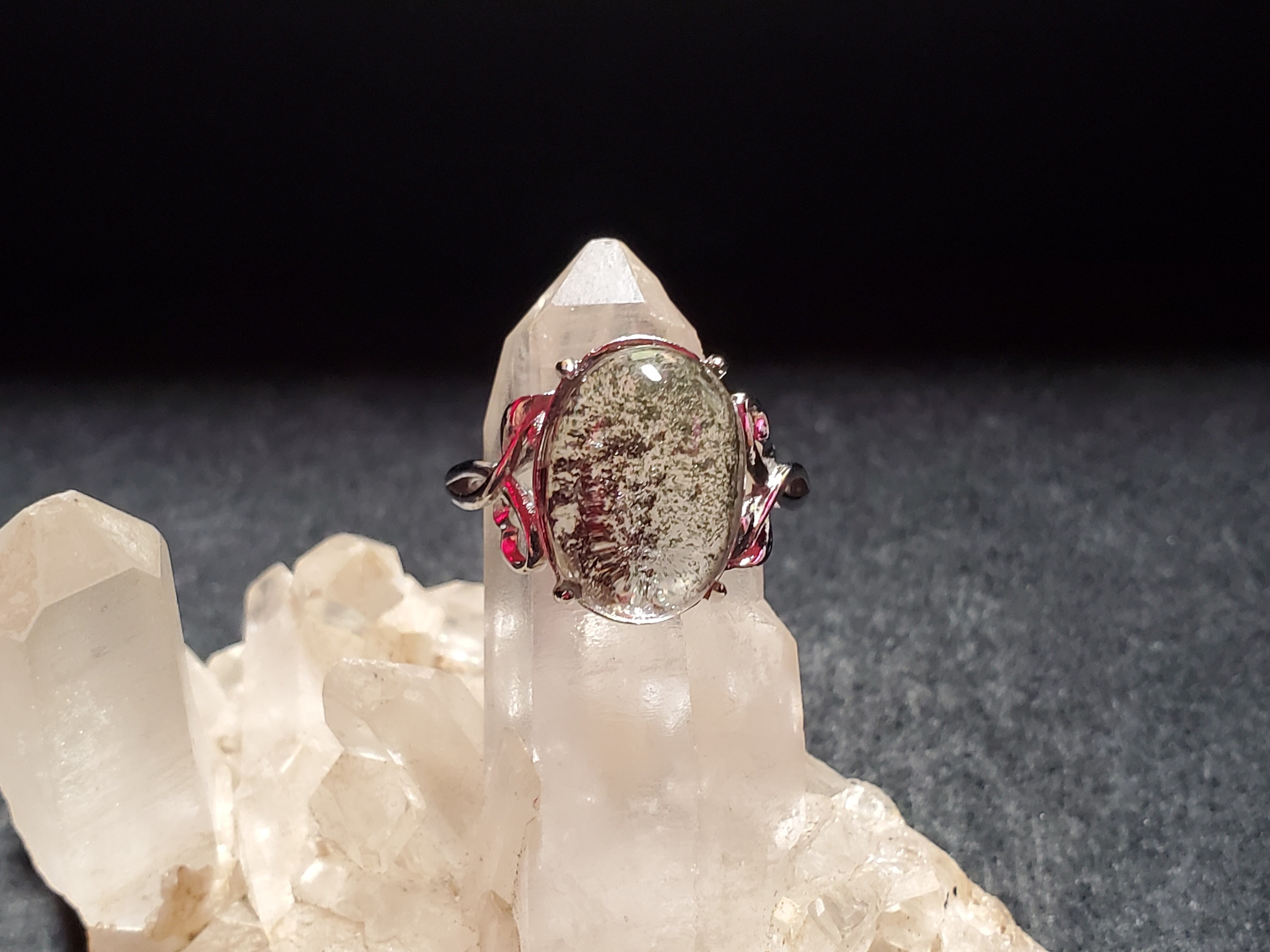 ひとくくりにガーデンクォーツといっても、その表情や種類は様々です。茶色い内包物が含まれるもの、緑色の内包物が含まれるもの、その両方が含まれるもの、さらにファントムが見られるものもあります。ファントムとは、水晶が成長していく過程で地殻変動などのショックが加わり、水晶の成長が一時的に停止した際に、その表面に別の元素が付着し、さらにその後長い年月を経て、水晶が再び成長を始めたために、結晶の中に斜めや三角、山型の像が模様として残る現象を言います。ファントムタイプのガーデンクォーツは、自らの成長の記憶を内部に刻み込んでいるため、持ち主の潜在能力を引き出し、成長を促してくれると伝えられています。
