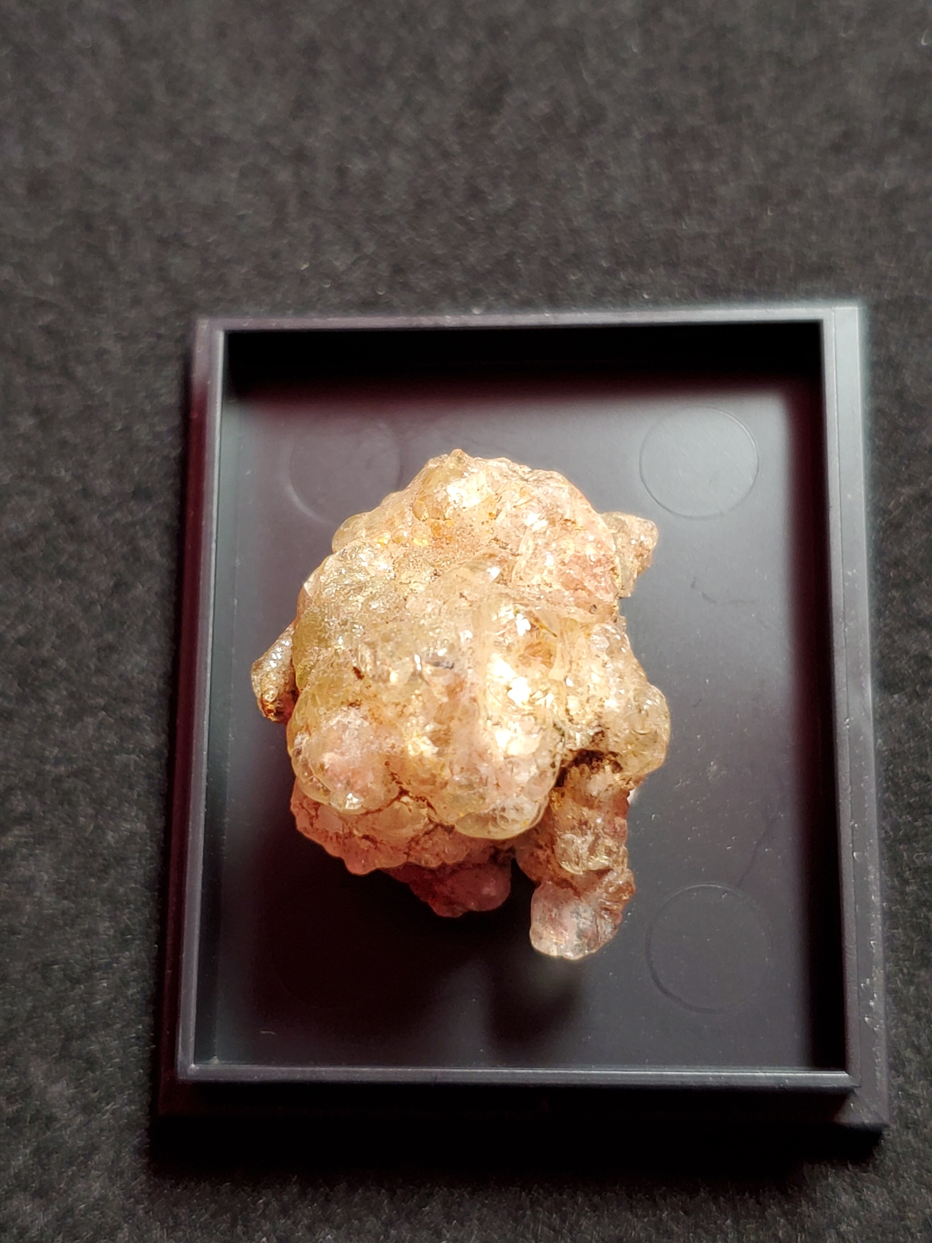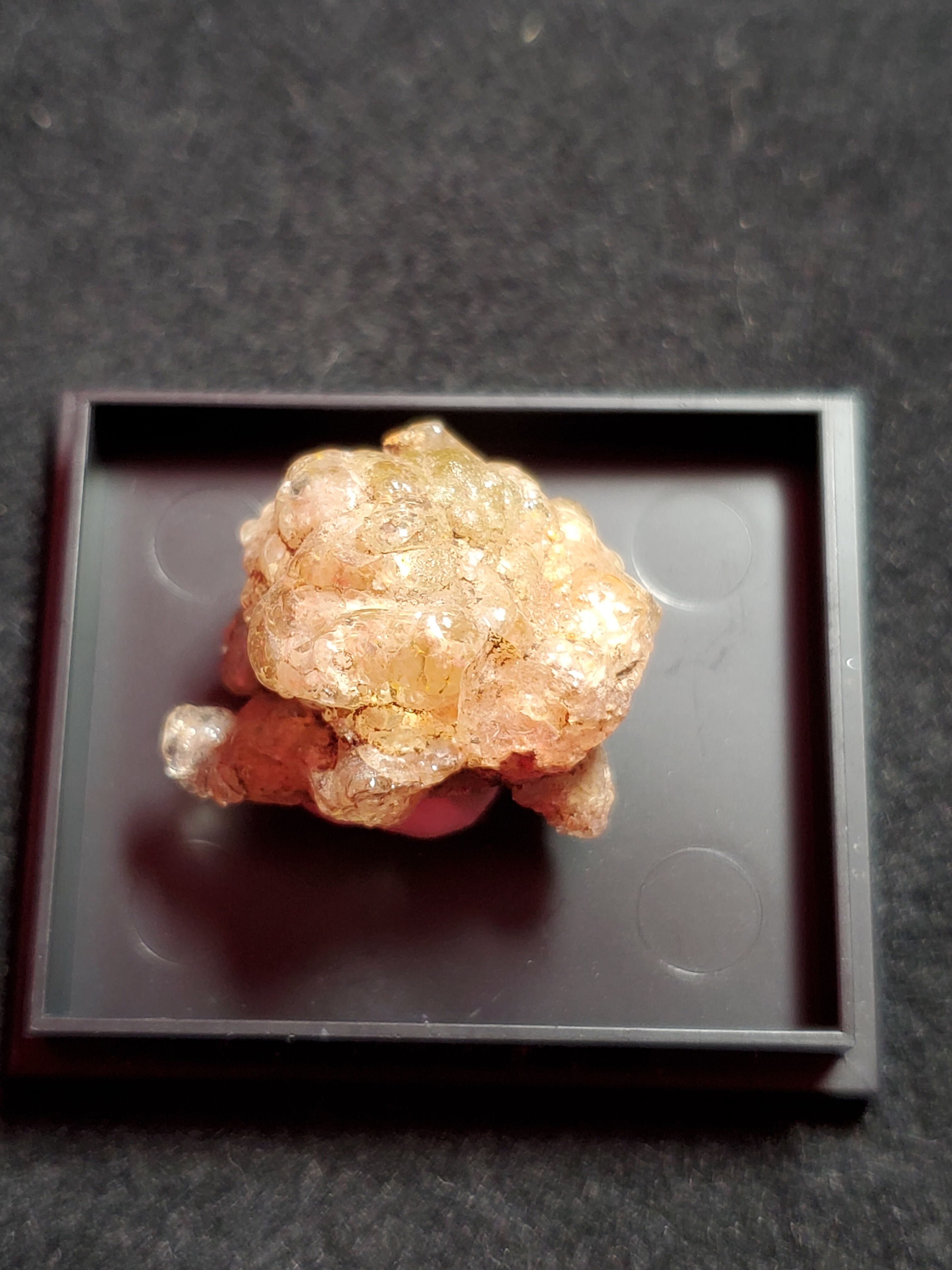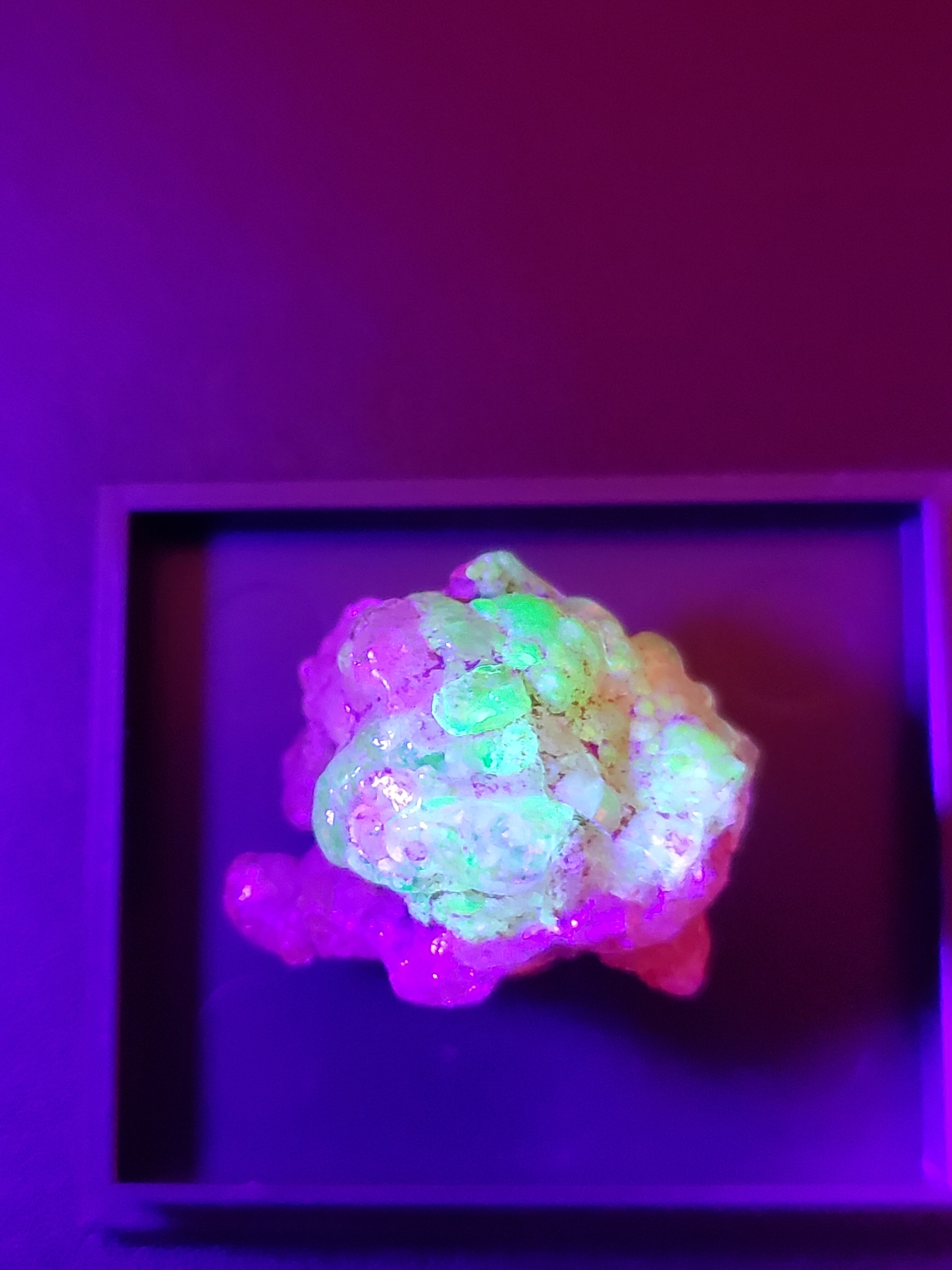 オパールの一種で、母岩の上に水滴が付いた様に、微細な球状シリカの集合した物で、その見た目から玉滴石と呼ばれています。結晶に微量のウランを含んでいる為、紫外線長波で強くウラン特有の黄緑色に蛍光します。弱いUVライトでも光るので見て楽しめる標本です。ハイアライトは直感力を高める効果があると言われています。