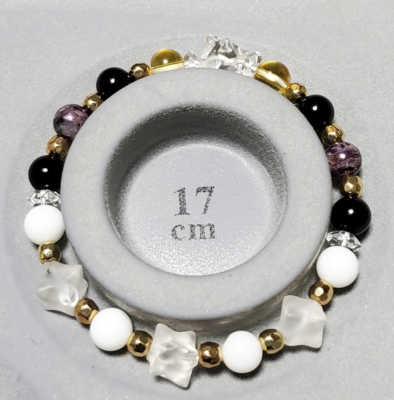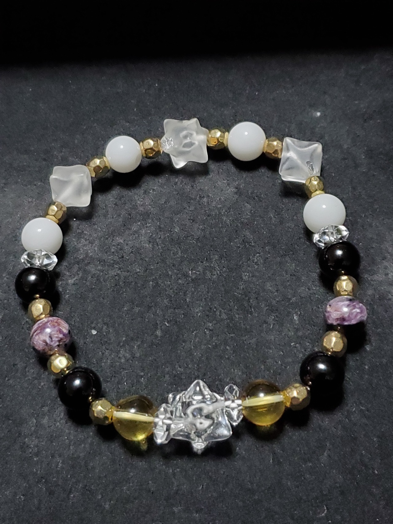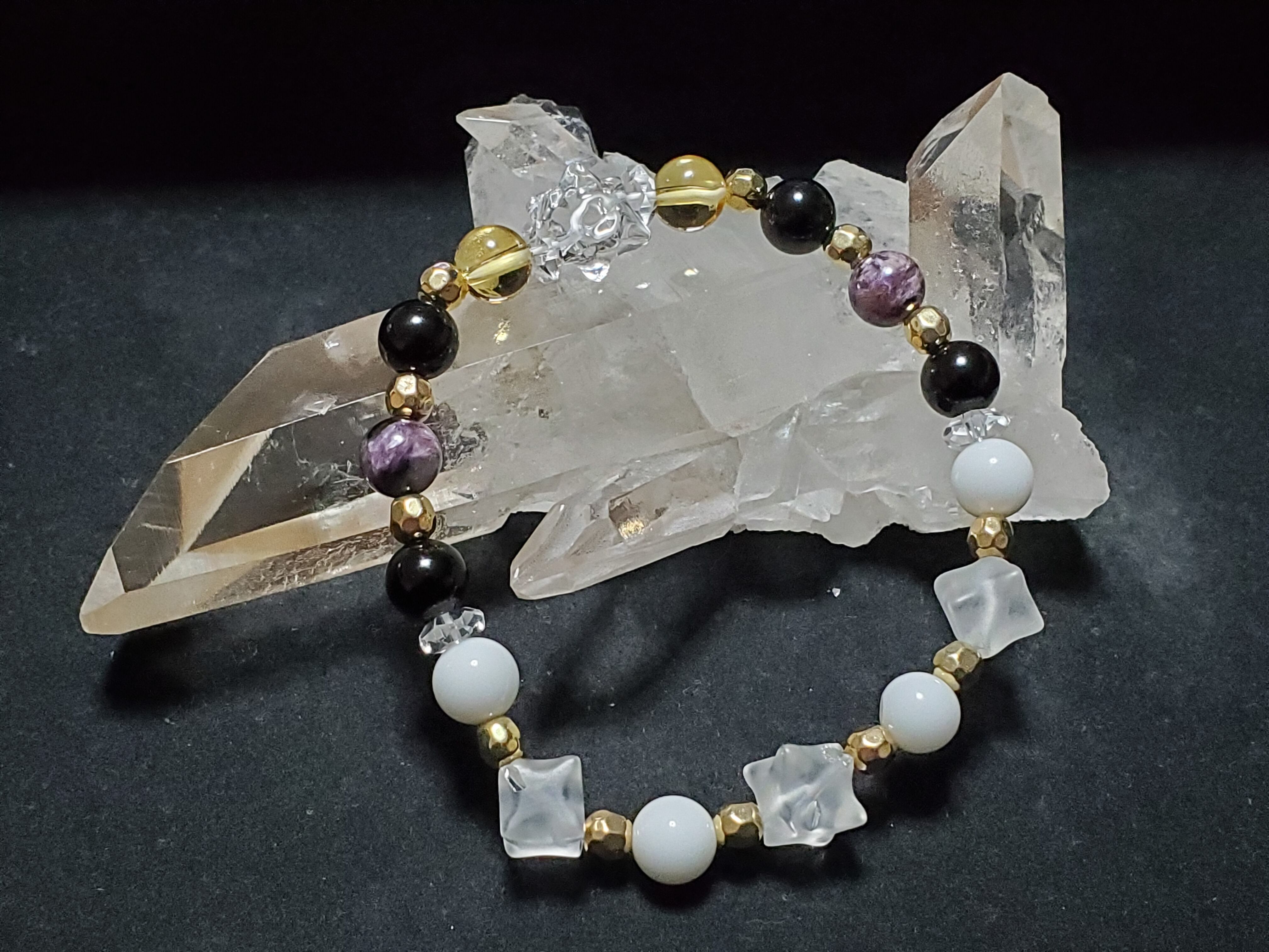 水晶のマカバスター、ホワイトオニキス、ブラックオニキス、チャロアイト、シトリンに、ゴールドビーズをアクセントに組み上げました。