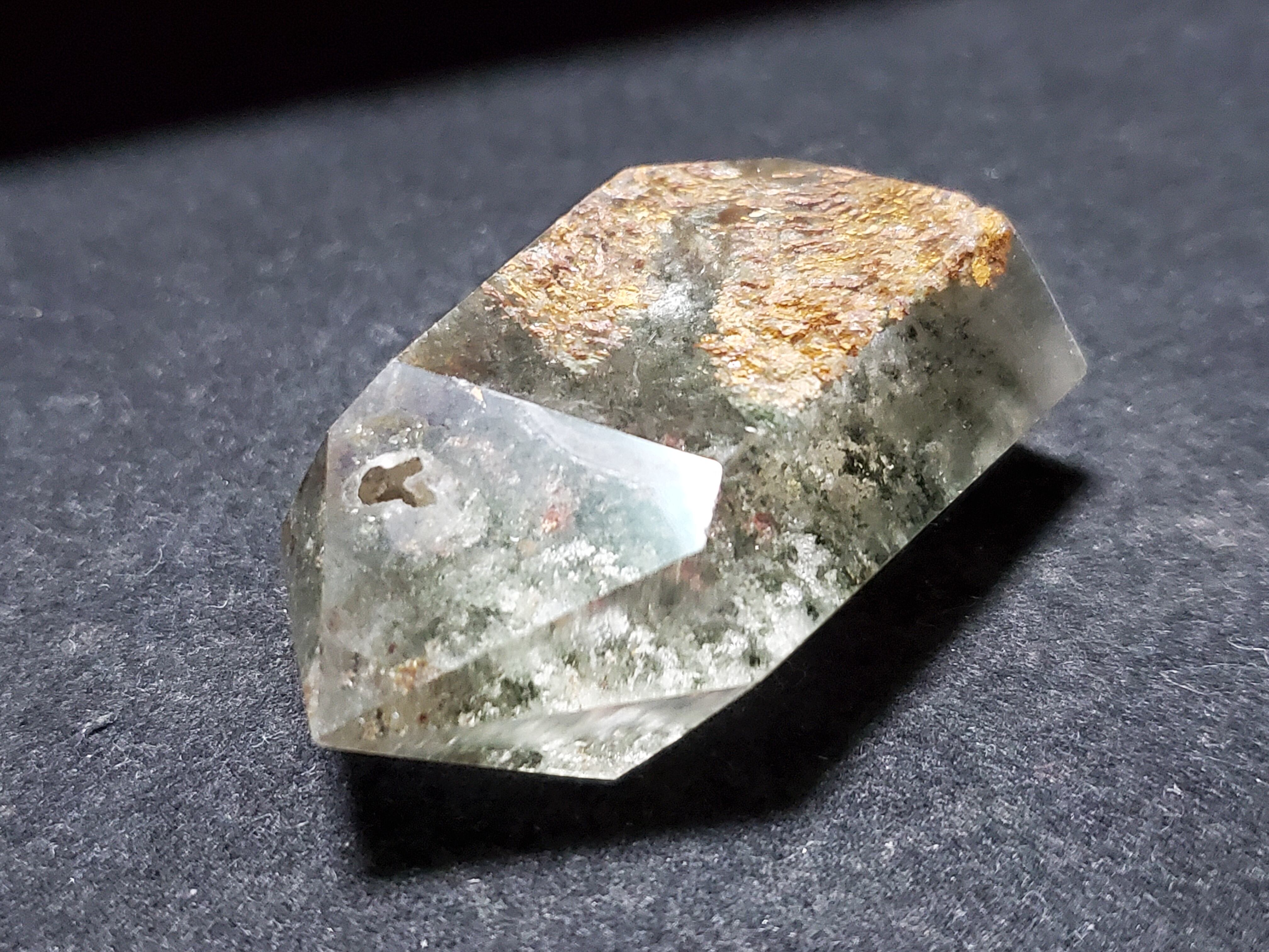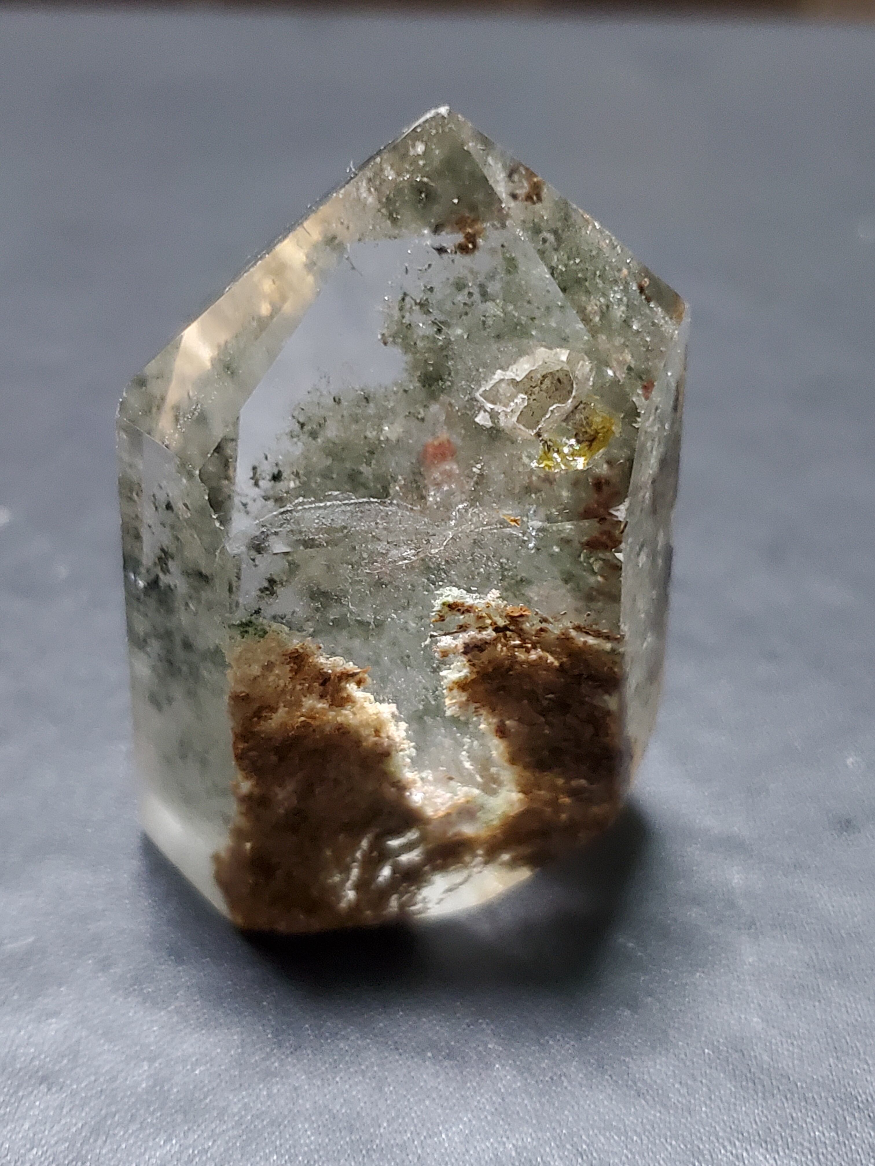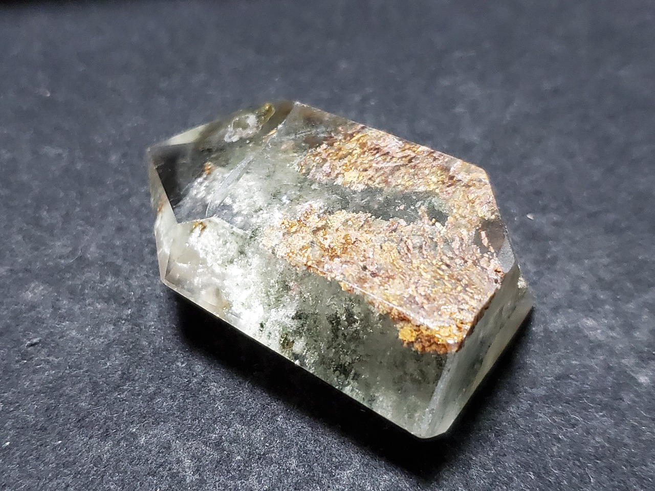 ひとくくりにガーデンクォーツといっても、その表情や種類は様々です。茶色い内包物が含まれるもの、緑色の内包物が含まれるもの、その両方が含まれるもの、さらにファントムが見られるものもあります。ファントムとは、水晶が成長していく過程で地殻変動などのショックが加わり、水晶の成長が一時的に停止した際に、その表面に別の元素が付着し、さらにその後長い年月を経て、水晶が再び成長を始めたために、結晶の中に斜めや三角、山型の像が模様として残る現象を言います。ファントムタイプのガーデンクォーツは、自らの成長の記憶を内部に刻み込んでいるため、持ち主の潜在能力を引き出し、成長を促してくれると伝えられています。