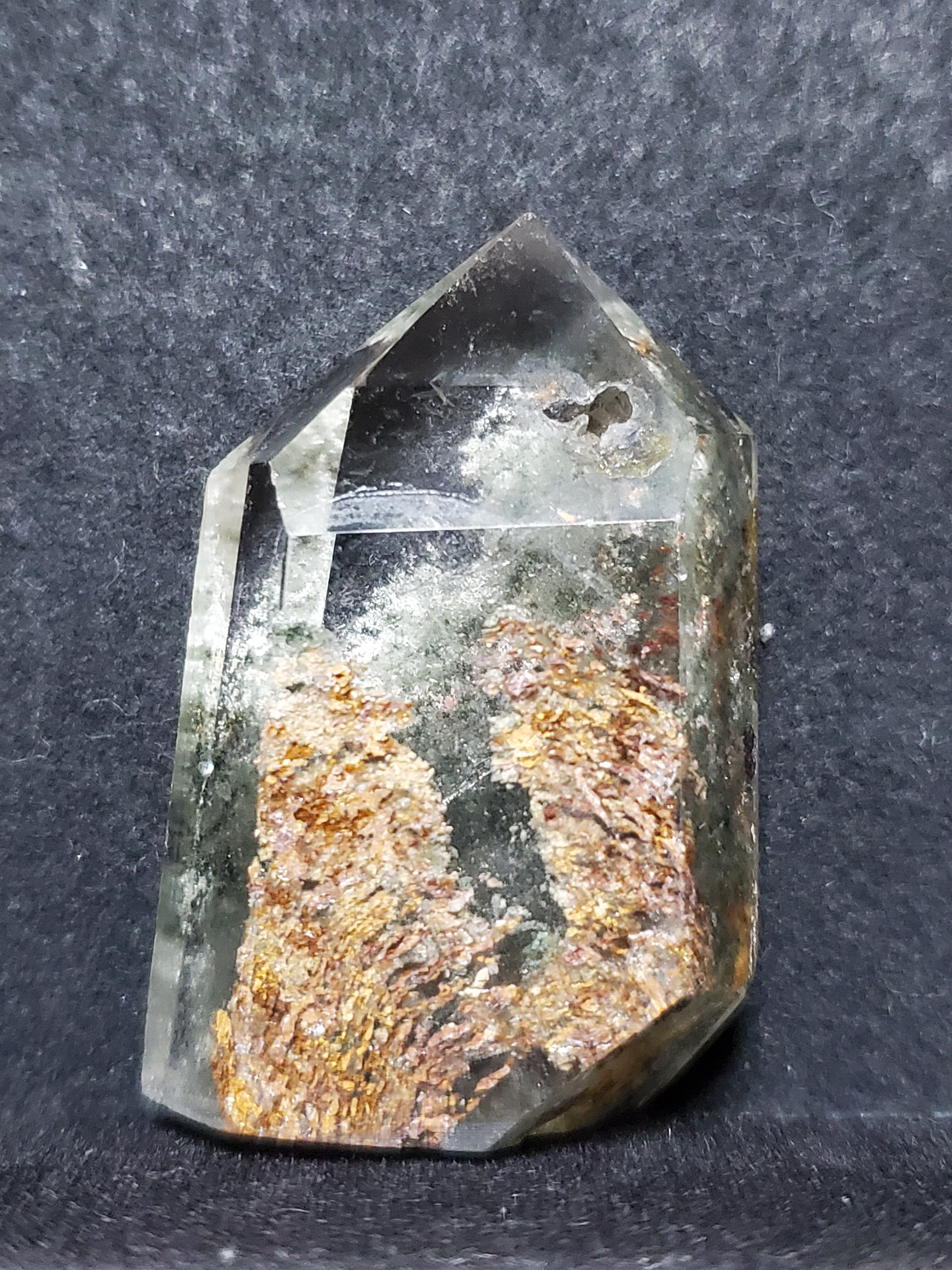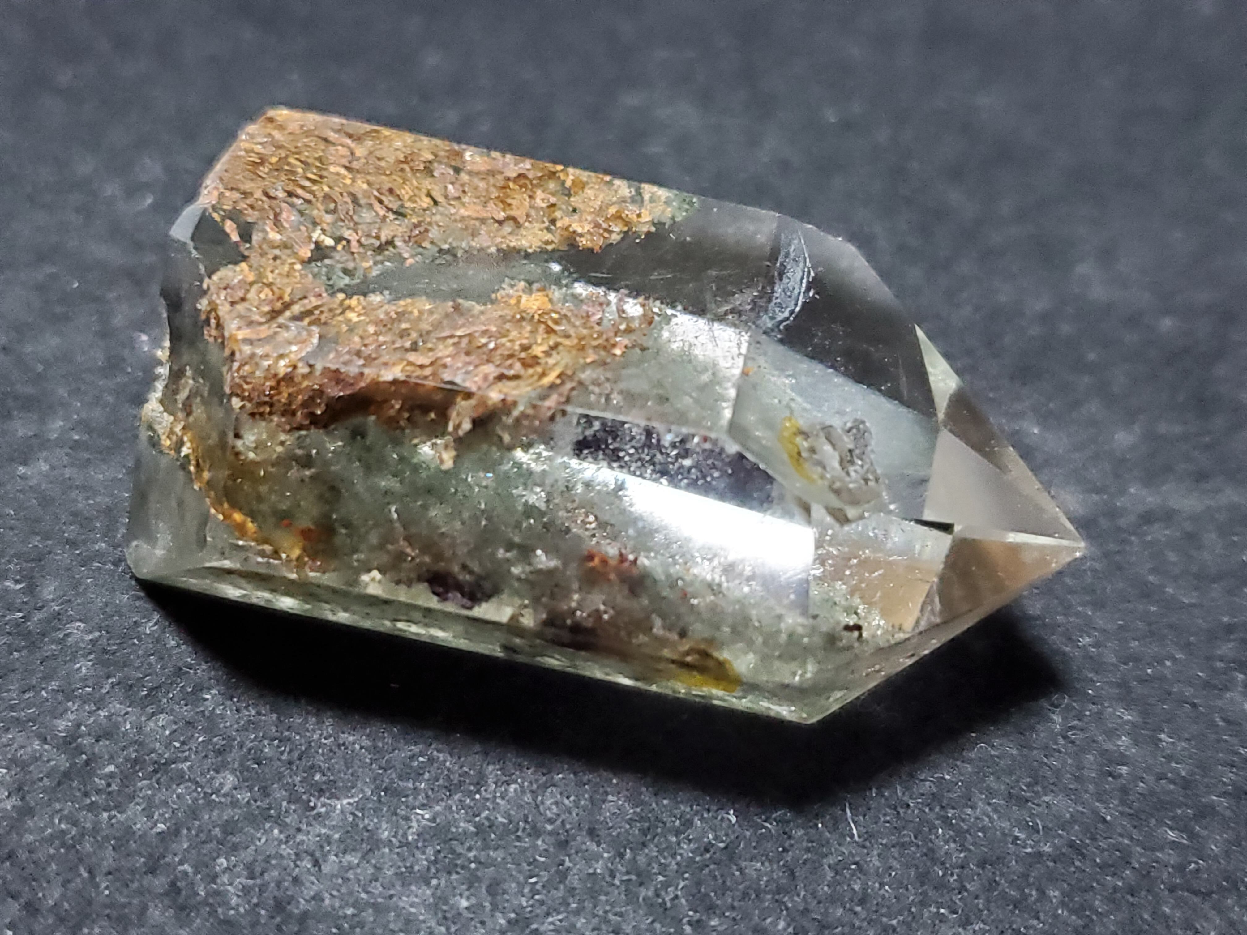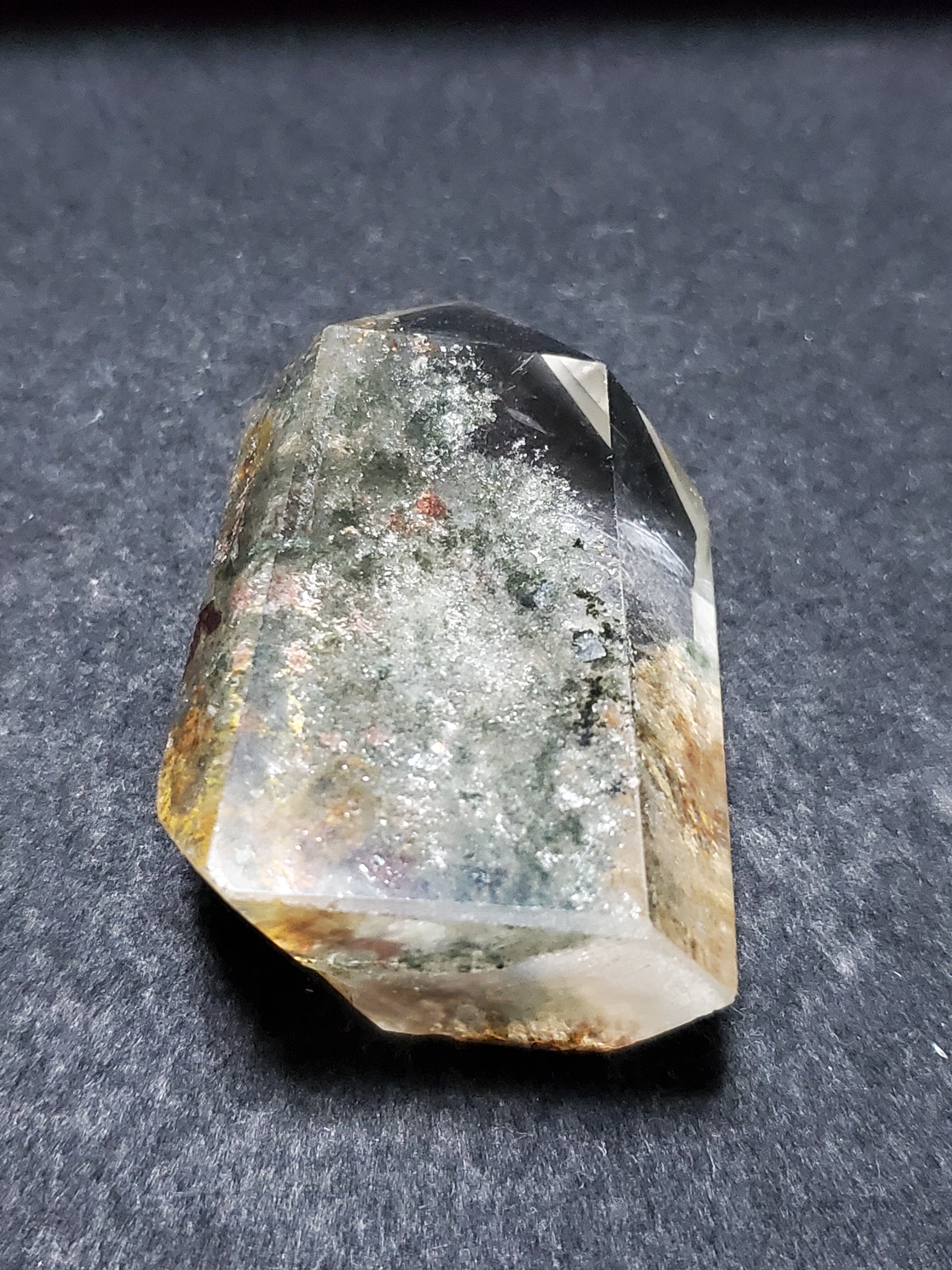 ひとくくりにガーデンクォーツといっても、その表情や種類は様々です。茶色い内包物が含まれるもの、緑色の内包物が含まれるもの、その両方が含まれるもの、さらにファントムが見られるものもあります。ファントムとは、水晶が成長していく過程で地殻変動などのショックが加わり、水晶の成長が一時的に停止した際に、その表面に別の元素が付着し、さらにその後長い年月を経て、水晶が再び成長を始めたために、結晶の中に斜めや三角、山型の像が模様として残る現象を言います。ファントムタイプのガーデンクォーツは、自らの成長の記憶を内部に刻み込んでいるため、持ち主の潜在能力を引き出し、成長を促してくれると伝えられています。
