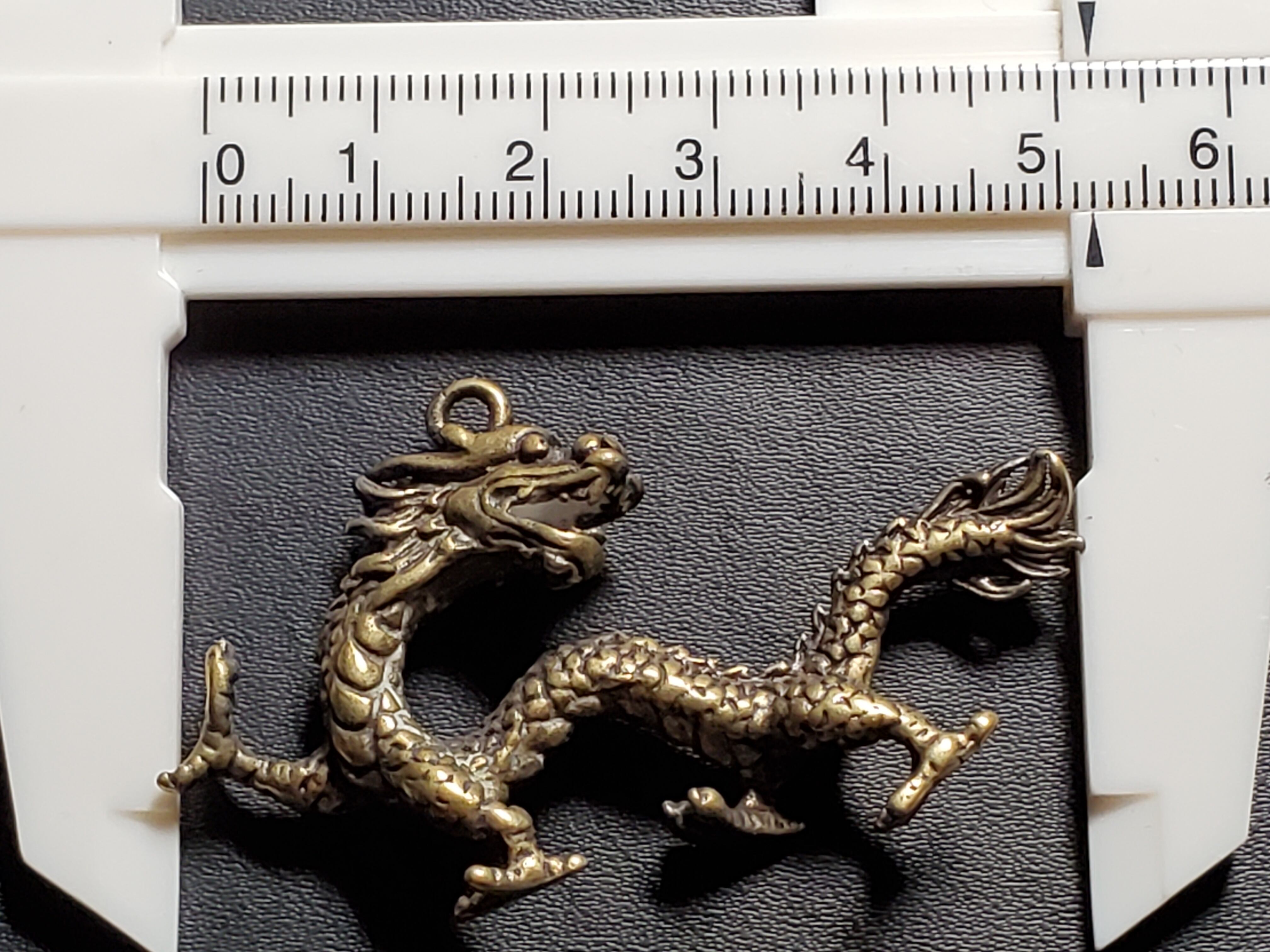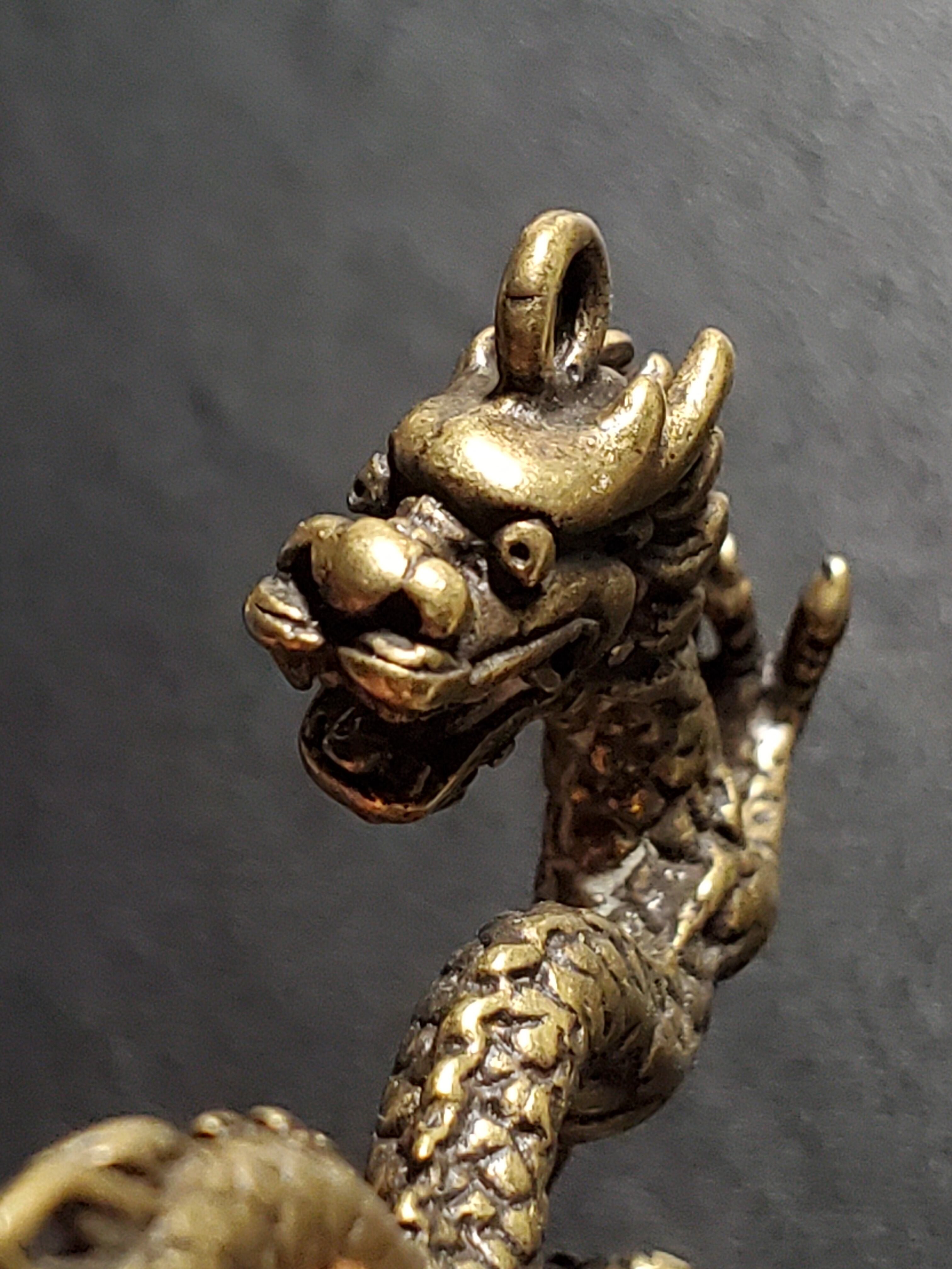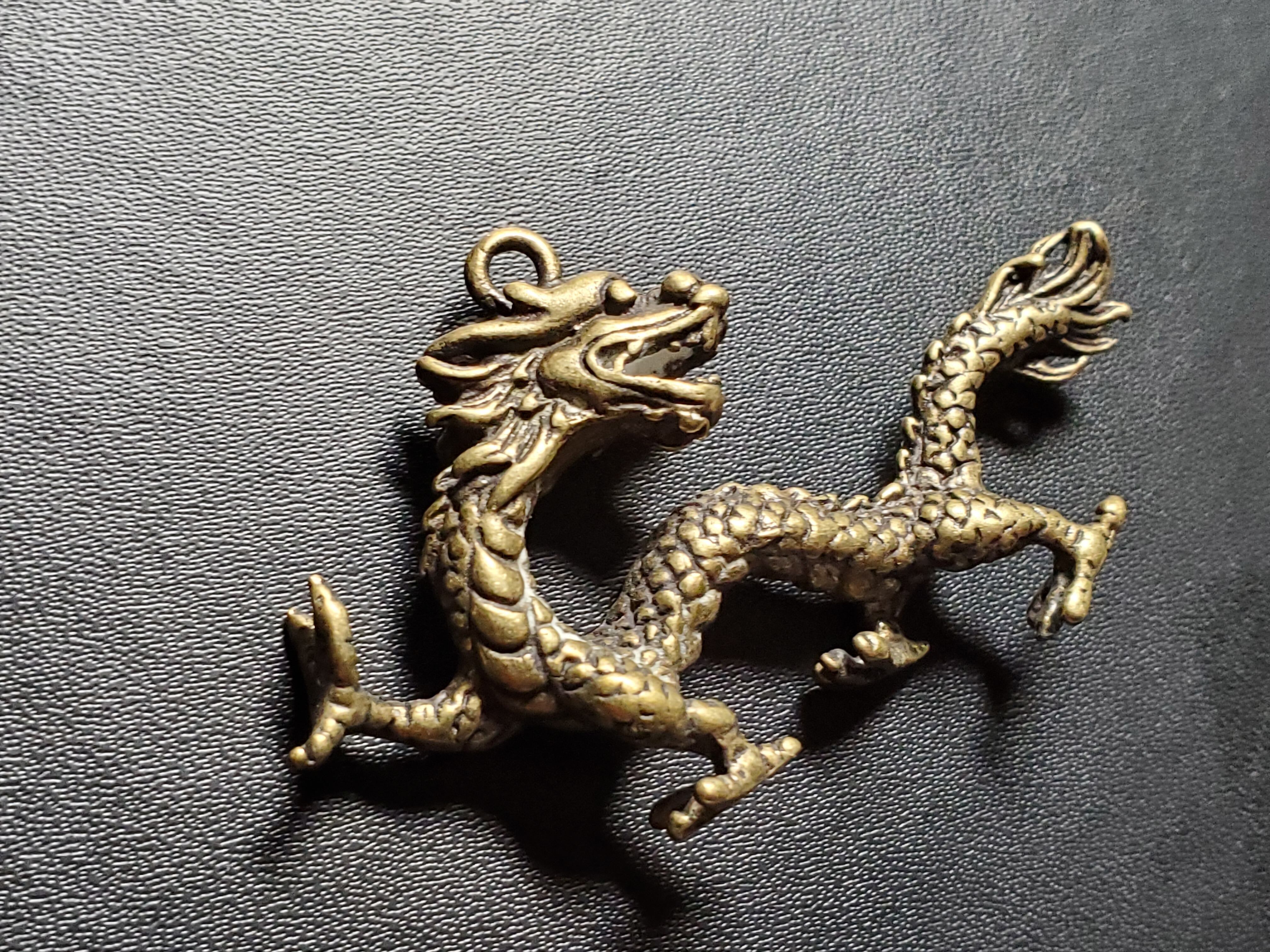 真鍮製の龍です。龍の頭に穴がついているので、キーホルダーにしたり、ペンダントトップとしてお使いになれると思います。