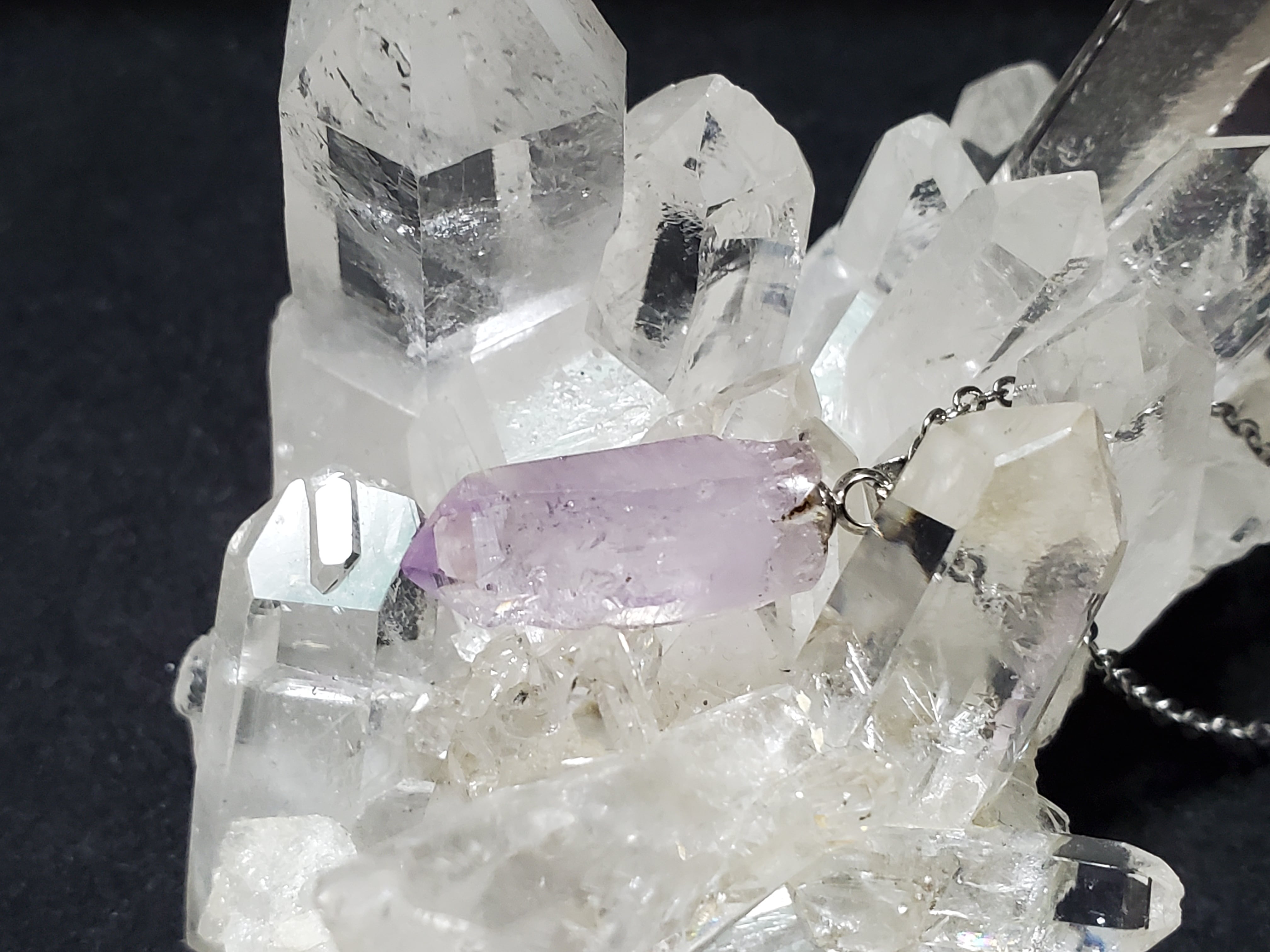 ベラクルスアメジストの特徴と言えば、なんと言ってもその美しさです。淡い紫、透き通るようにクリア、細長く美しい結晶は見る者を魅了します。世界一美しいアメジストと言われるのも納得です。その美しさから「女神が宿っている」と称されています。