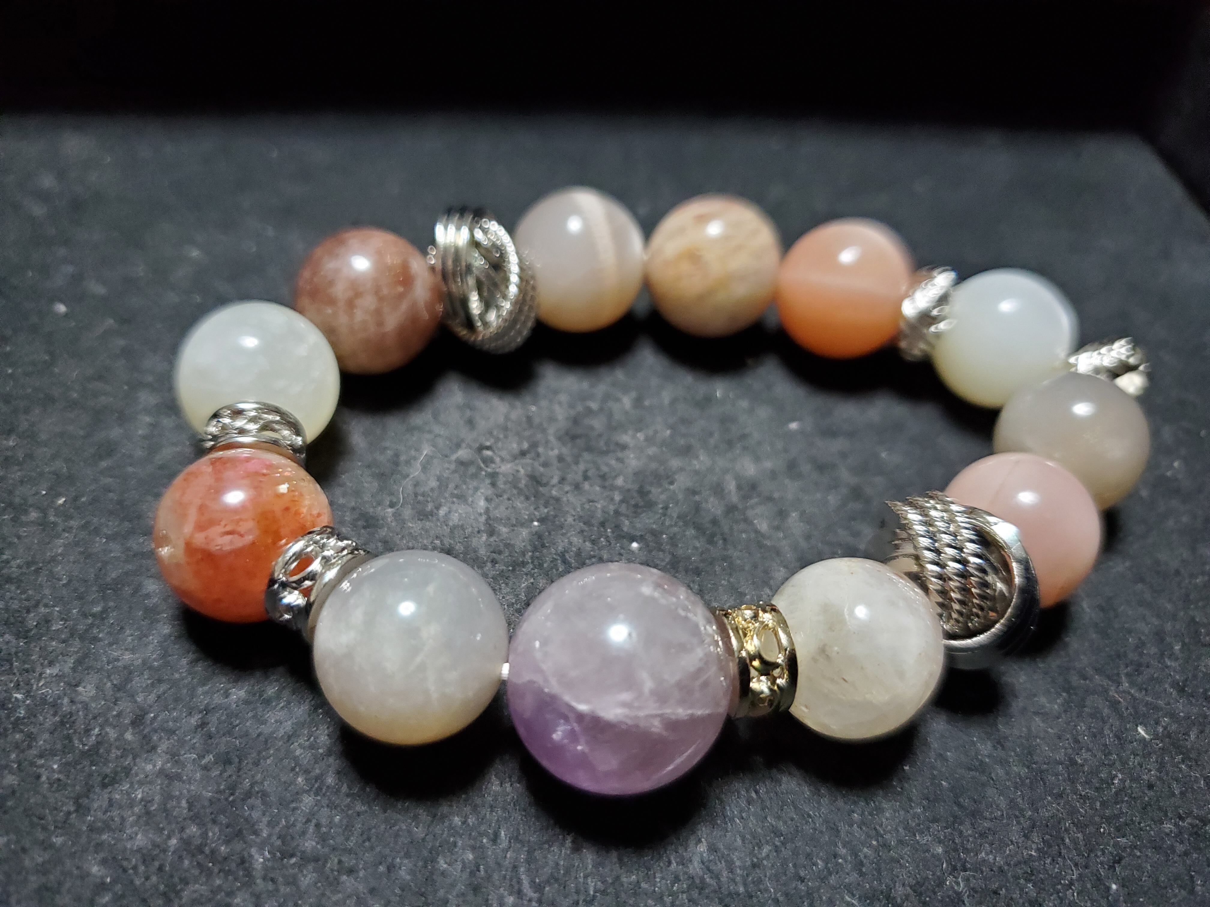 14㎜のミックスムーンストーンをベースにシルバーのロンデル、アクセントに一回り大きい、スーパーセブンを入れています。