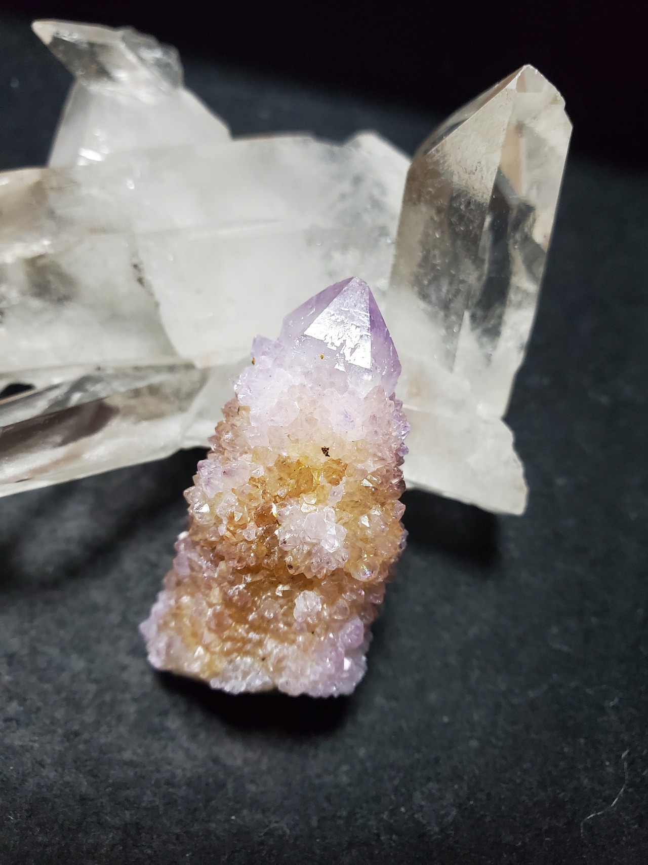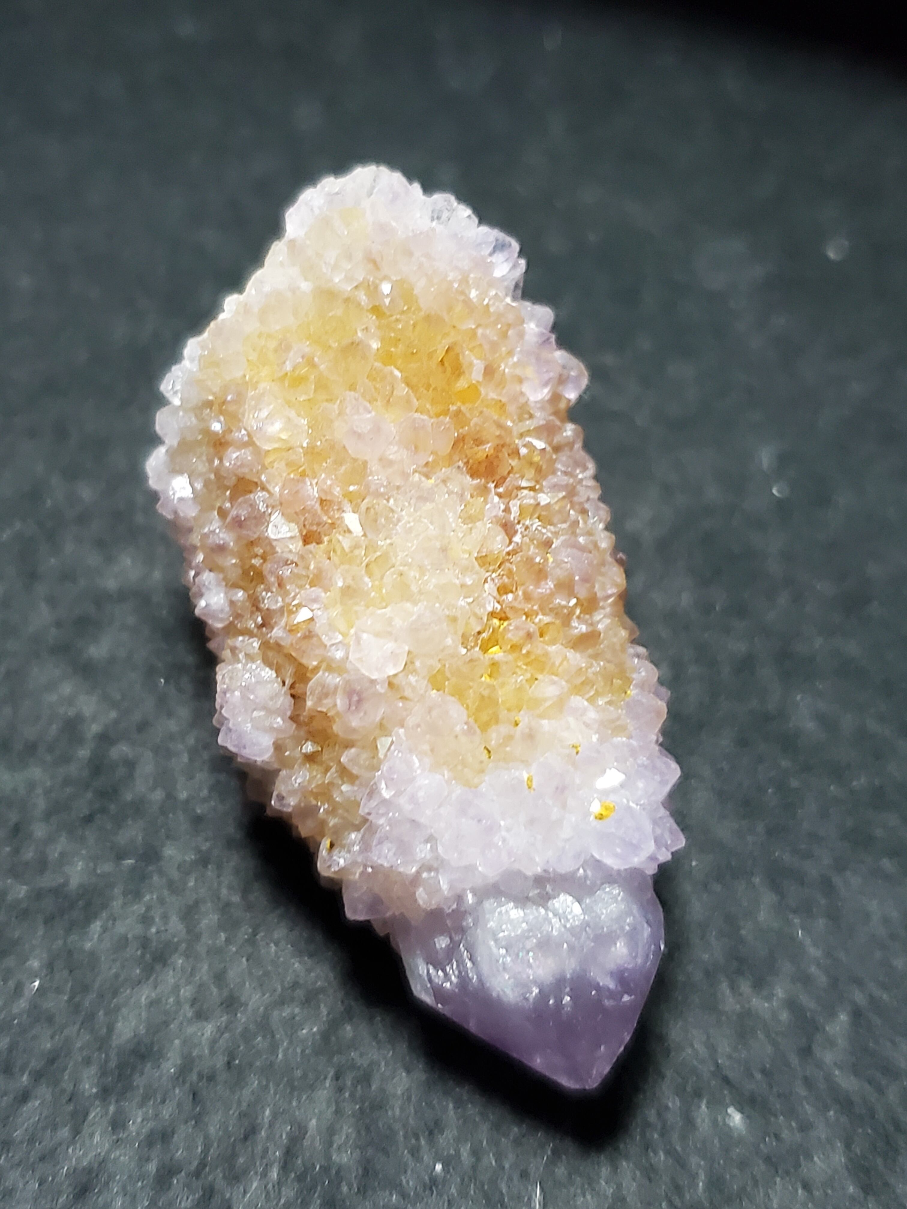 カクタスアメジストは、細かな結晶に包まれるように、先端にポイントが伸びている特徴的なアメジストです。カクタスとは「サボテン」という意味で、見た目がサボテンに似ていることからこの名前がつけられ、サボテン水晶とも言われています。また、古来から精霊の宿る聖なる水晶とも崇められていて、スピリットクォーツとも言われています。細かな淡い結晶で形成されており、光を当てるとキラキラと神秘的な輝きを放ちます。 黄色身を帯びた箇所もあり、スピリチュアルアイテムとしてはもちろん、コレクターの方にもオススメのアメジストです。