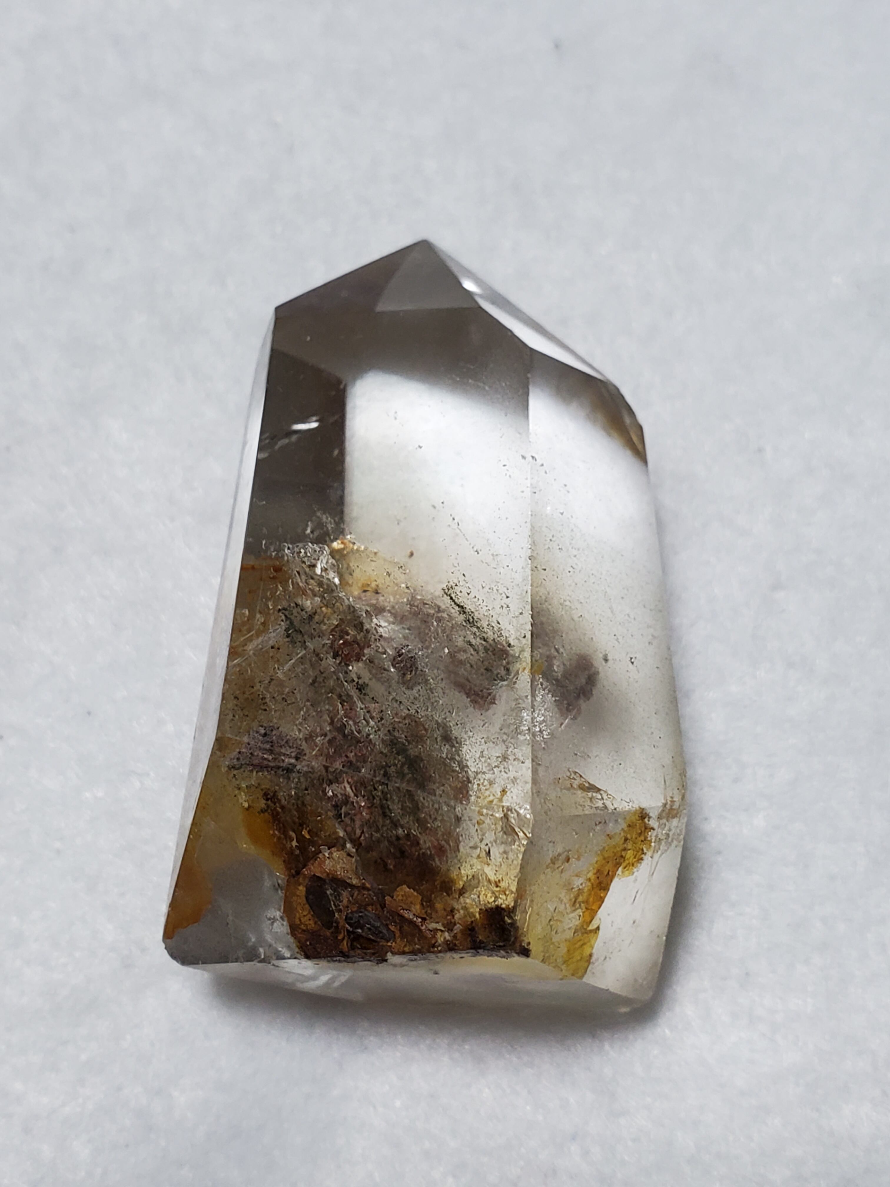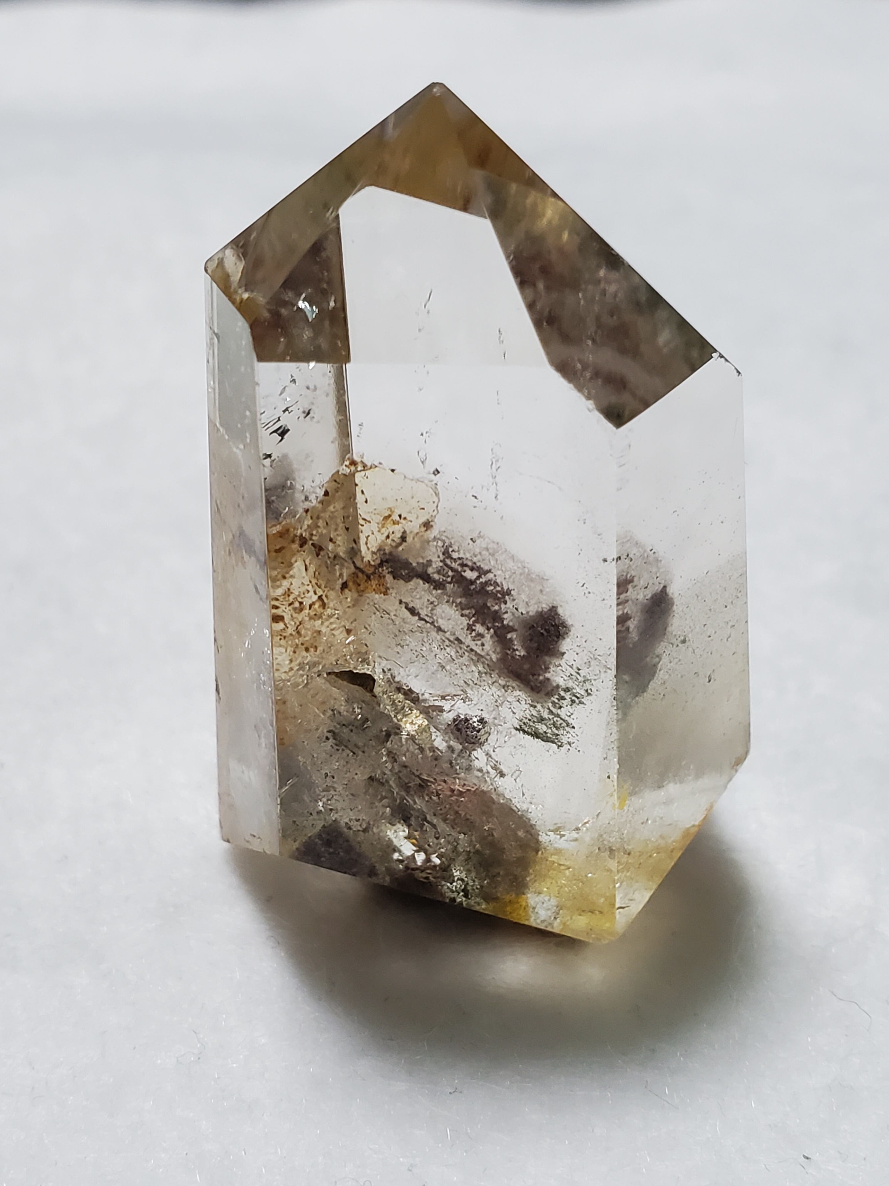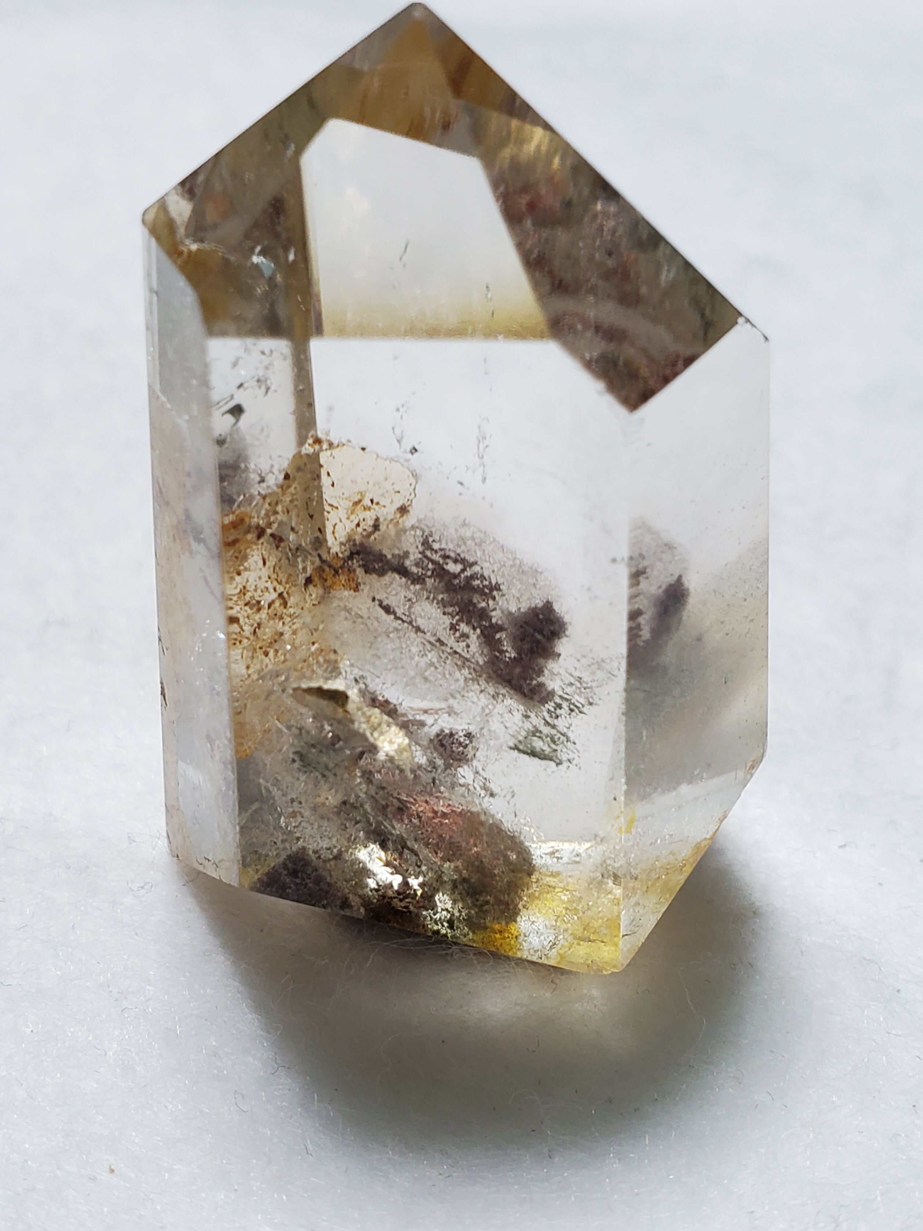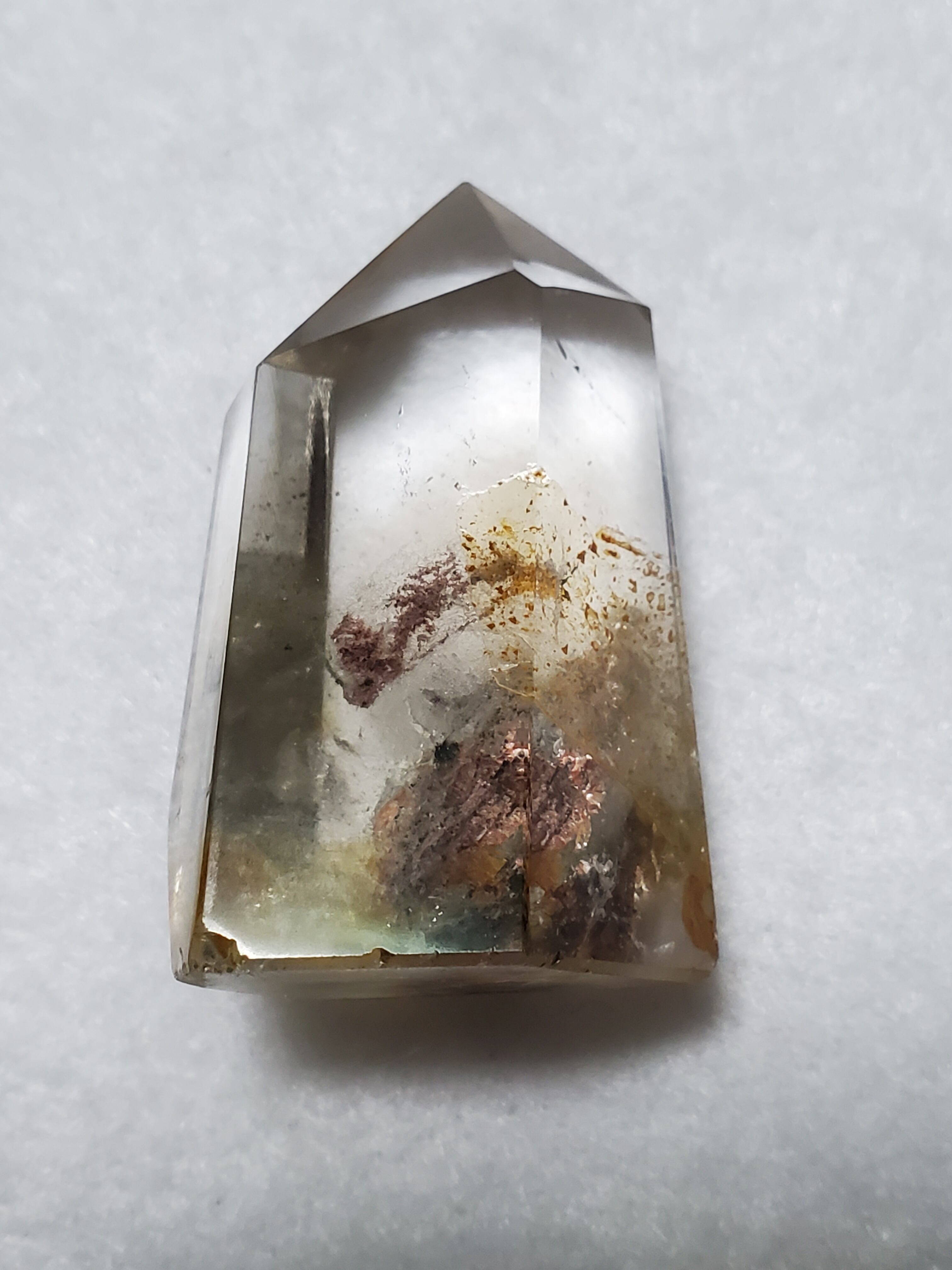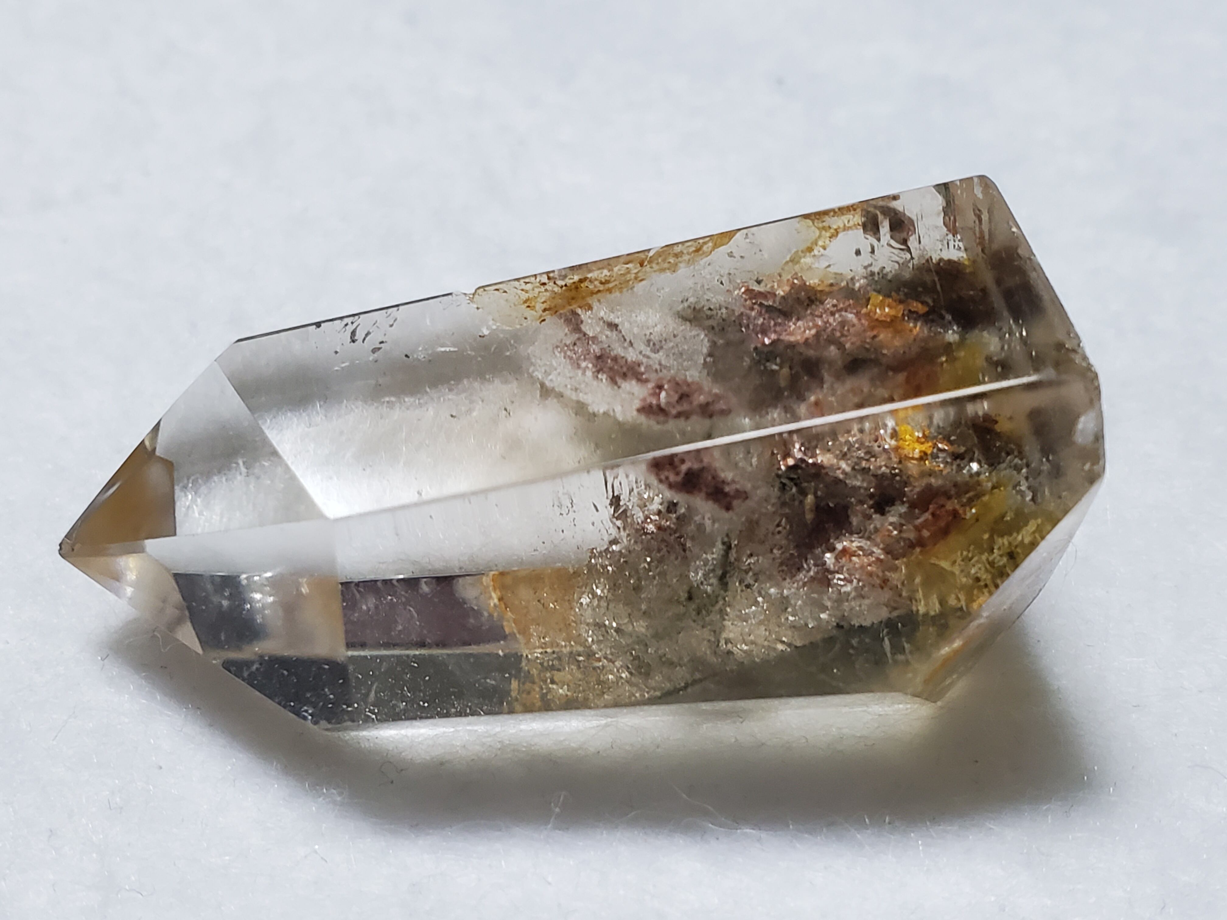 ひとくくりにガーデンクォーツといっても、その表情や種類は様々です。茶色い内包物が含まれるもの、緑色の内包物が含まれるもの、その両方が含まれるもの、さらにファントムが見られるものもあります。ファントムとは、水晶が成長していく過程で地殻変動などのショックが加わり、水晶の成長が一時的に停止した際に、その表面に別の元素が付着し、さらにその後長い年月を経て、水晶が再び成長を始めたために、結晶の中に斜めや三角、山型の像が模様として残る現象を言います。ファントムタイプのガーデンクォーツは、自らの成長の記憶を内部に刻み込んでいるため、持ち主の潜在能力を引き出し、成長を促してくれると伝えられています。
