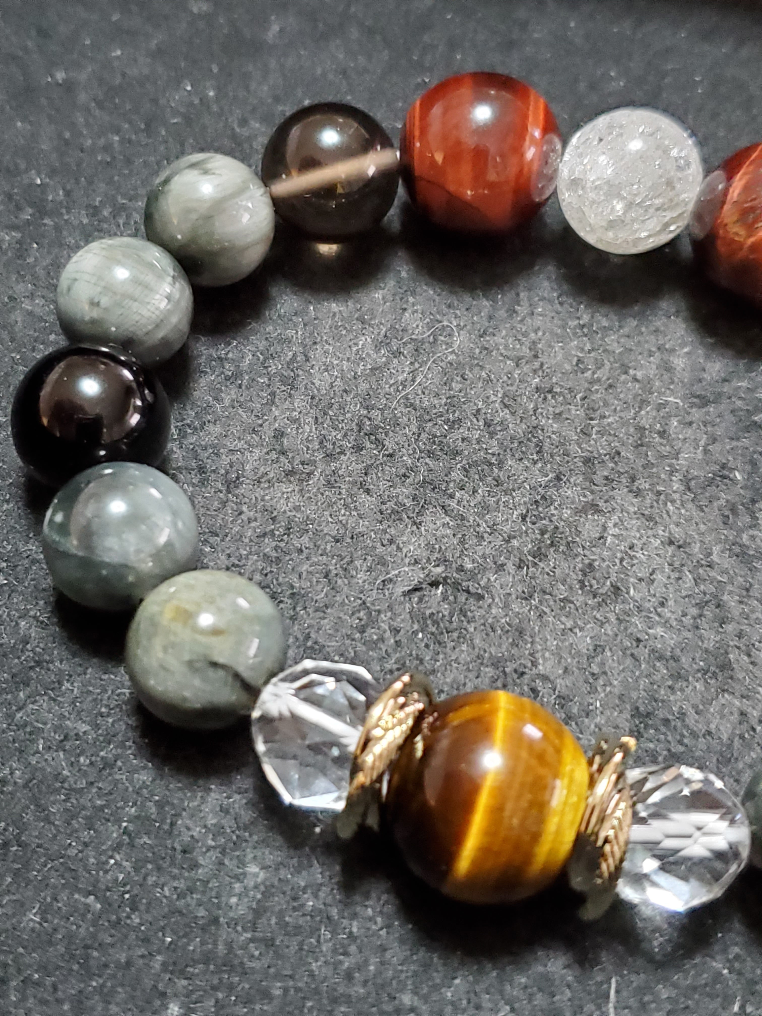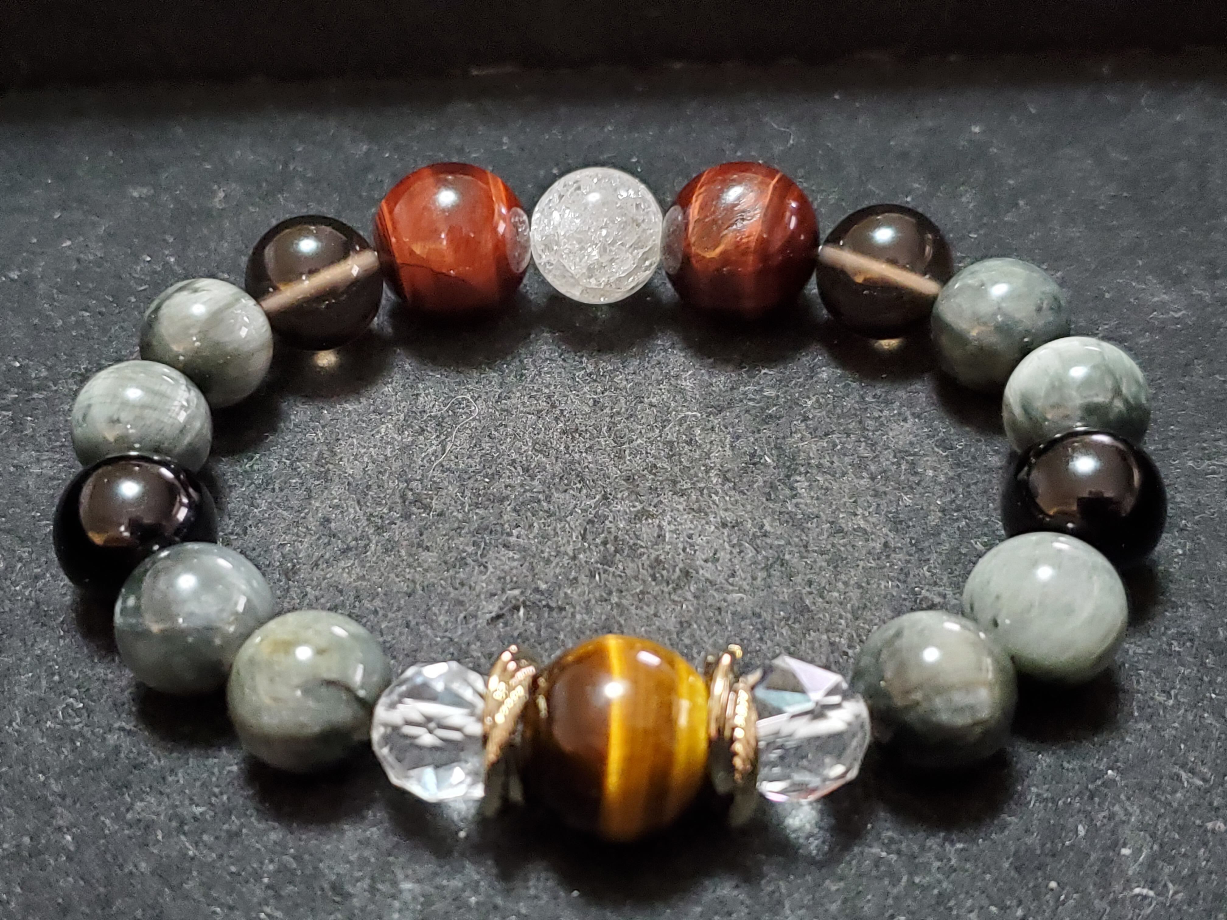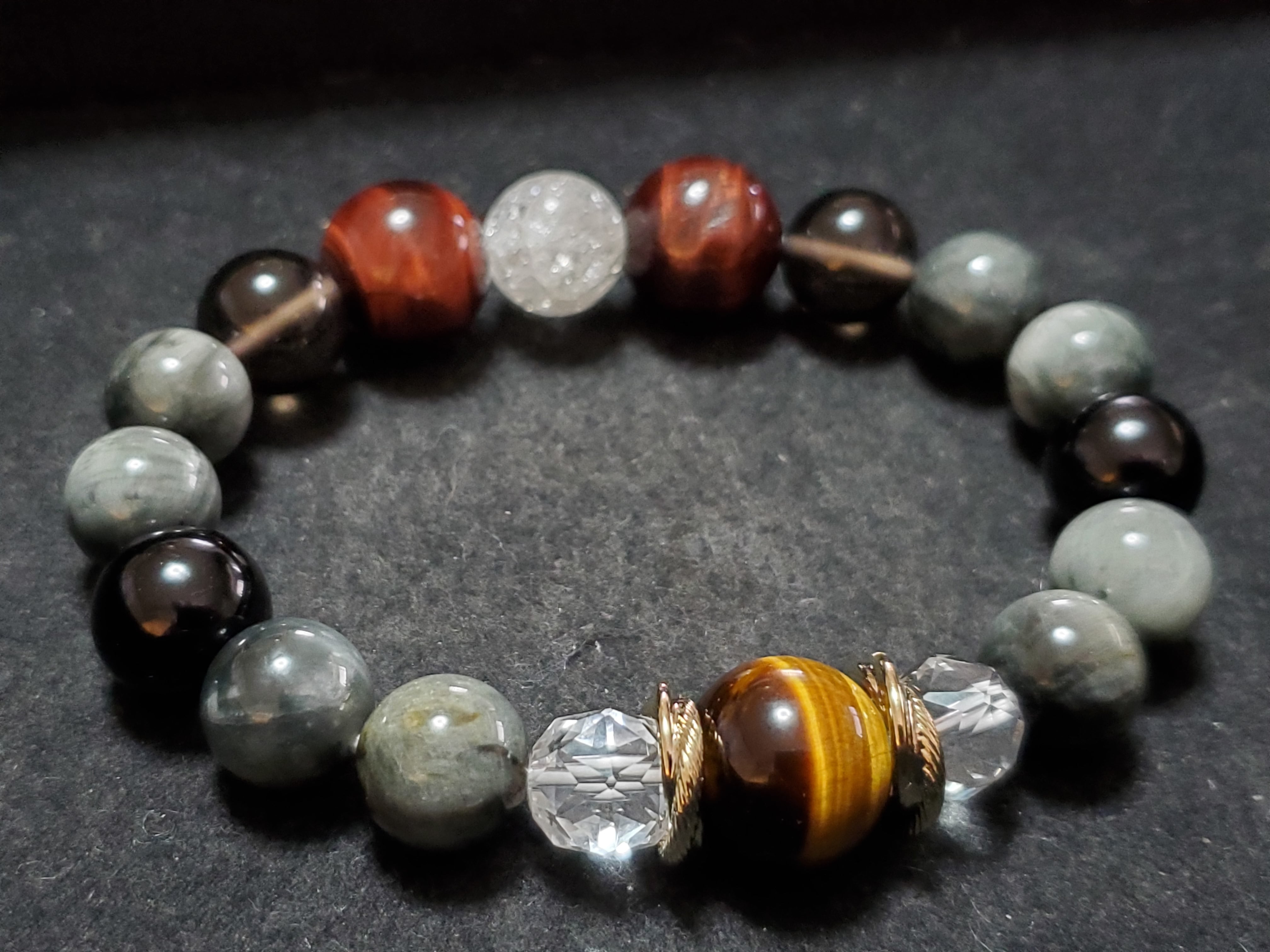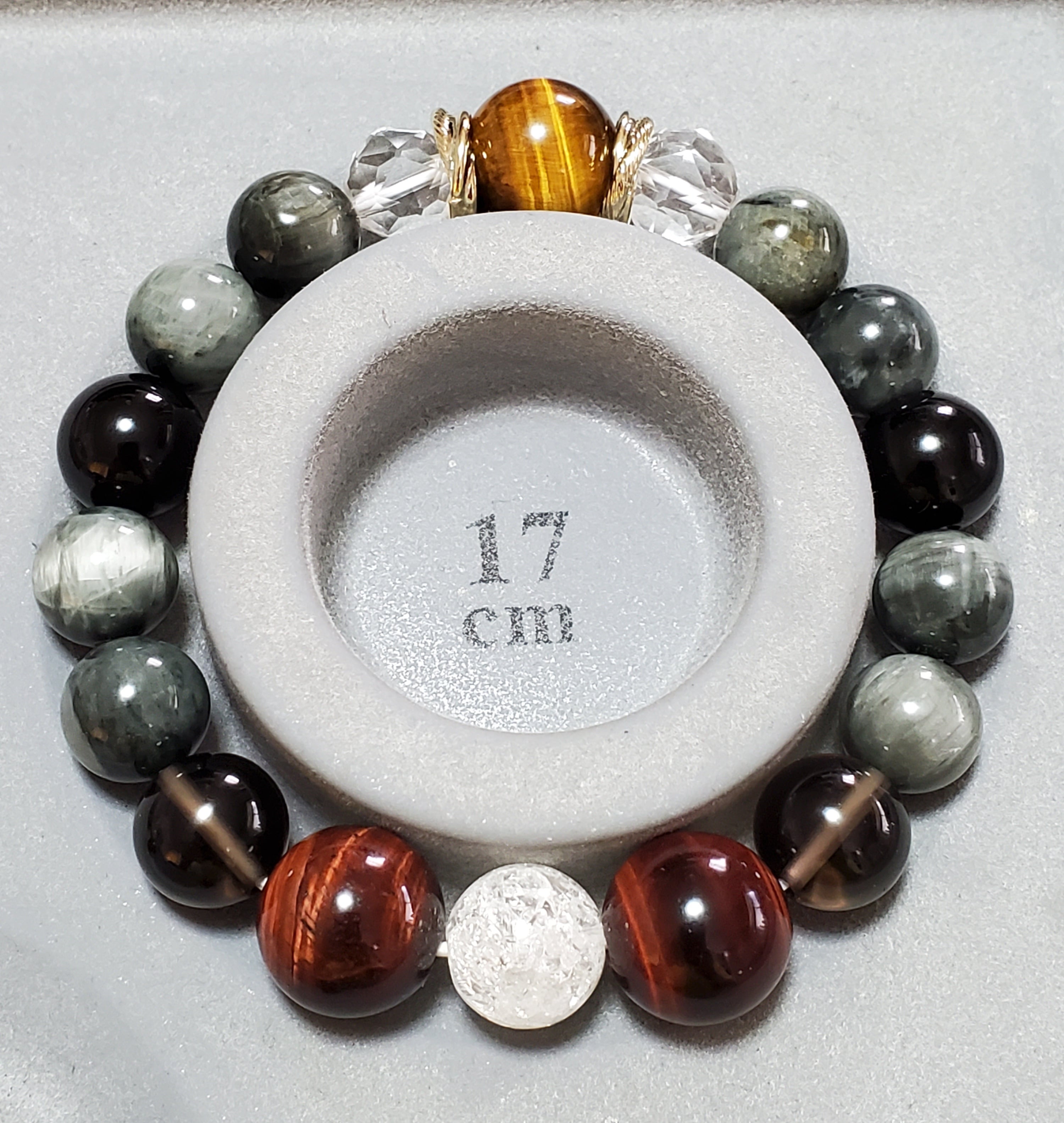 グラウンディング(大地に根を張るように、接地している体の部分を床などにしっかりつけること。または、大地とのつながりを持つこと。)の意味合いのスモーキークォーツ(茶水晶)、持ち主の意思を強く、正しい判断力を与えてくれ、邪気、魔除けのオニキスで組み上げてます。