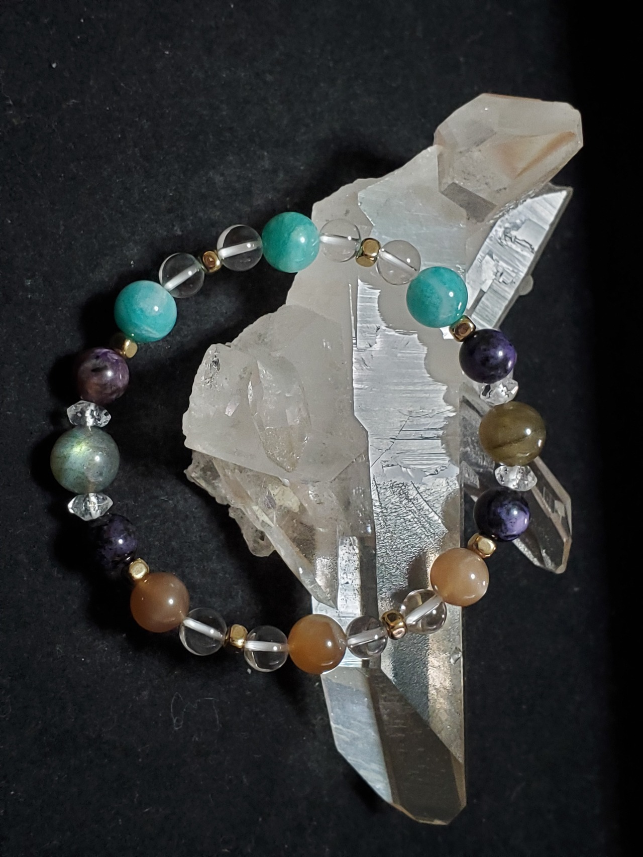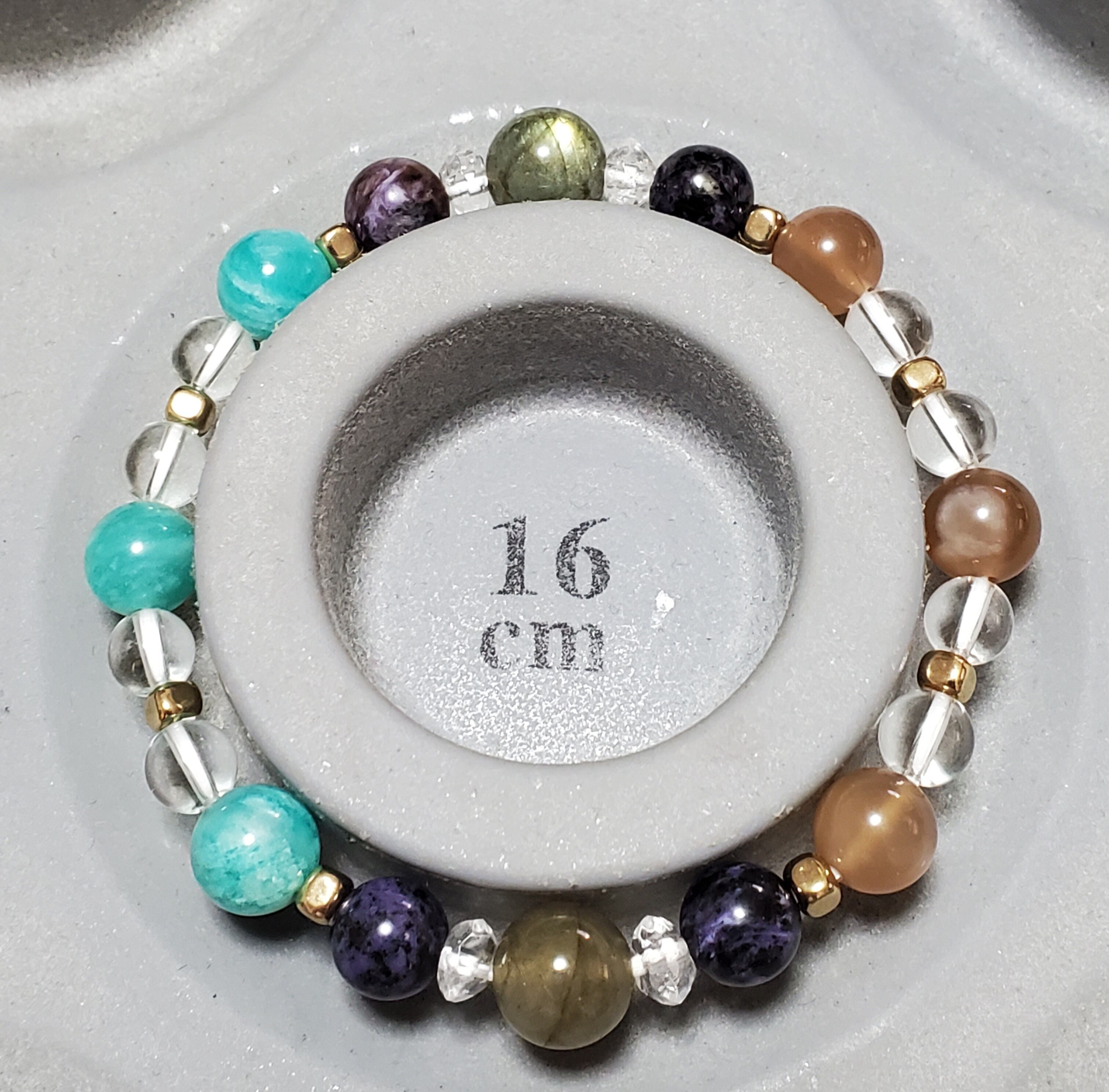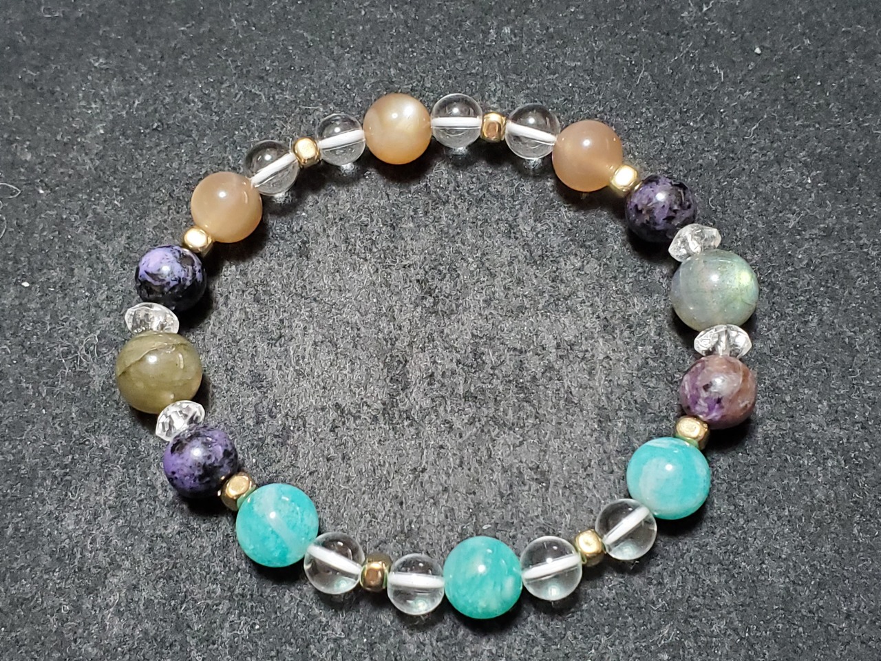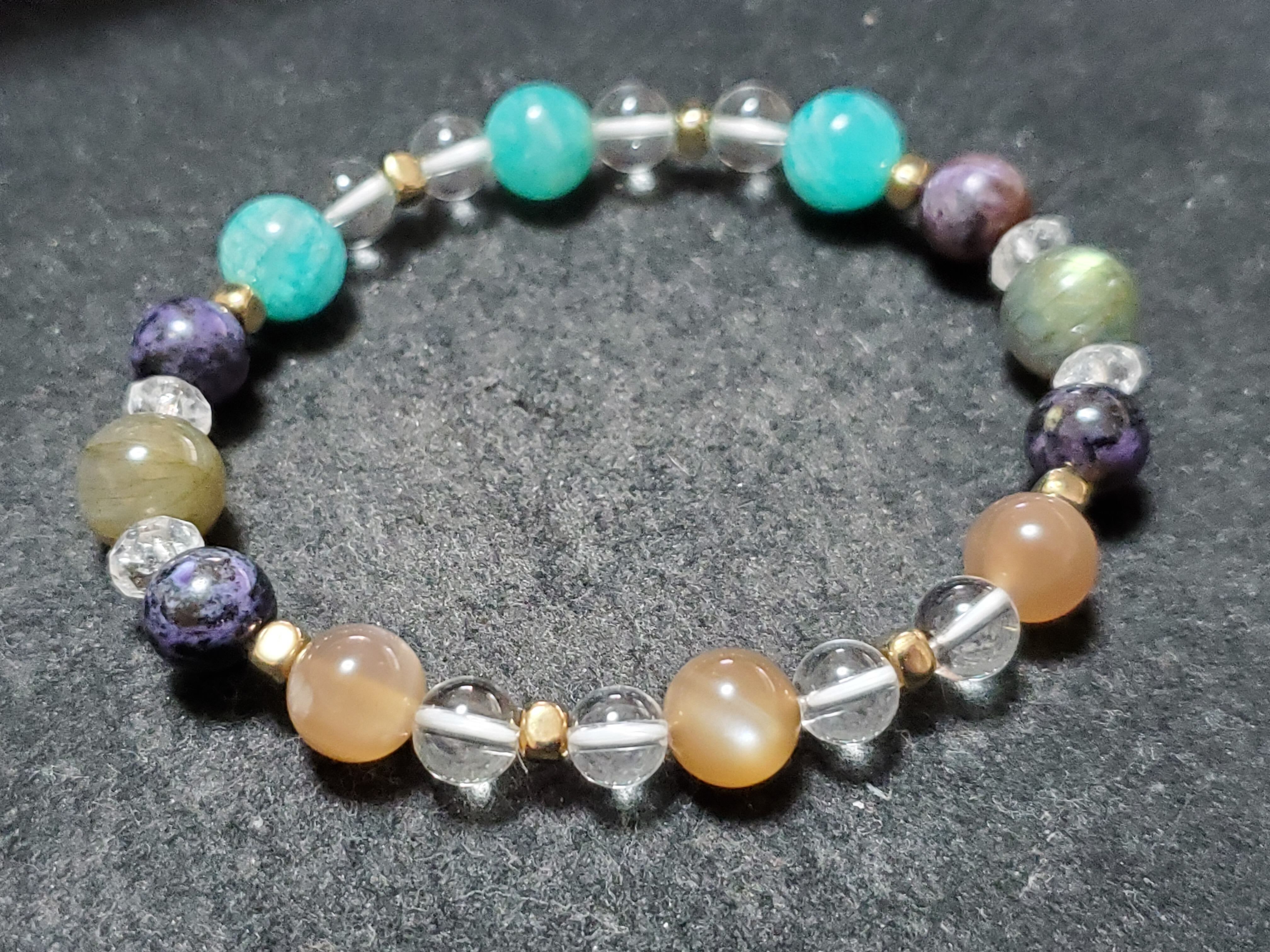 月を象徴するラブラドライト、オレンジムーンストーン、そして希望の石と言われるアマゾナイトを組み合わせました。