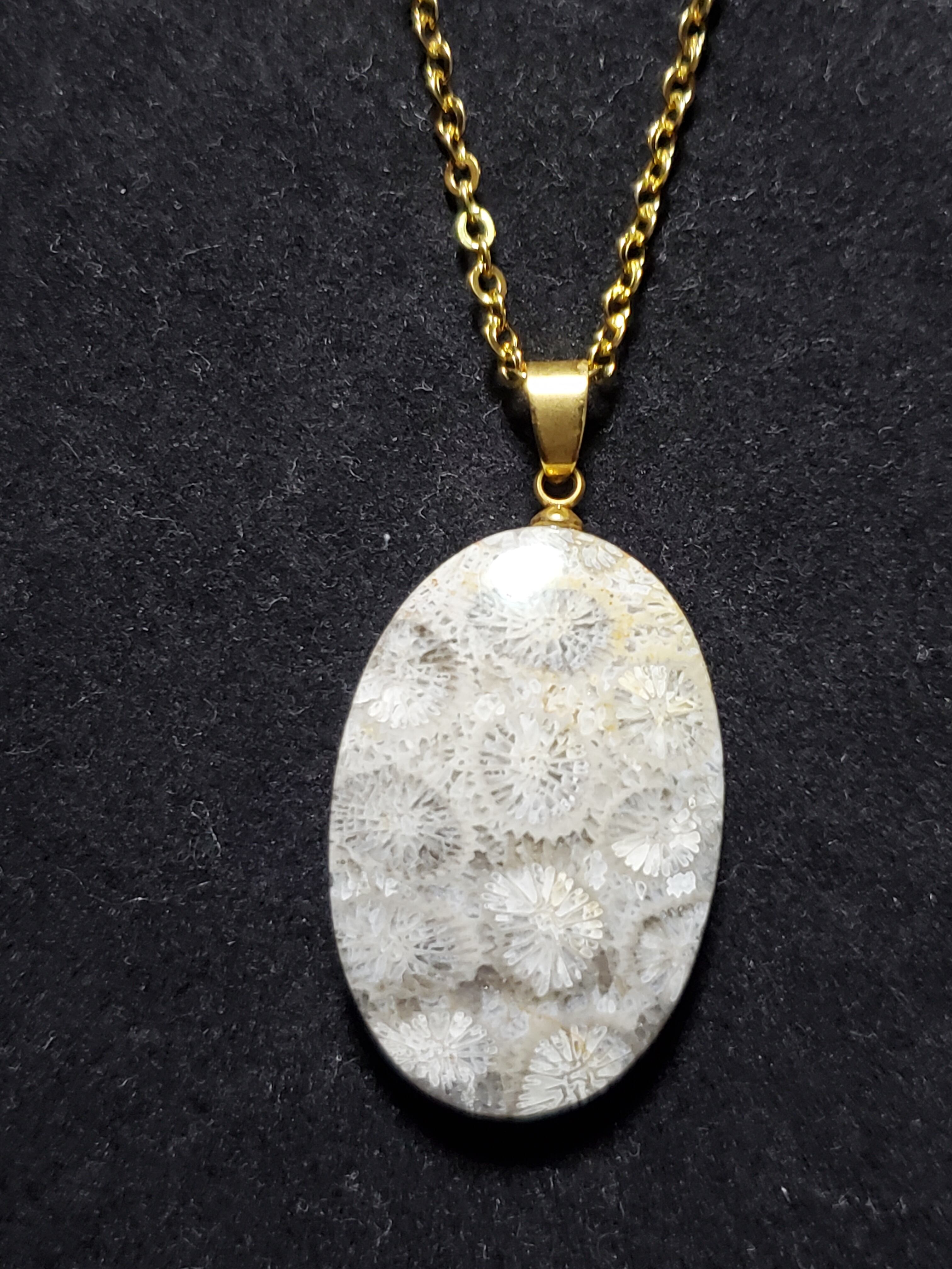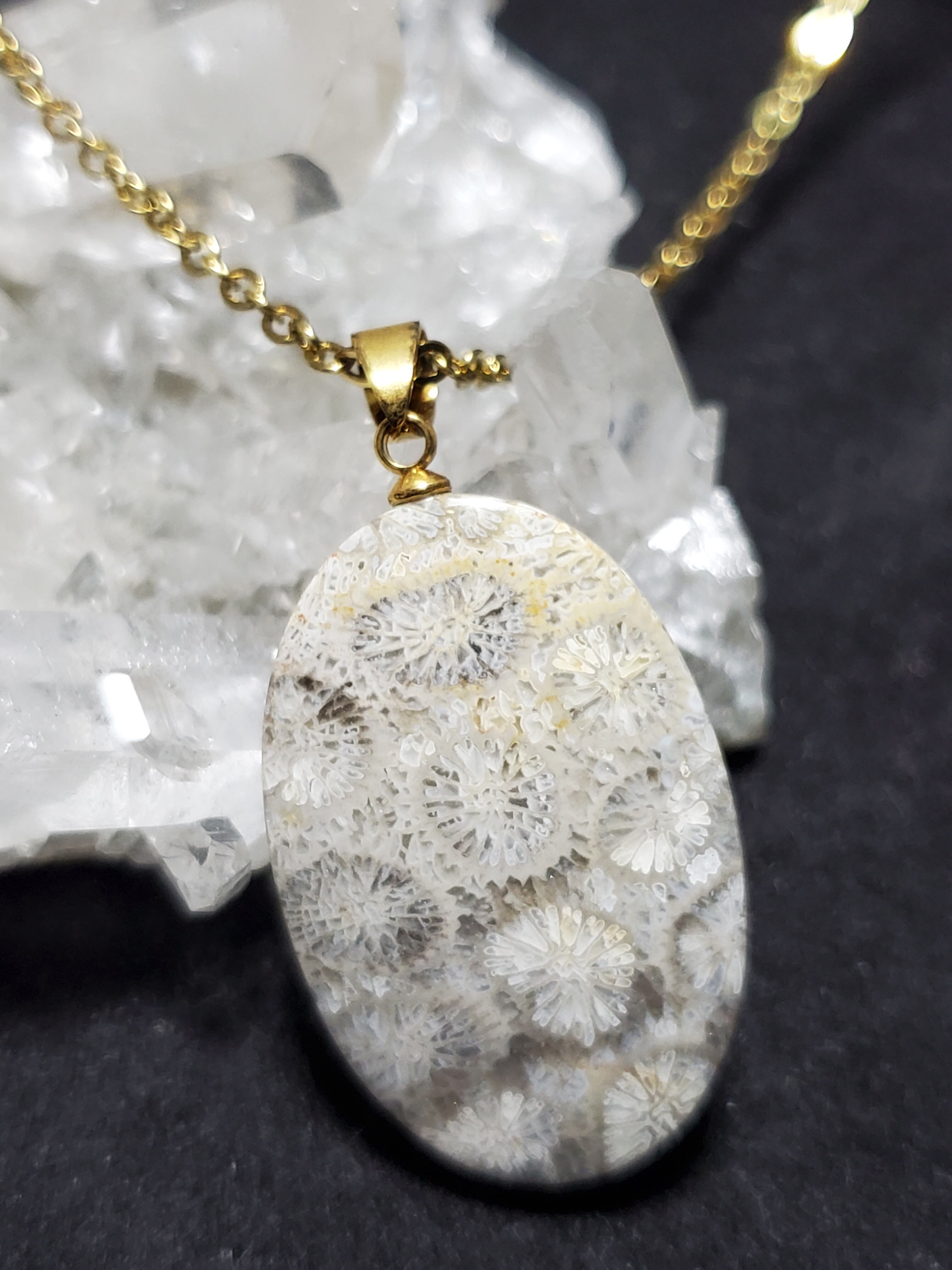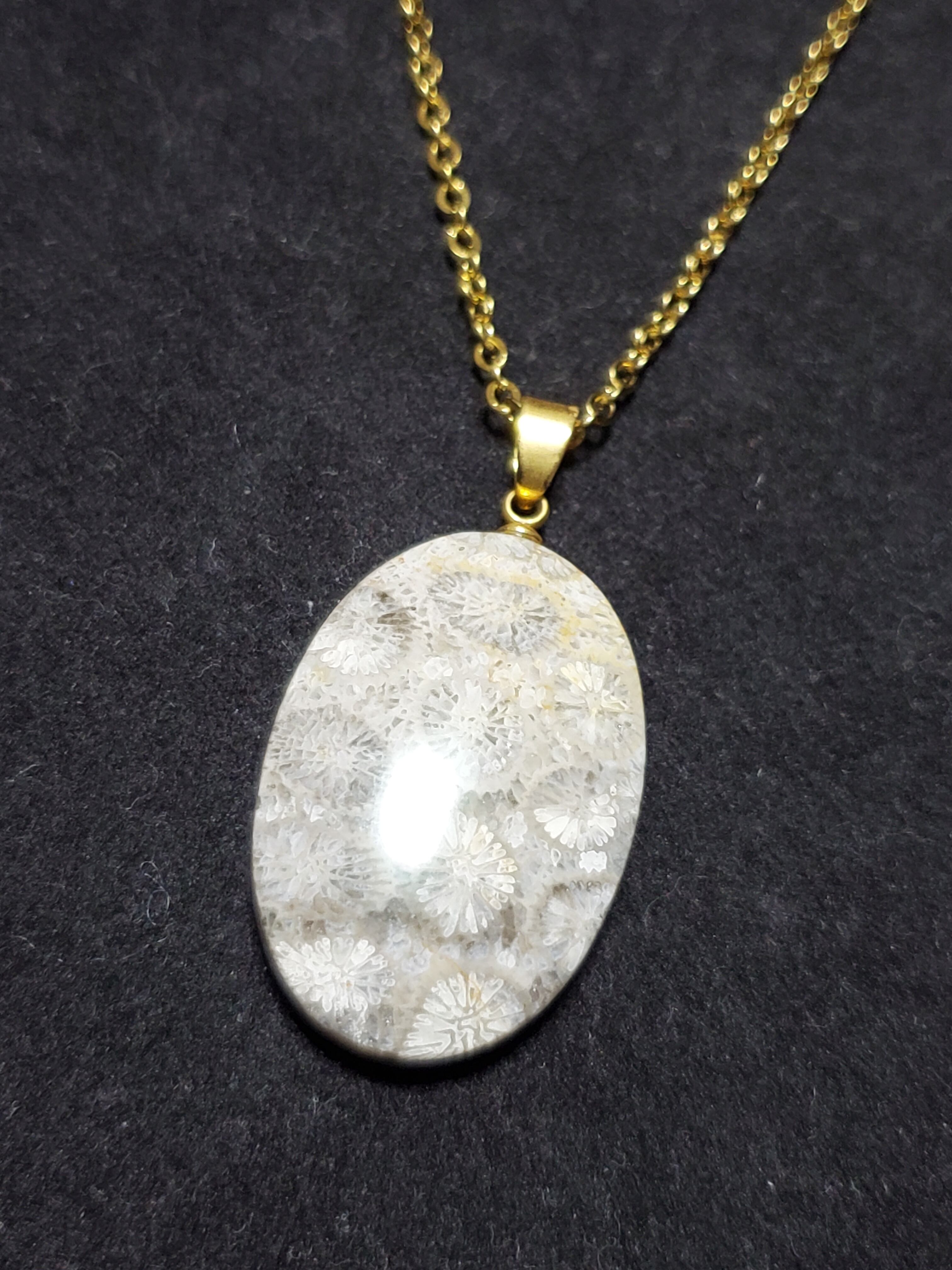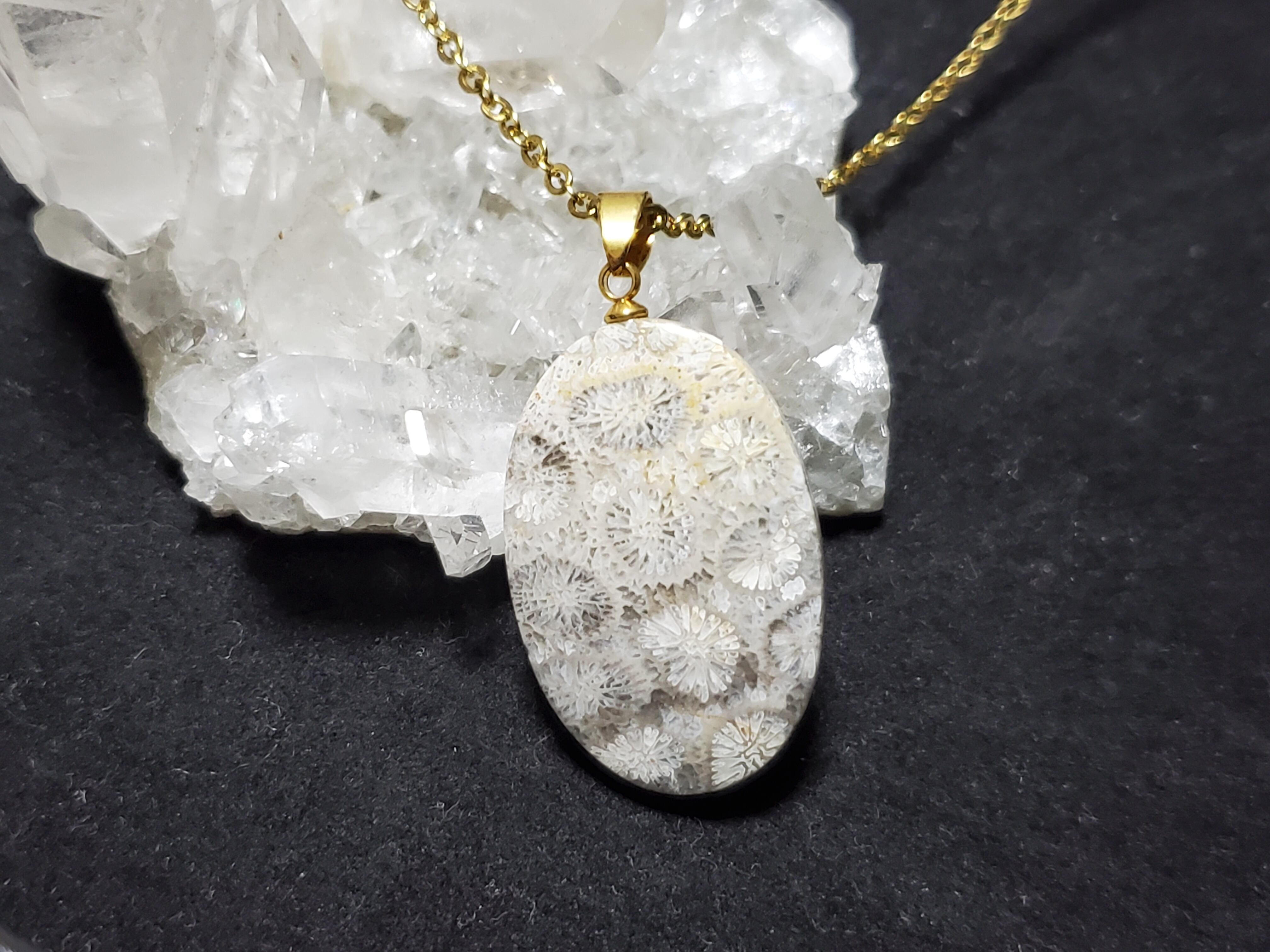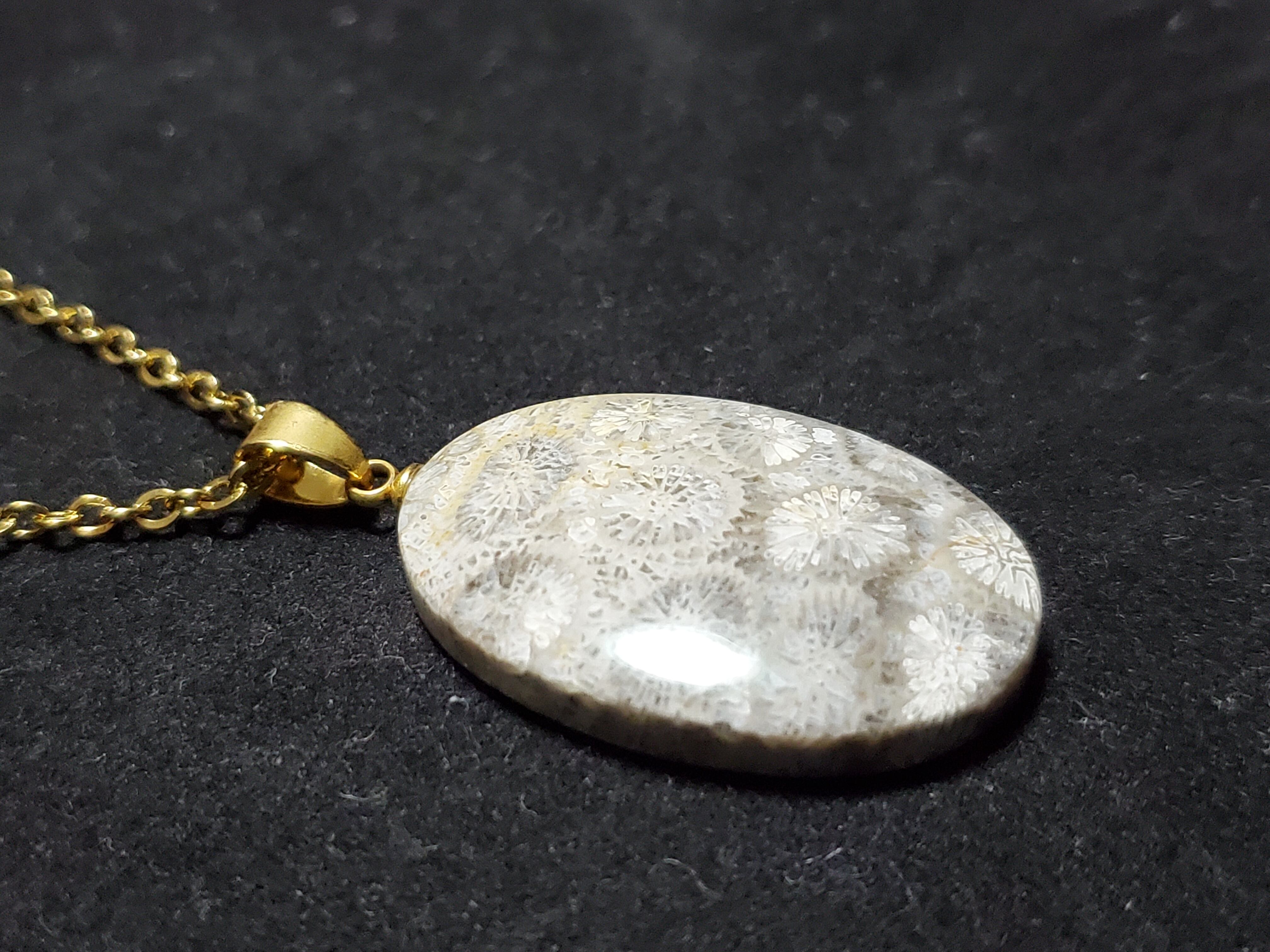 フォッシルコーラルは幸福や長寿など珊瑚と同じ意味を持ち、生命の源である海の力を存分に秘めた石です。