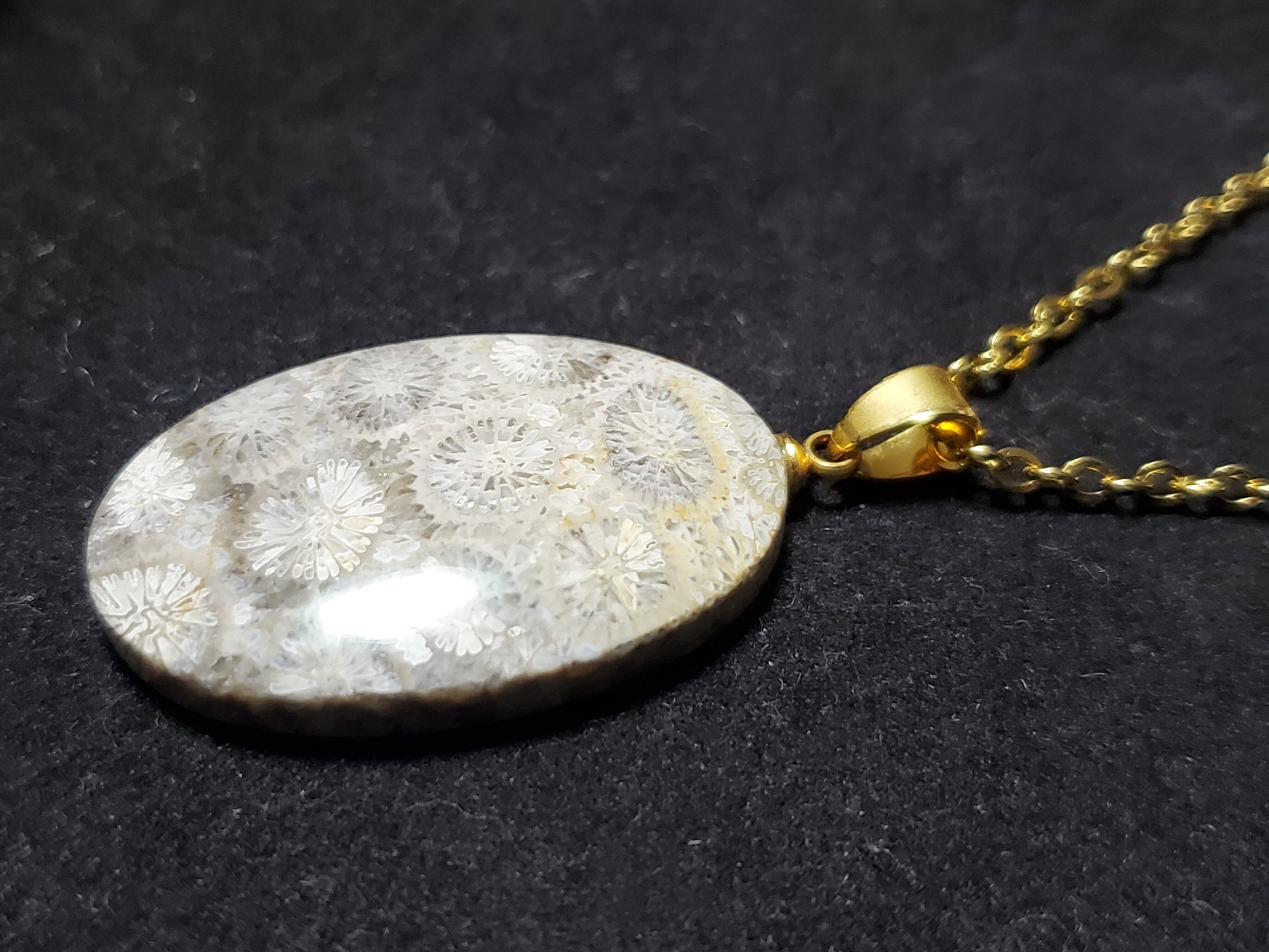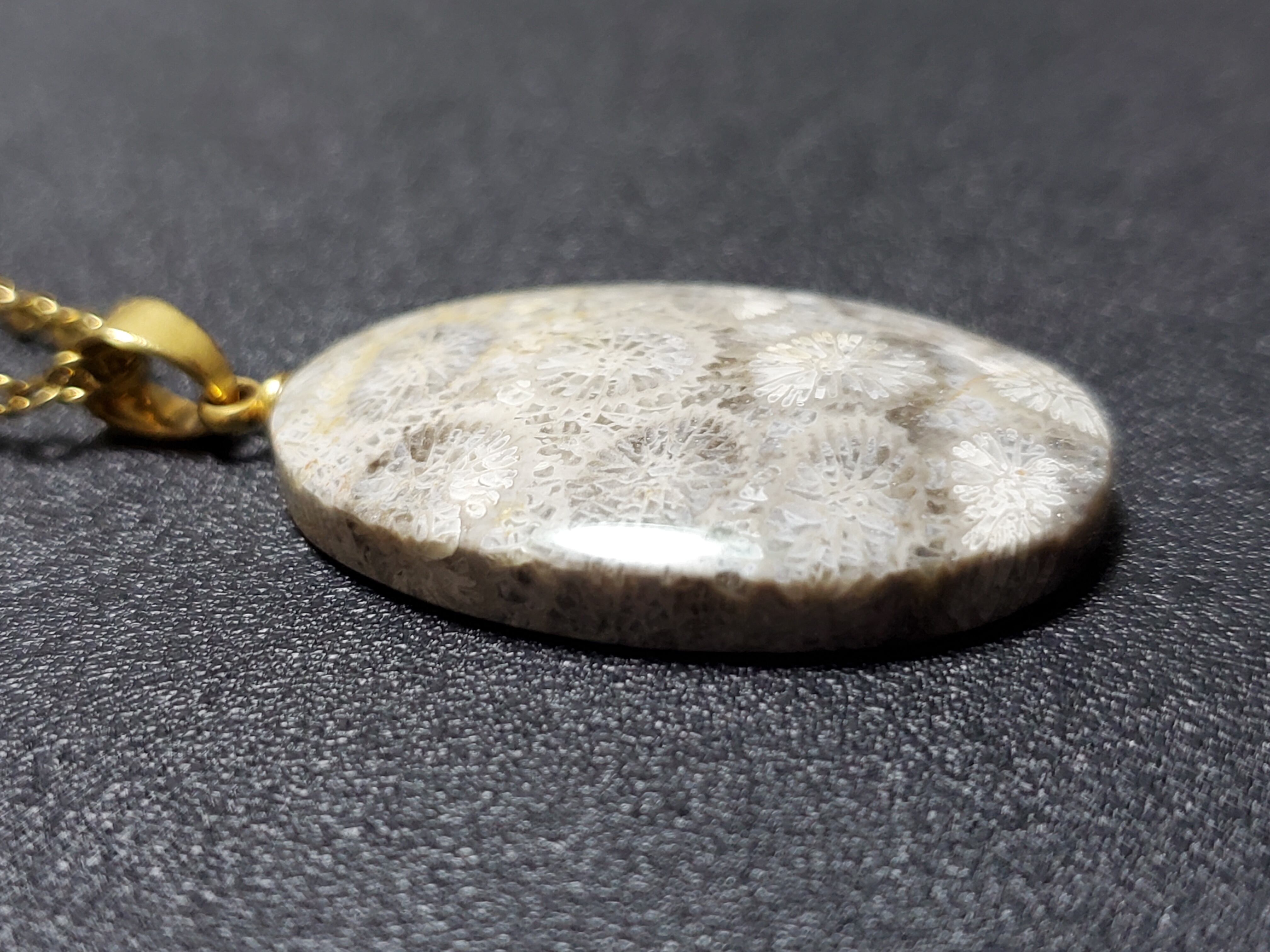 フォッシルコーラルは古代の珊瑚にクォーツが浸透し、約2億6千万前に生存していた群体四射サンゴの化石で、長い長い歳月をかけて瑪瑙化したものになります。
