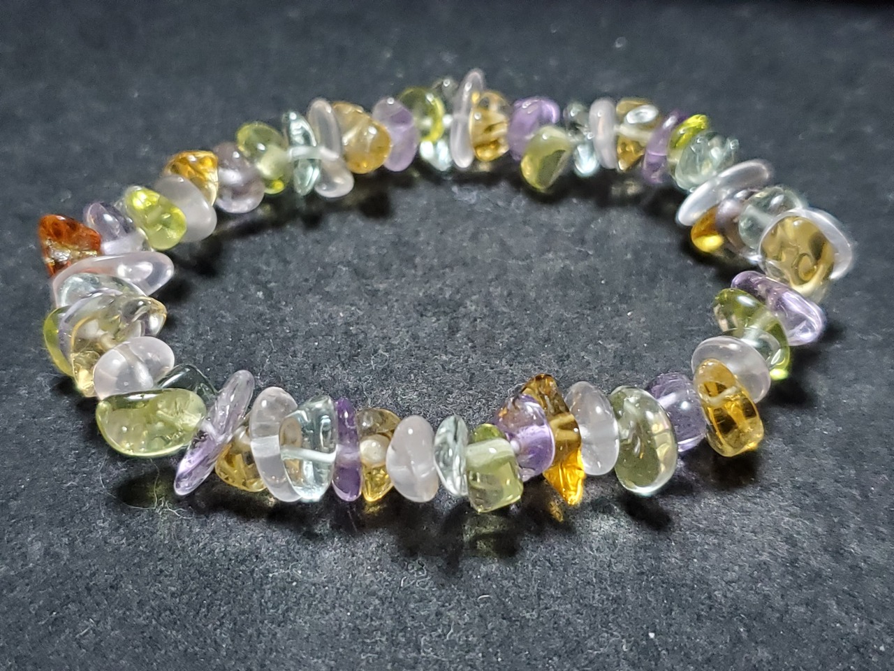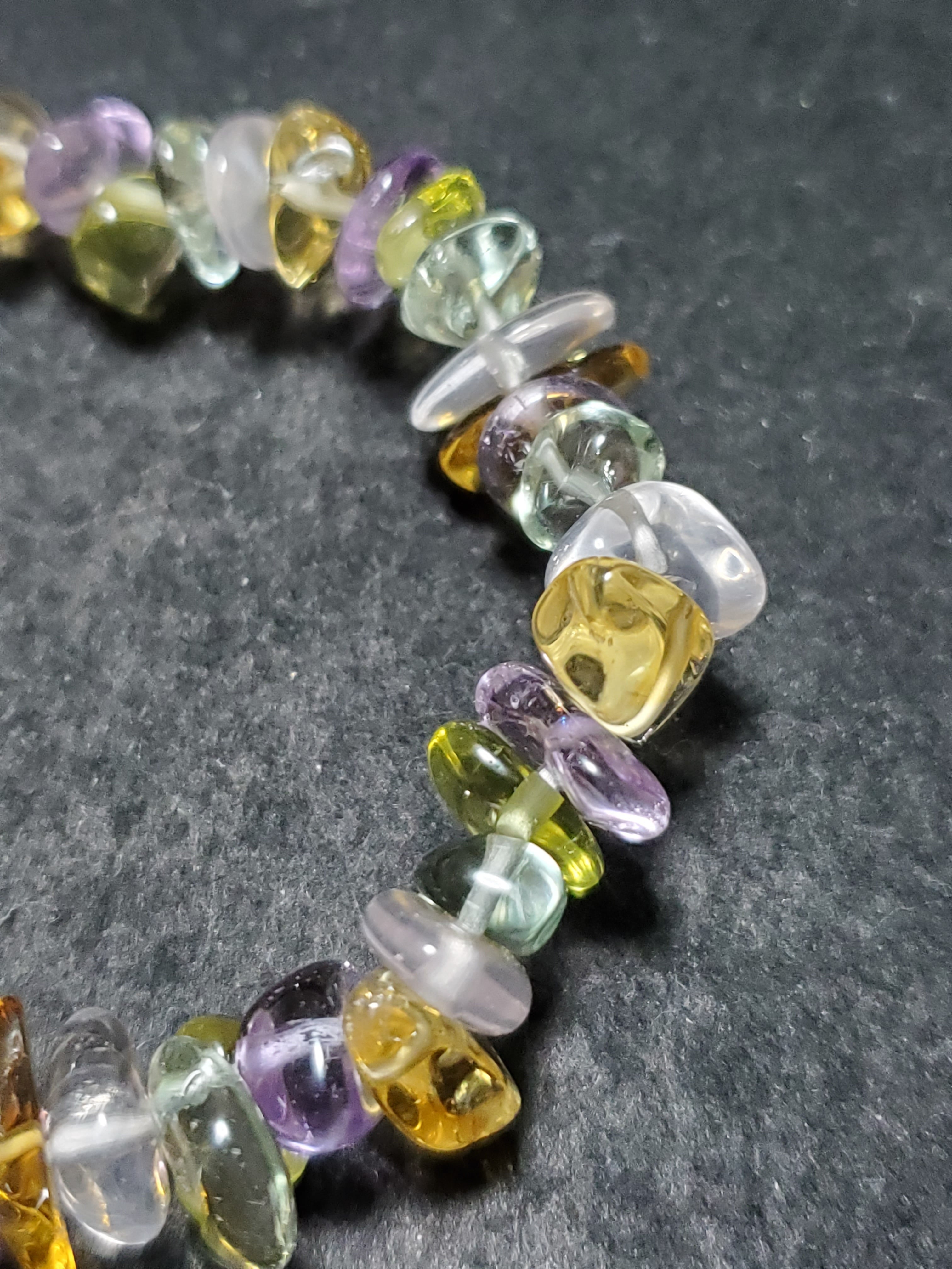 アメジスト、プラジオライト(グリーンアメジスト)、ローズクォーツ、シトリンなどの組み合わせのブレスレットです。