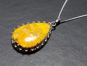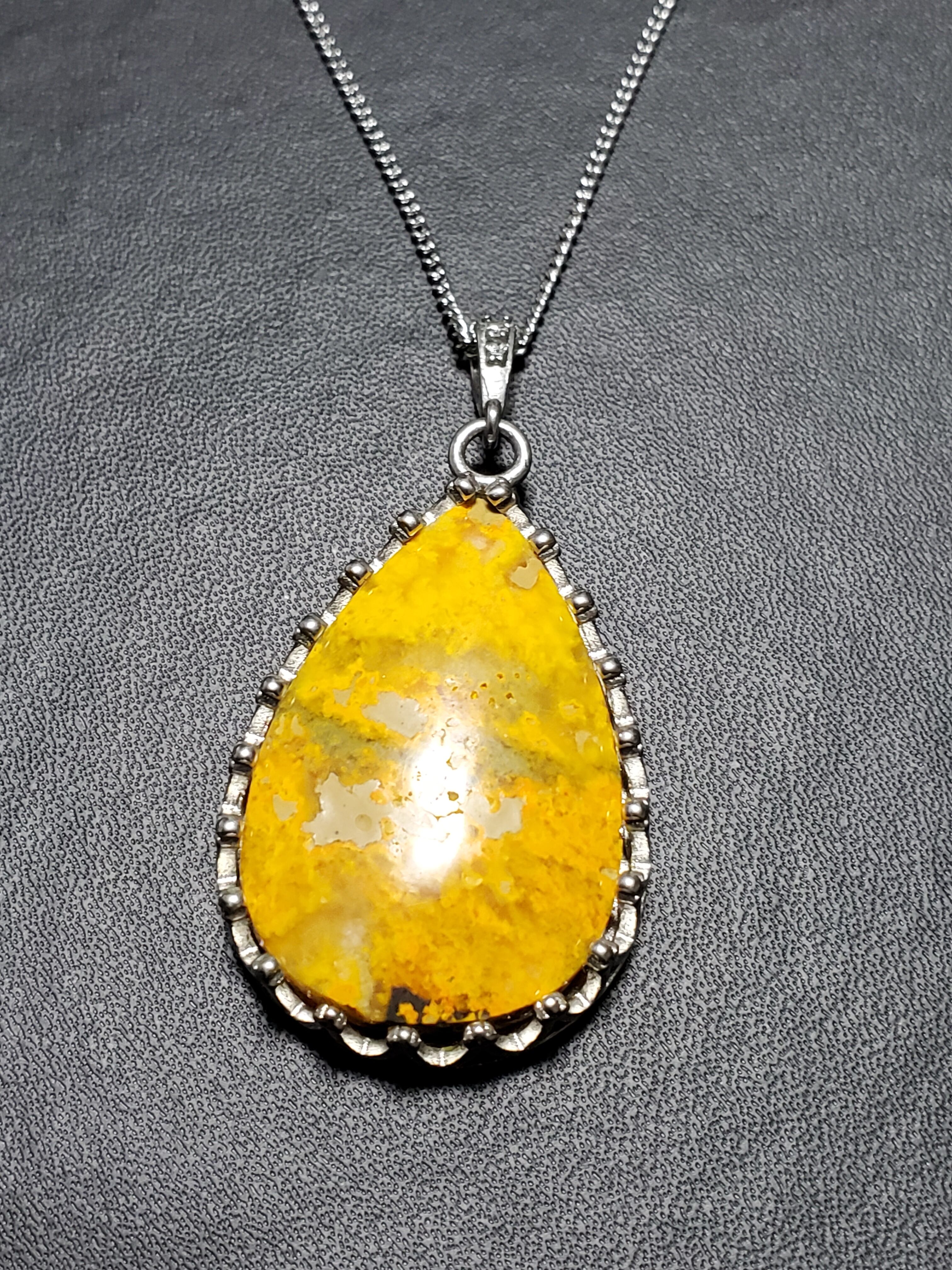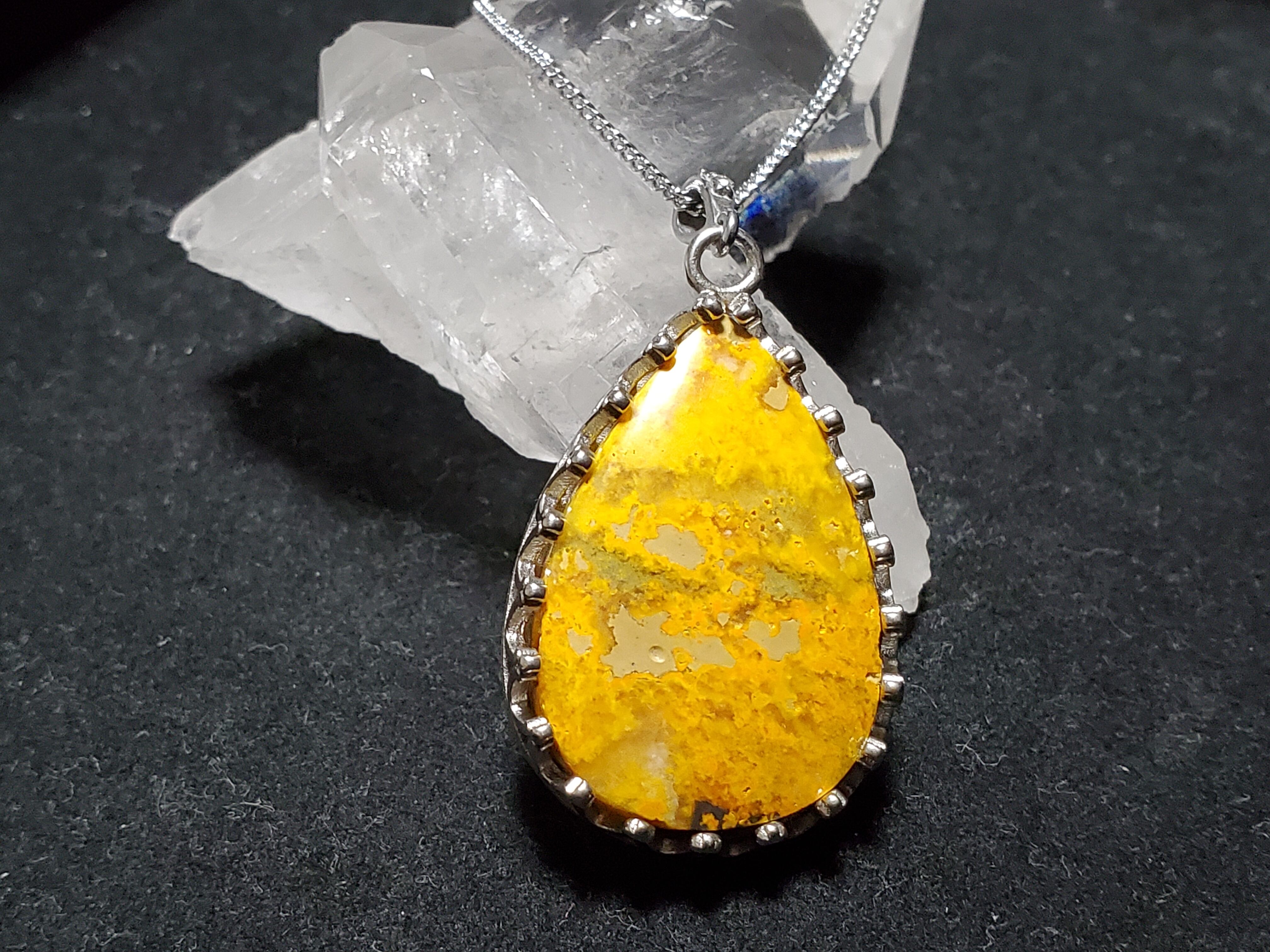 バンブルビージャスパーの鮮やかな黄色は硫黄によるもので、他にも石英、硬石膏、イルメナイトなど様々な鉱物から成る天然石です。