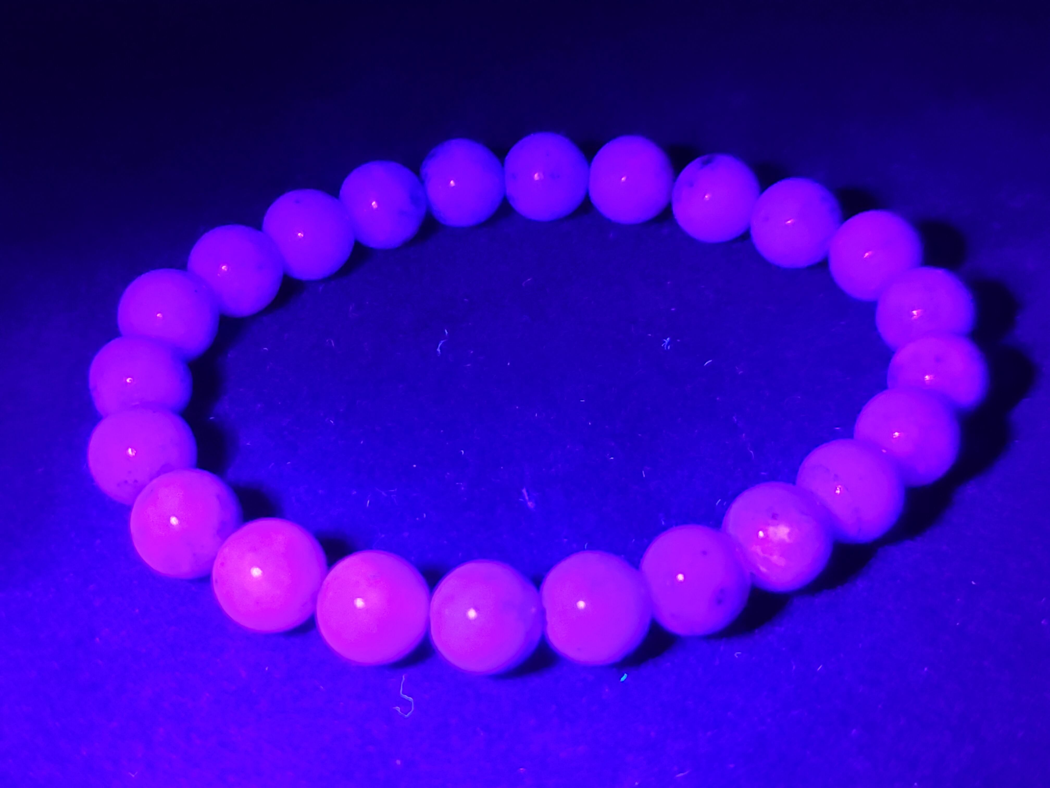 ハックマナイトはソーダライトの変種で、ブラックライトなどで紫外線を当てると色が変色して濃くなり、時間が経過すると元の色に戻るという希少な石です。