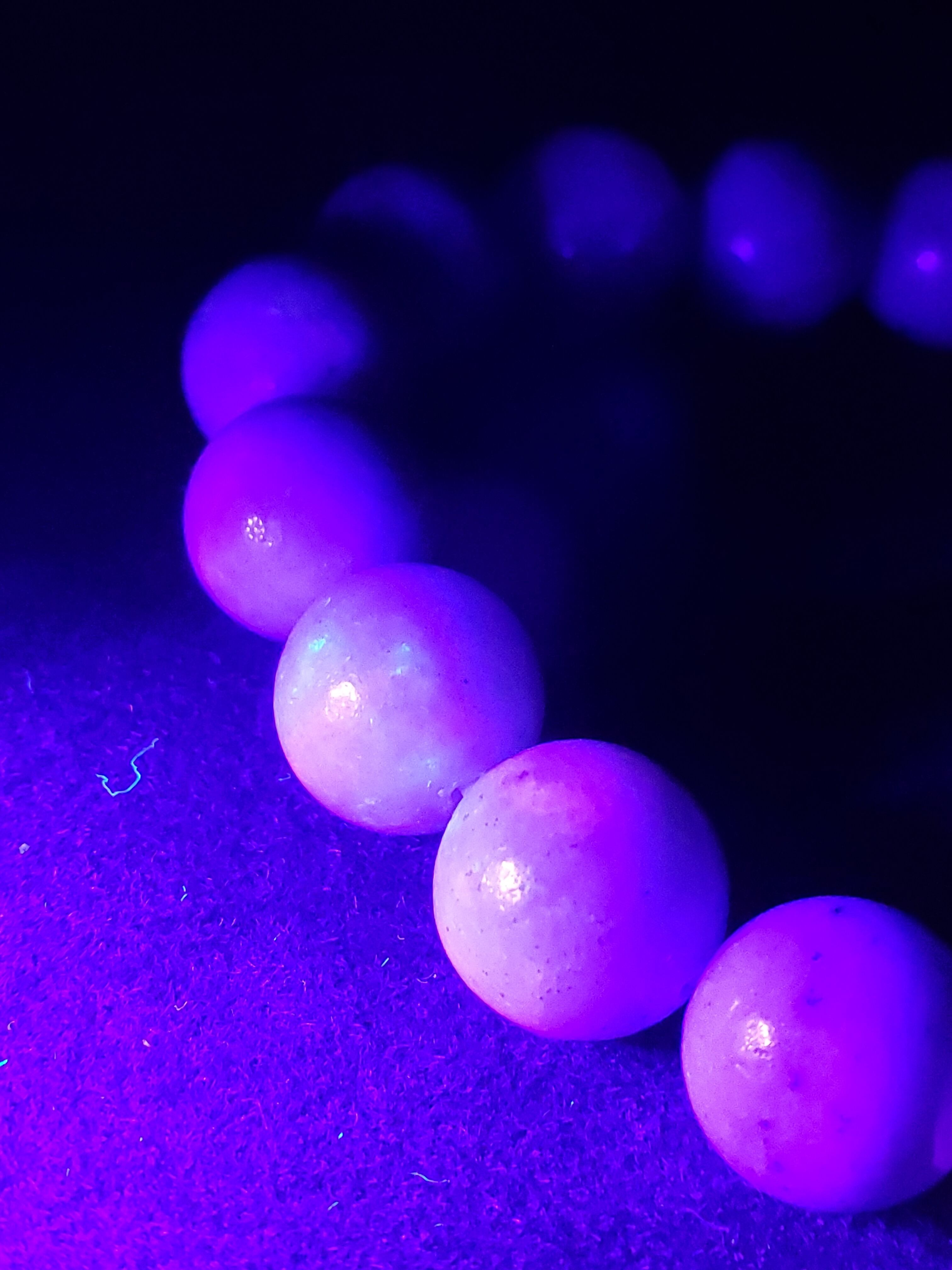 ハックマナイトはソーダライトの変種で、ブラックライトなどで紫外線を当てると色が変色して濃くなり、時間が経過すると元の色に戻るという希少な石です。