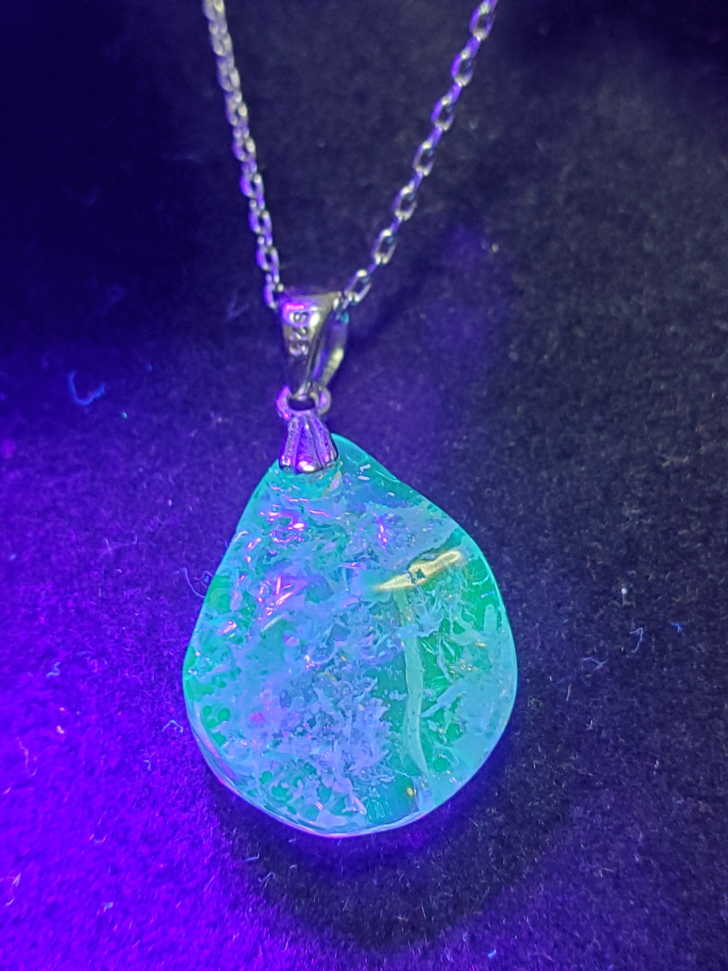 オパールの一種で、母岩の上に水滴が付いた様に、微細な球状シリカの集合した物で、その見た目から玉滴石と呼ばれています。結晶に微量のウランを含んでいる為、紫外線長波で強くウラン特有の黄緑色に蛍光します。弱いUVライトでも光るので見て楽しめる標本です。ハイアライトは直感力を高める効果があると言われています。